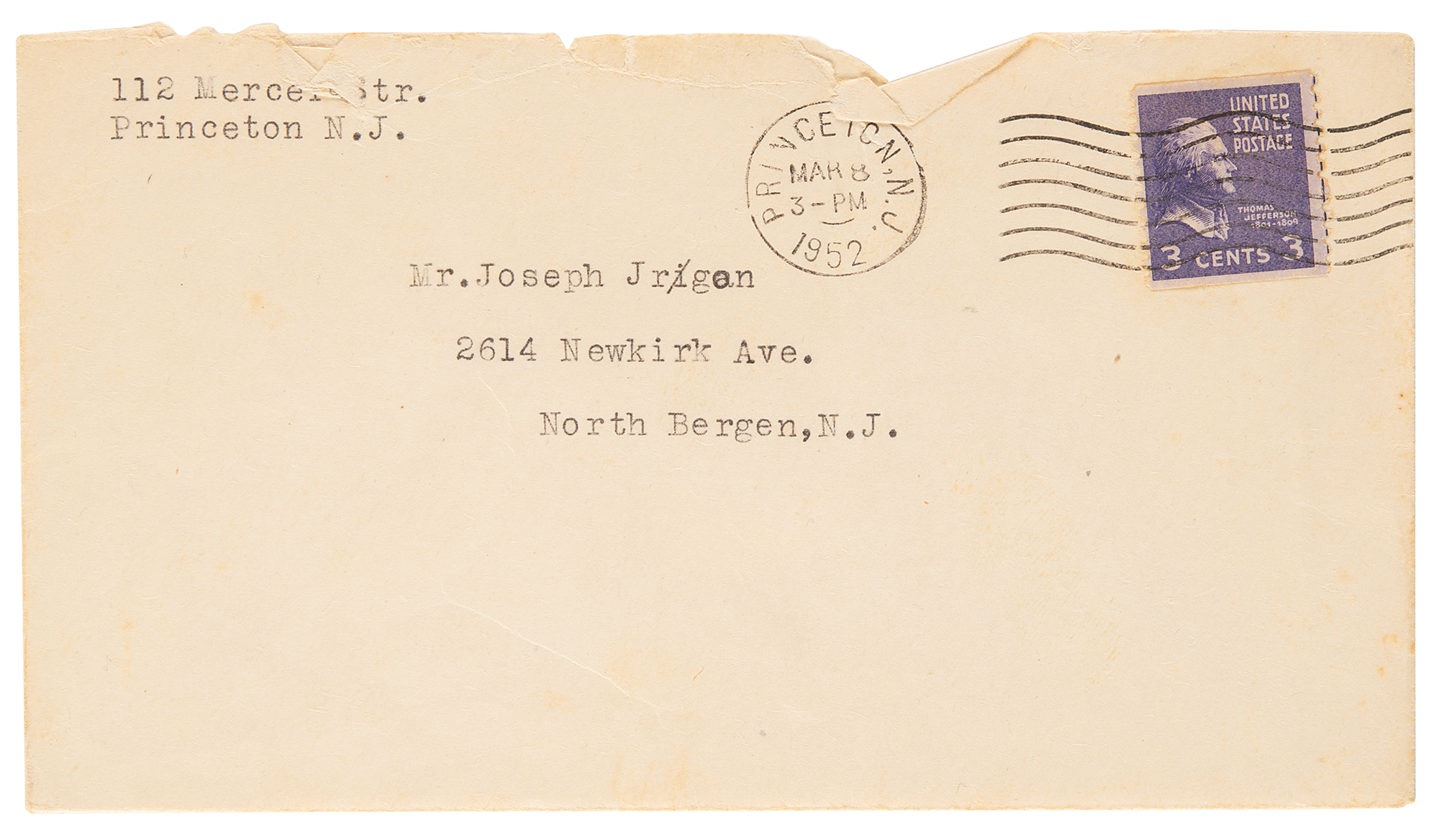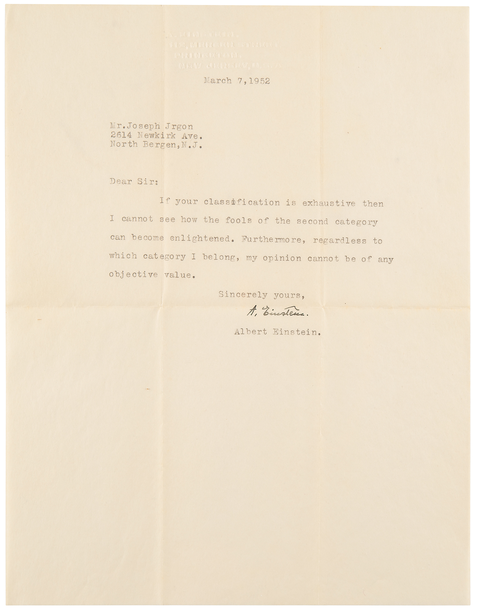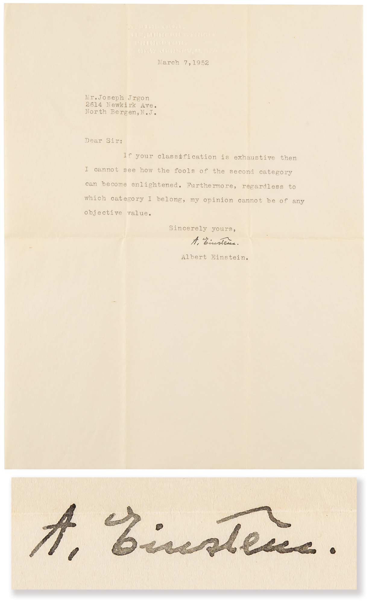 TLS signed “A. Einstein,” one page, 8.5 x 11, blindstamped personal Princeton letterhead, March 7, 1952. Letter to Joseph Jrgon of North Bergen, New Jersey, in full: "If your classification is exhaustive then I cannot see how the fools of the second category can become enlightened. Furthermore, regardless to which category I belong, my opinion cannot be of any objective value." In fine condition, with intersecting folds. Accompanied by the original mailing envelope.