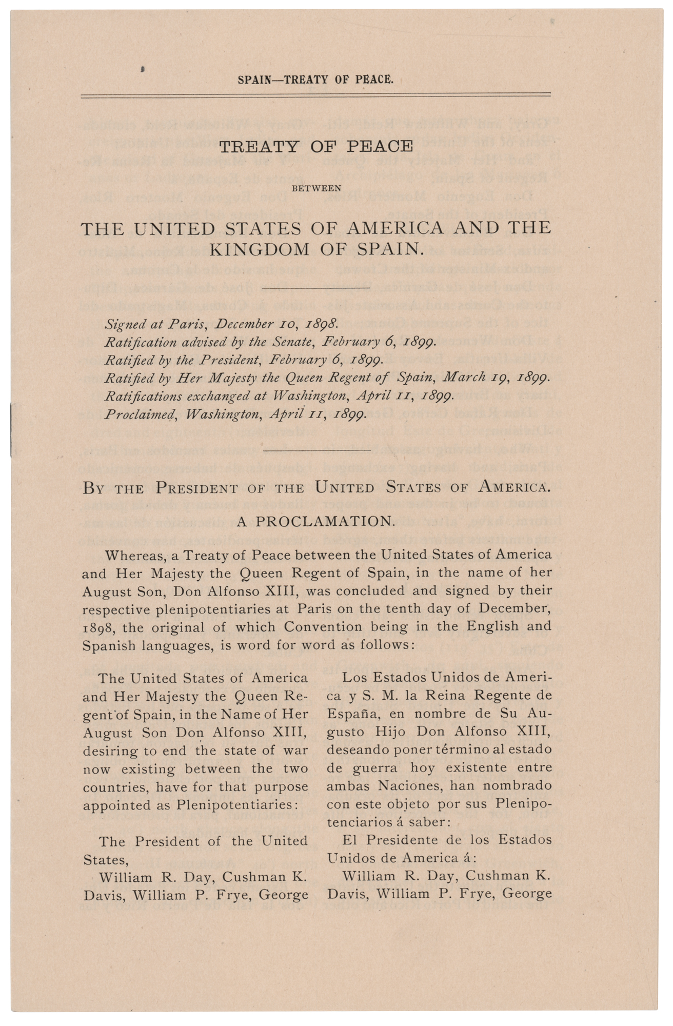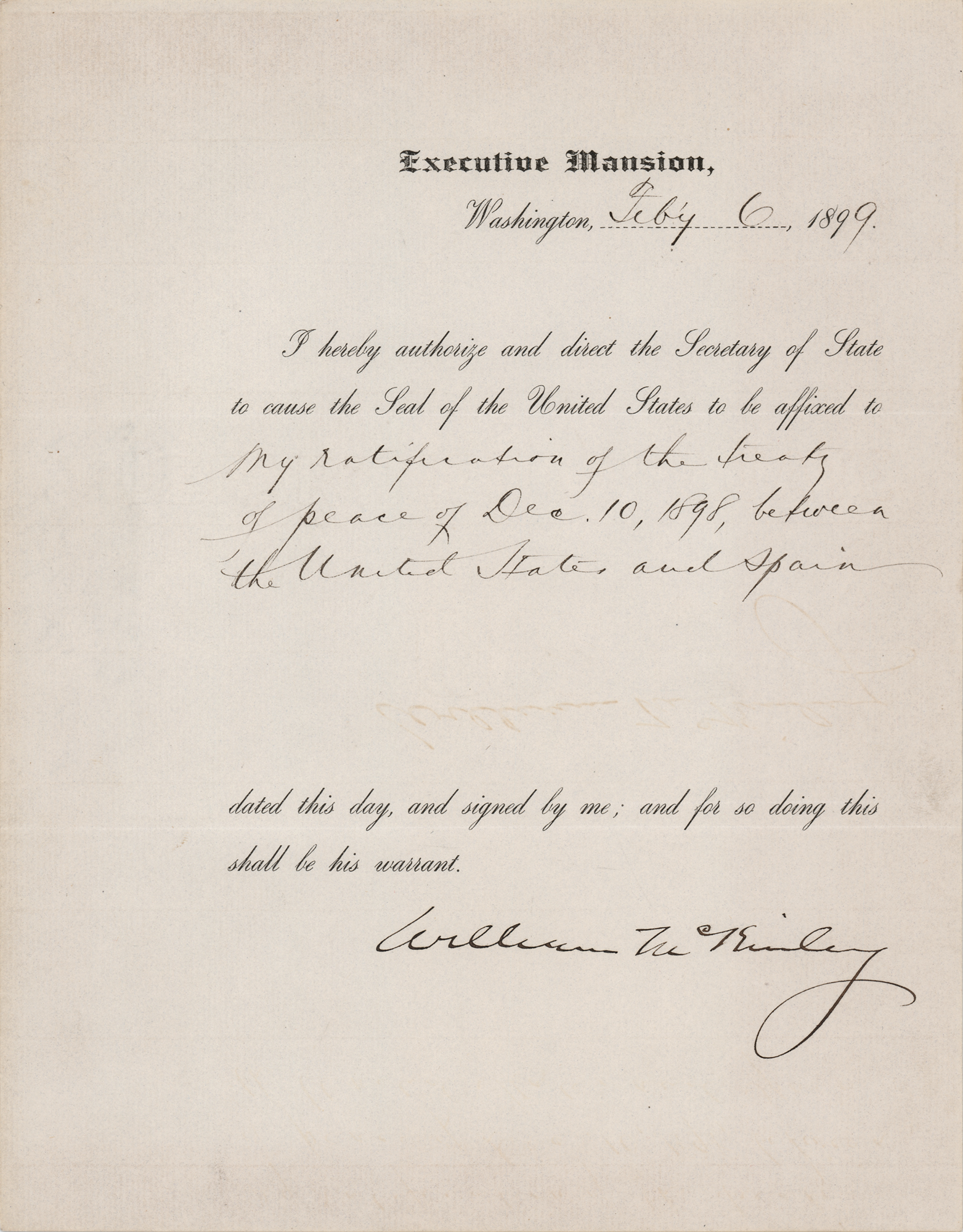 Partly-printed DS as president, one page, 8 x 10, February 6, 1899. President McKinley directs the Secretary of State to cause the Seal of the United States to be affixed to "my ratification of the treaty of peace of Dec. 10, 1898, between the United States and Spain." Boldly signed at the conclusion in ink by President William McKinley. In very fine condition. Accompanied by a bilingual printing of the treaty.