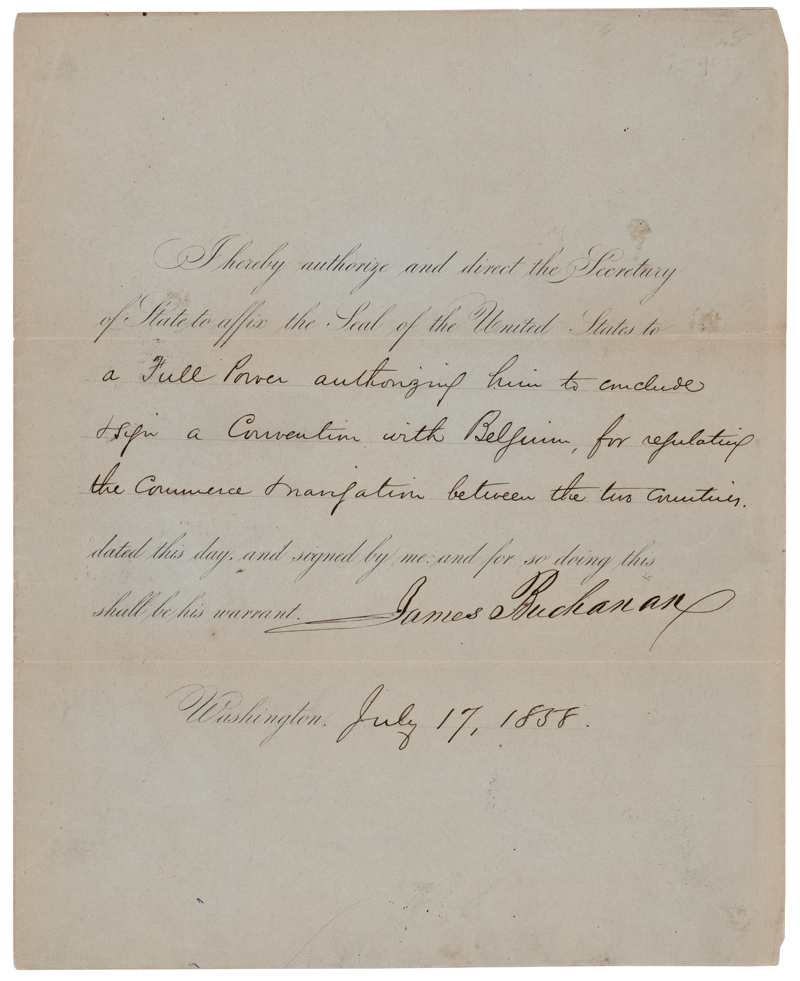 Partly-printed DS as president, one page, 8 x 10, July 17, 1858. President Buchanan directs the Secretary of State to affix the Seal of the United States to “a Full Power authorizing him to conclude & sign a Convention with Belgium, for regulating the Commerce & Navigation between the two countries.” Signed crisply at the conclusion by James Buchanan. In fine condition.