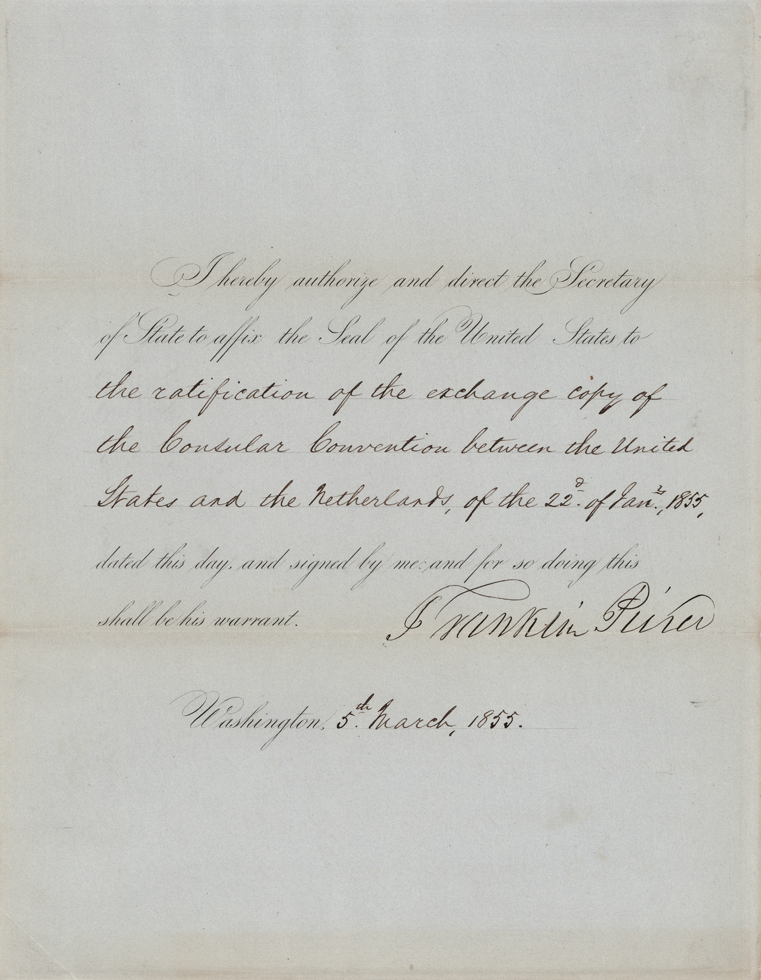 Partly-printed DS as president, one page, 8 x 10.25, March 5, 1855. President Pierce authorizes and directs the Secretary of State to affix the Seal of the United States to “the ratification of the exchange copy of the Consular Convention between the United States and the Netherlands, of the 22d of Jan'y, 1855." Boldly signed at the conclusion in ink by President Franklin Pierce. In fine condition, with faint toning to the folds and edges. The referenced convention, which regulated the rights, duties, and privileges of U.S. and Dutch consuls in the Netherlands and the United States respectively, was signed at The Hague on January 22, 1855.