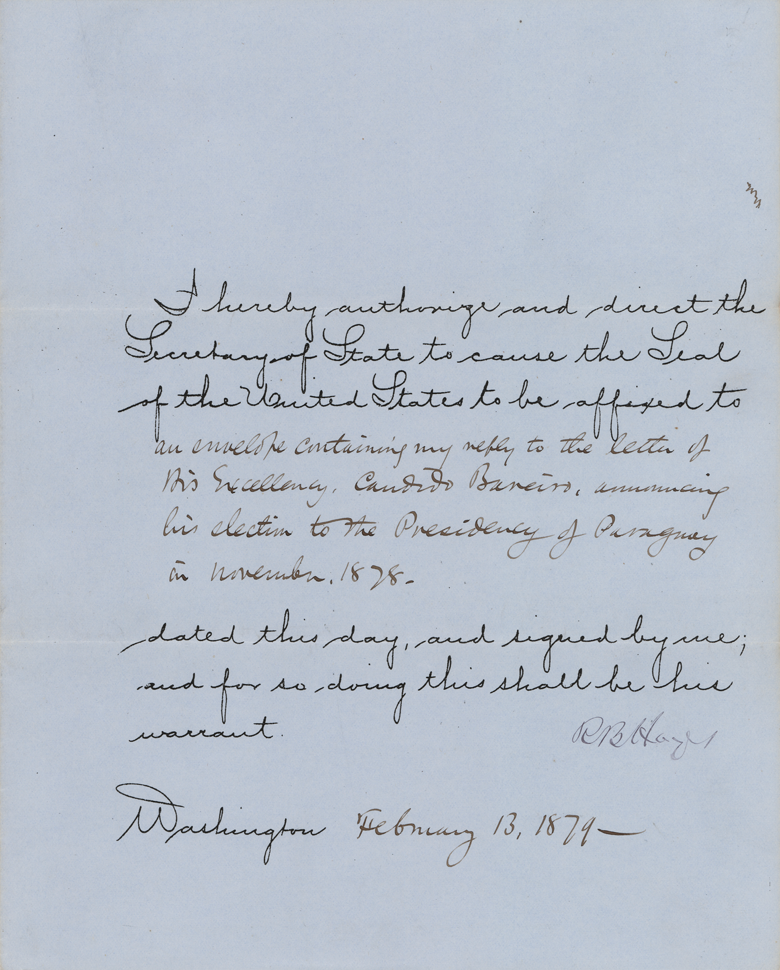 Partly-printed DS as president, signed “R. B. Hayes,” one page, 8 x 10, February 13, 1879. President Hayes authorizes and directs the Secretary of State to cause the Seal of the United States to be affixed to "an envelope containing my reply to the letter of His Excellency, Candido Bareiro, announcing his election to the Presidency of Paraguay in November, 1878.” Signed at the conclusion in ink by President Rutherford B. Hayes. In fine condition.