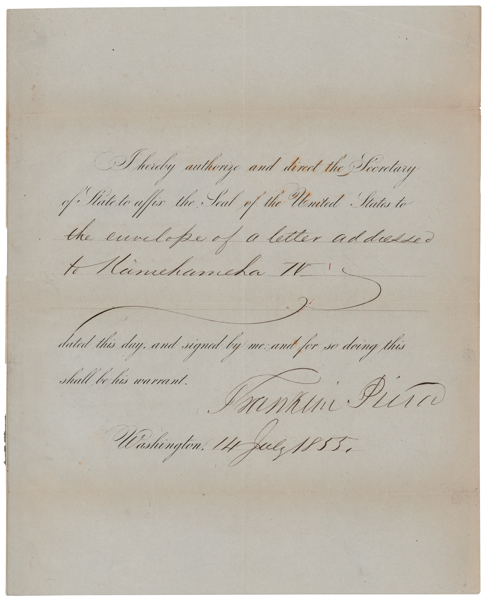 Partly-printed DS as president, one page, 8 x 10, July 14, 1855. President Pierce authorizes and directs the Secretary of State to affix the Seal of the United States to “the envelope of a letter addressed to Kamehameha IV.” Signed neatly at the conclusion in ink by Franklin Pierce. In fine condition, with light toning to the folds and edges.