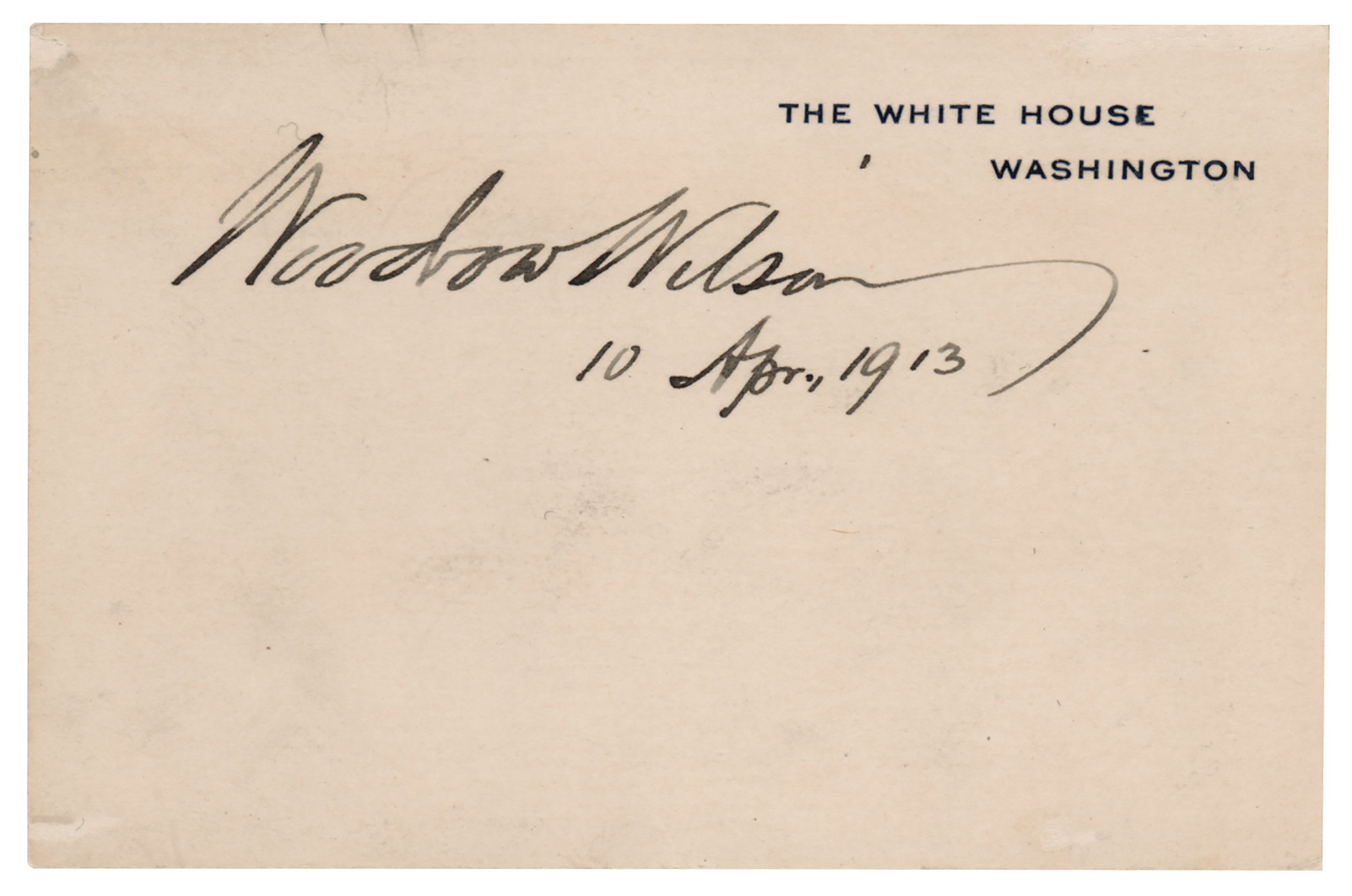 "Woodrow Wilson, 10 April 1913"—official White House card signed a month after taking office