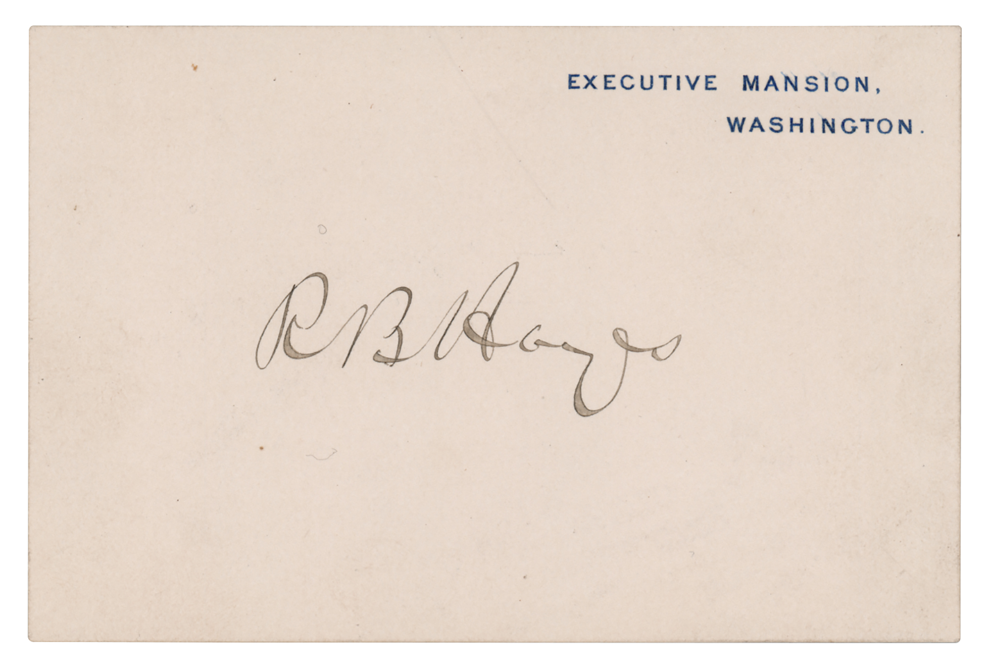 Official Executive Mansion card, 4 x 2.75, signed in ink, "R. B. Hayes." In very fine condition.