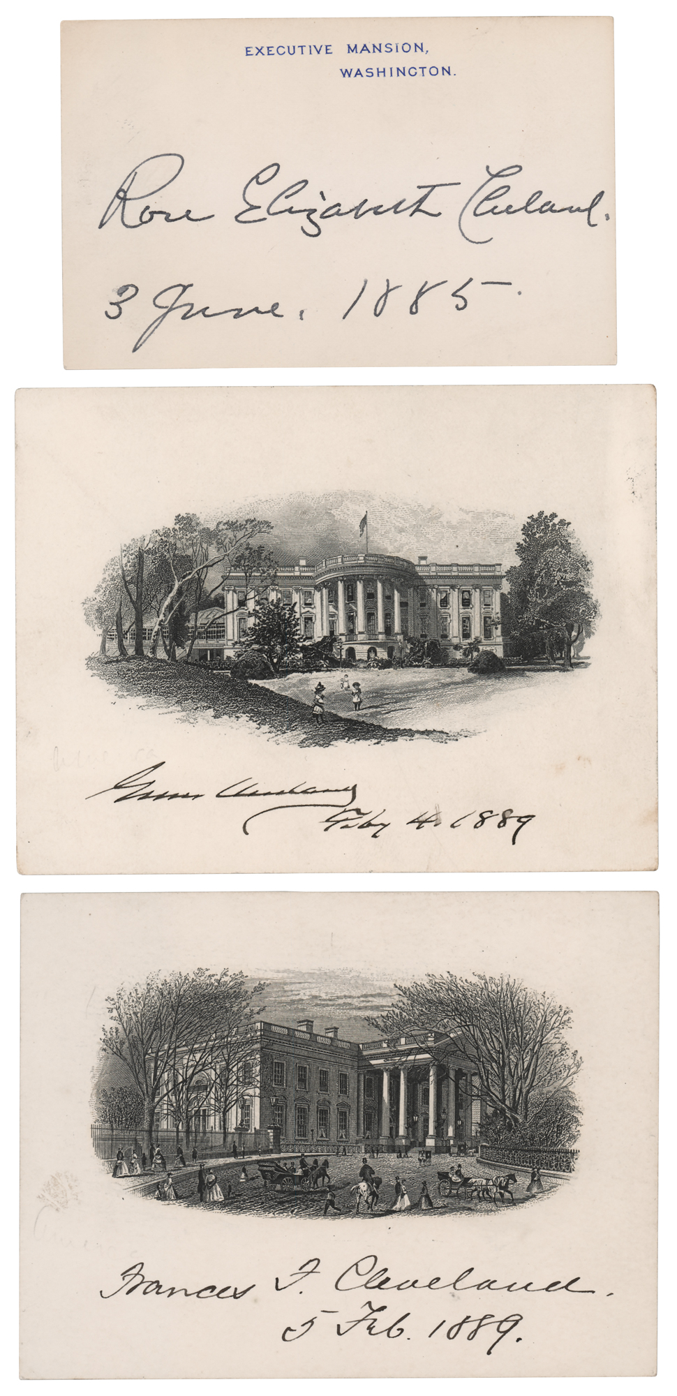 Three items: an engraving of the South Portico of the White House, 4.75 x 3.5, signed in ink as president, “Grover Cleveland, Feby 4, 1889”; an engraving of the North Portico of the White House, 4.75 x 3.5, signed in ink as first lady, “Frances F. Cleveland, 5 Feb. 1889”; and an official Executive Mansion card, 4 x 2.5, signed in ink as acting first lady, “Rose Elizabeth Cleveland, 3 June, 1885.” Rose Cleveland served as acting first lady of the United States from 1885 to 1886, during the presidency of her brother, Grover Cleveland. In overall fine condition.