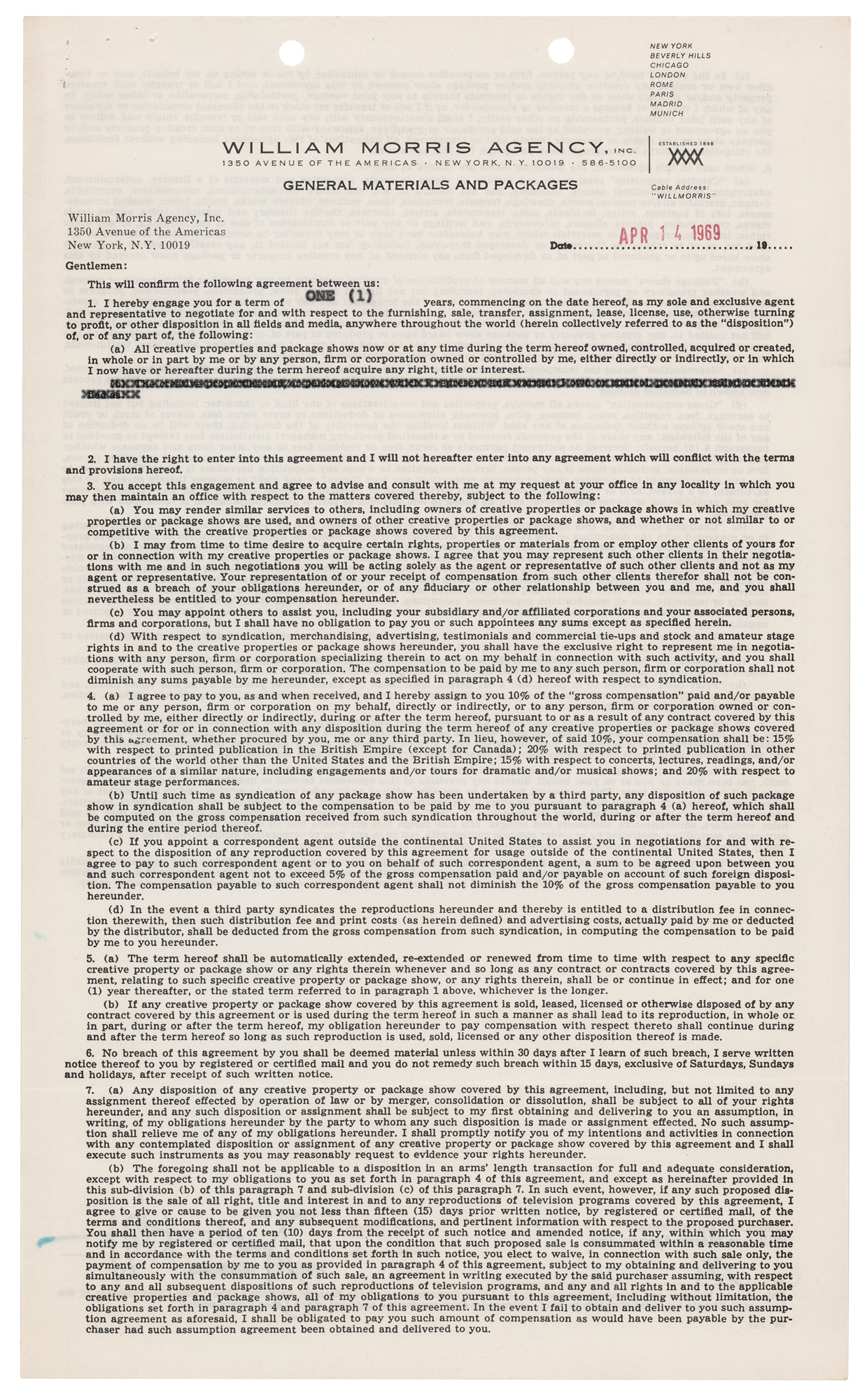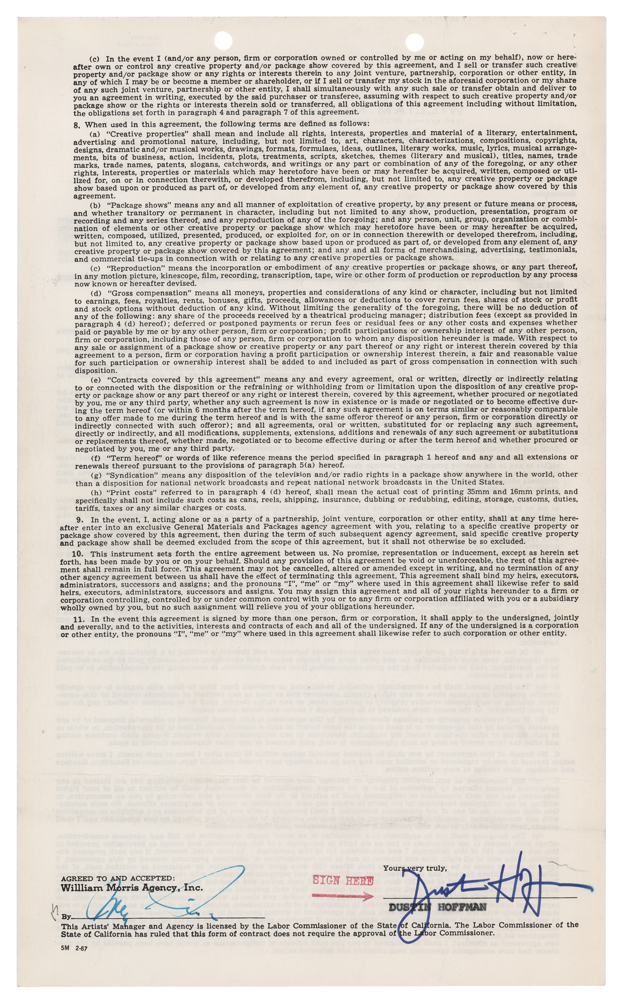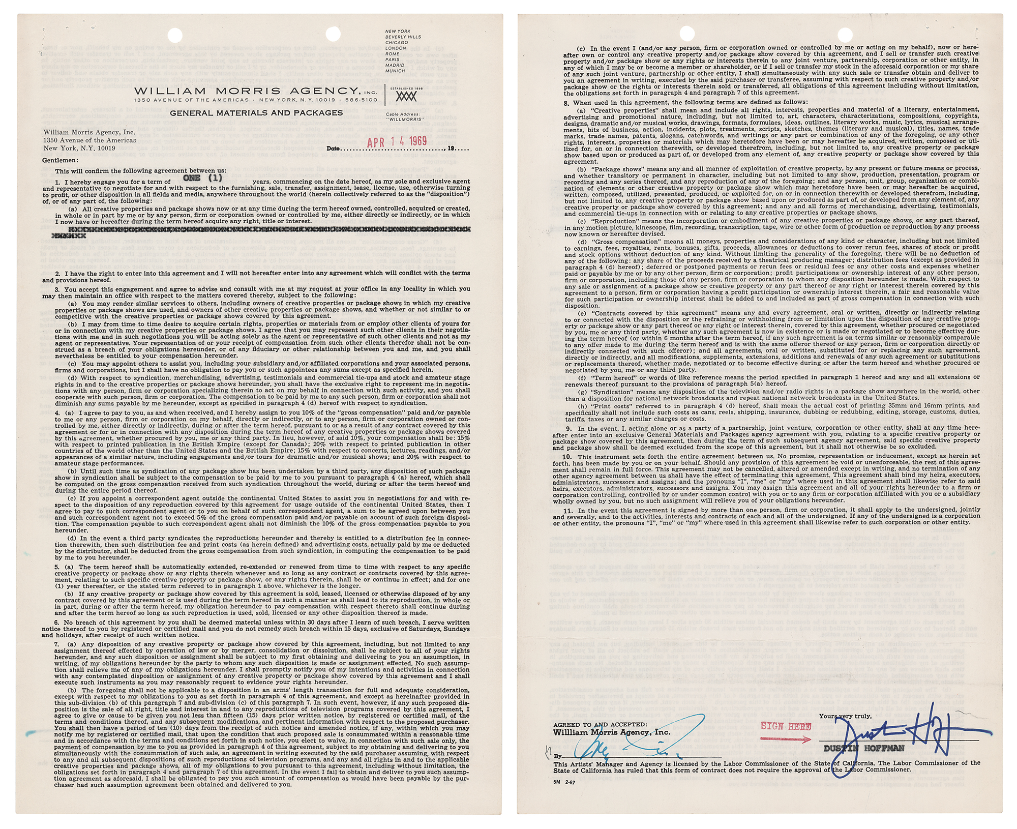 Partly-printed DS, one page both sides, 8.5 x 14, April 14, 1969. Agreement between Dustin Hoffman and the William Morris Agency, by which the actor employs the agency as his "sole and exclusive agent and representative" for the period of one year. Signed at the conclusion in blue felt tip by Dustin Hoffman and countersigned by an agent. In fine condition.