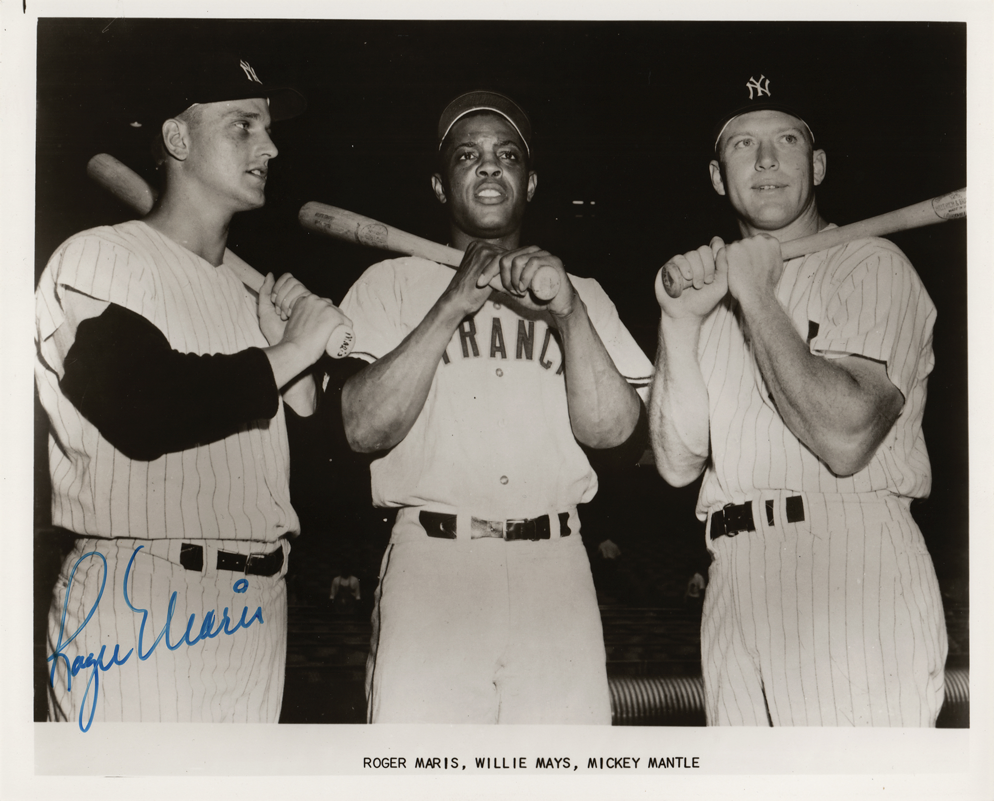 Glossy 10 x 8 photo of Roger Maris, Willie Mays, and Mickey Mantle standing together during the 1960 All-Star Game at Yankee Stadium, signed in blue felt tip by Maris. In very fine condition.