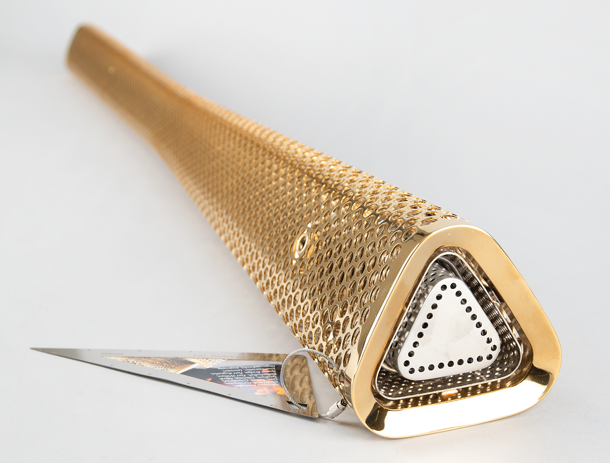 The Olympic flame was lit in Olympia on May 10, 2012, and embarked on an eight-day journey across Greece and Crete before flying over to London. Commencing in Land’s End in Cornwall on May 19, the UK portion of the relay was designed so that 95 percent of the population of the United Kingdom, the Isle of Man, Jersey, and Guernsey would be a maximum of one hour from the torch route. After seventy days and 15,775 total km, the massive relay touched down in London’s Olympic Stadium on July 27. A truly regal, gorgeous example of an Olympic torch, and a work of art that earned the Design of the Year Award at London’s Design Museum.