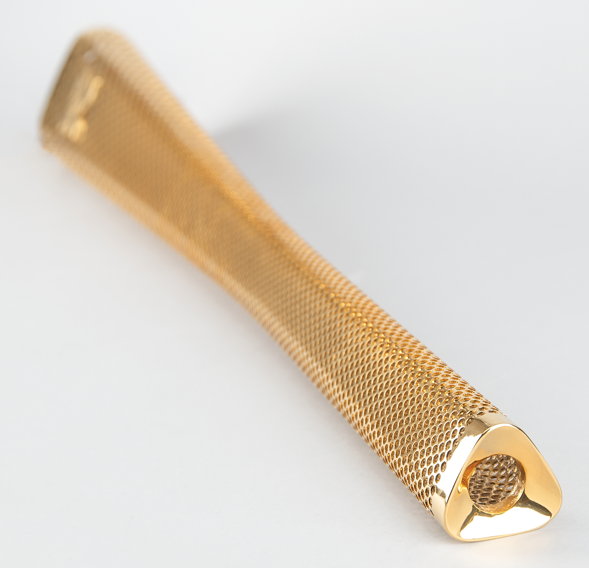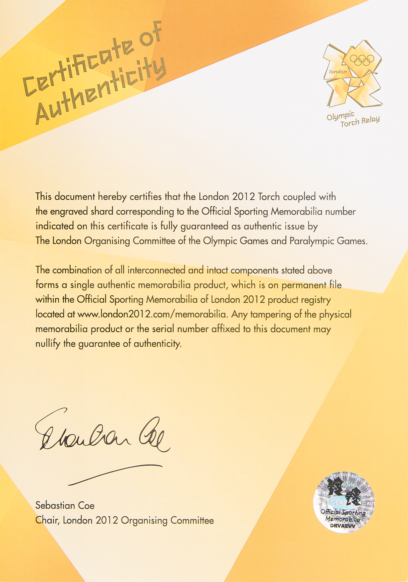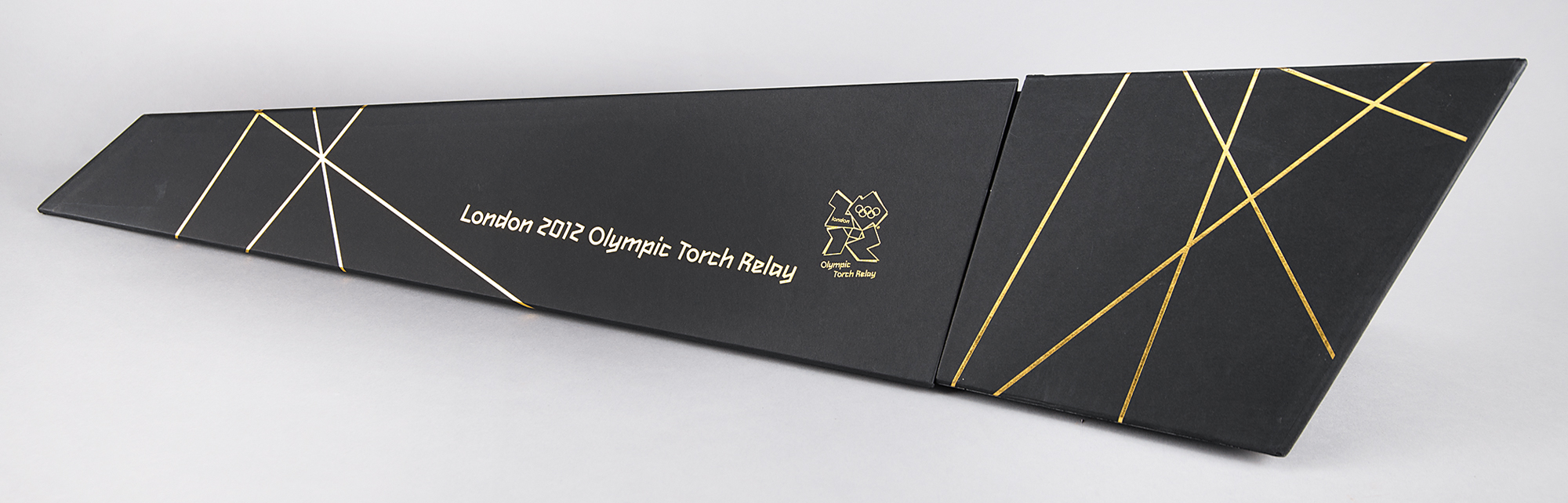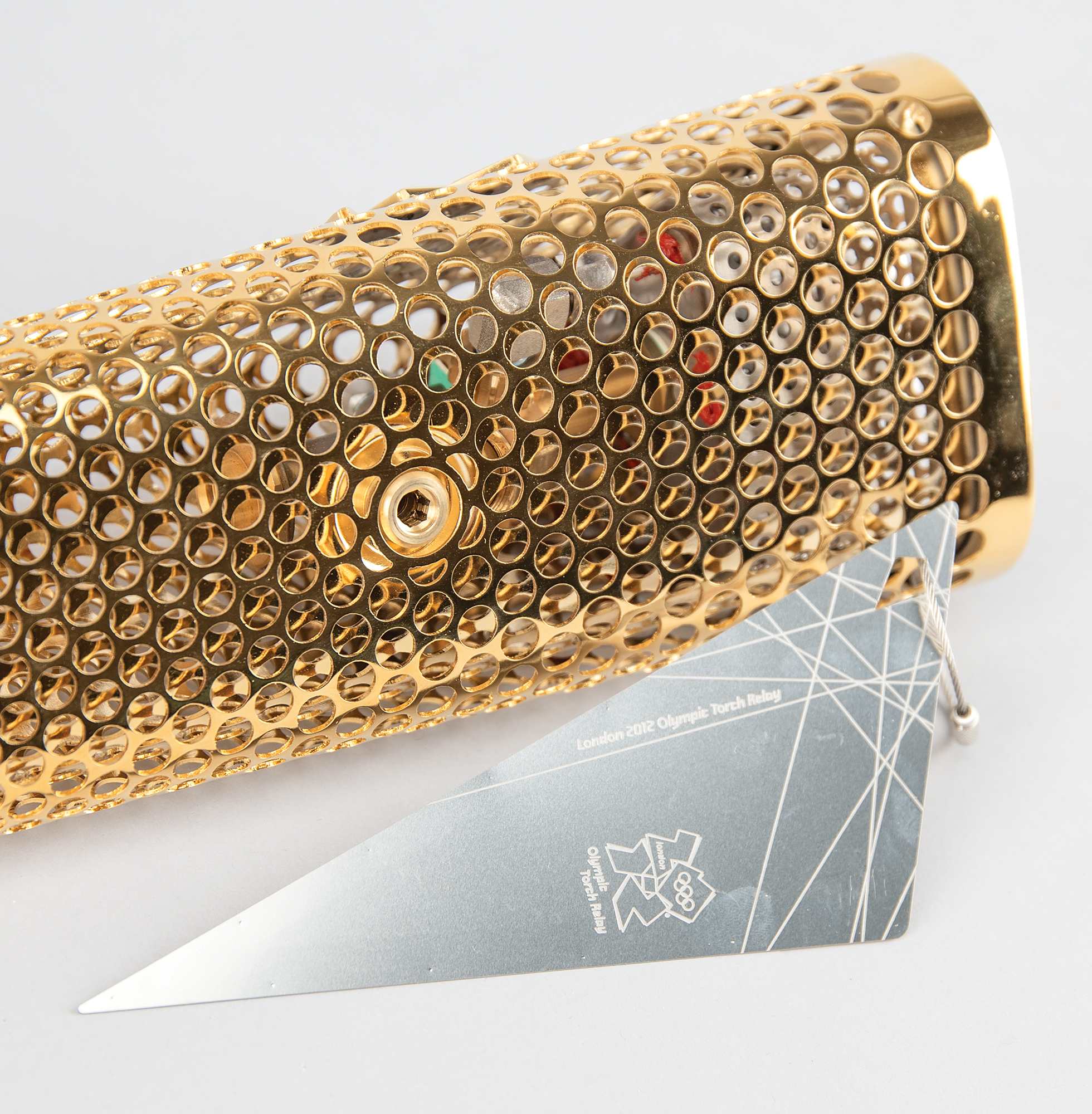 Beautiful official 2012 London Olympics torch, comprised of metal and aluminum, measuring 31.5″ in length and 4.25″ at its widest point, designed by Edward Barber and Jay Osgerby, and manufactured in collaboration by Tecosim, LPG Gas, Bullfinch and Premier Sheet Metal. The gold-colored torch body consists of two envelopes of aluminum alloy perforated with 8,000 circles, a number which matches with both the amount of torchbearers and the United Kingdom relay miles, and features a golden metal logo of the Games near the top. The triangular shape refers to the multiples of three found in the Olympic movement’s values of excellence, friendship, and respect, the Olympic motto of ‘Citius, Altius, Fortius,’ and London’s hosting of the Games for the third time. Attached at the top is a tag commemorating day 22 of the torch relay, which saw the Olympic flame carried through the Scottish Highlands from Glasgow to Inverness. Accompanied by the original box and a certificate of authenticity from the London 2012 Organising Committee.