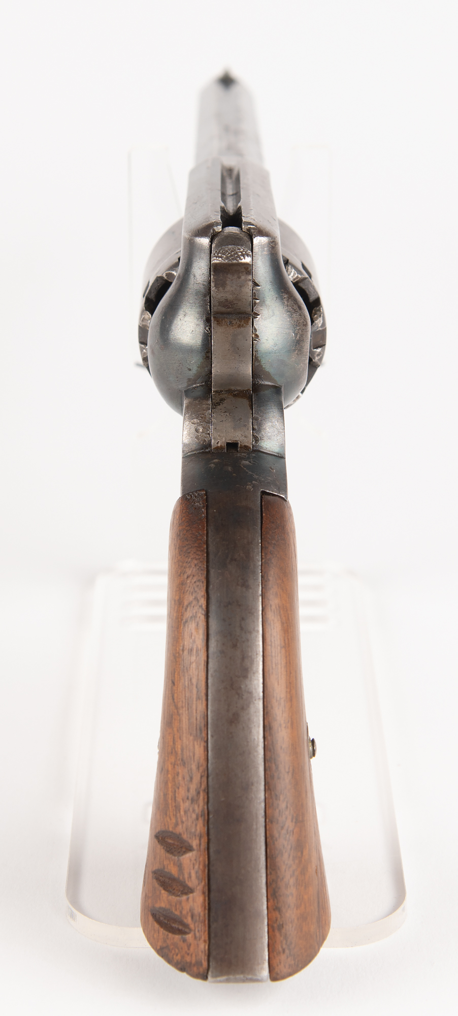 Remington New Model Army Revolver used in battle by Private Macy U. Chafin, a Missouri farmer who notched the gun's walnut grips with three 'Confederate kill' grooves