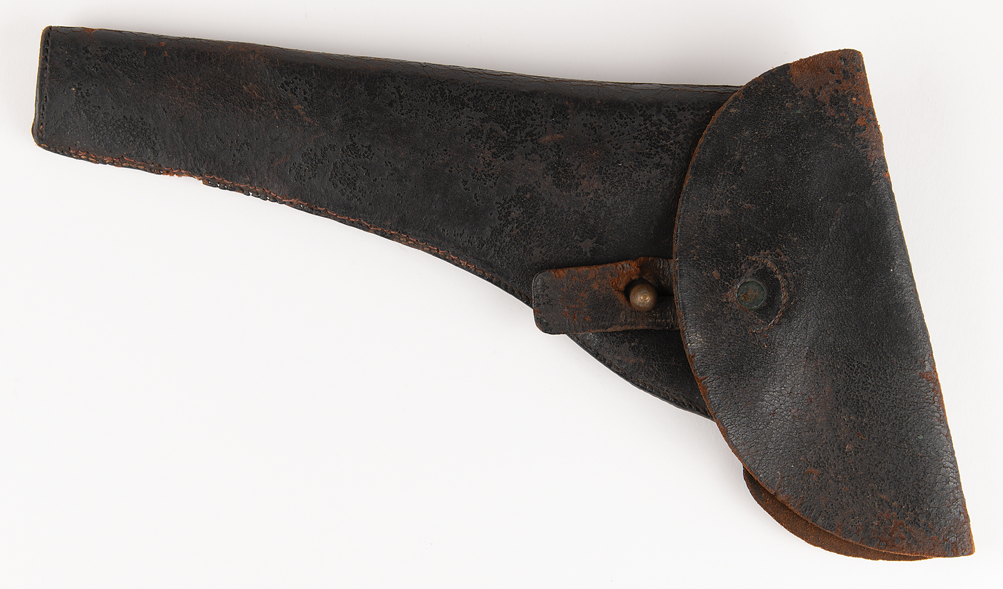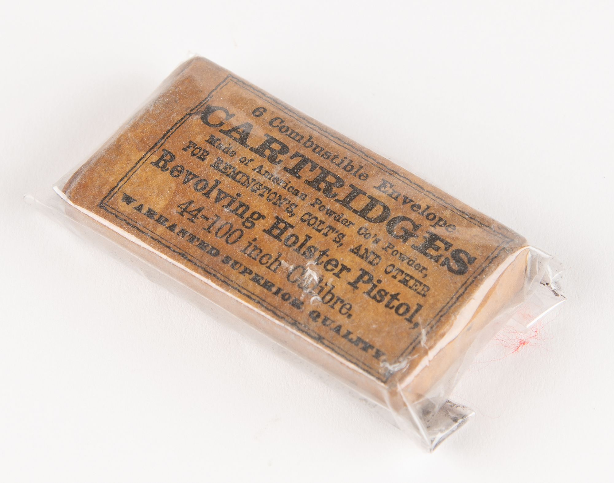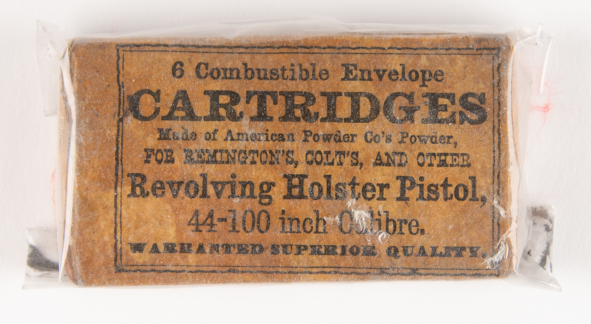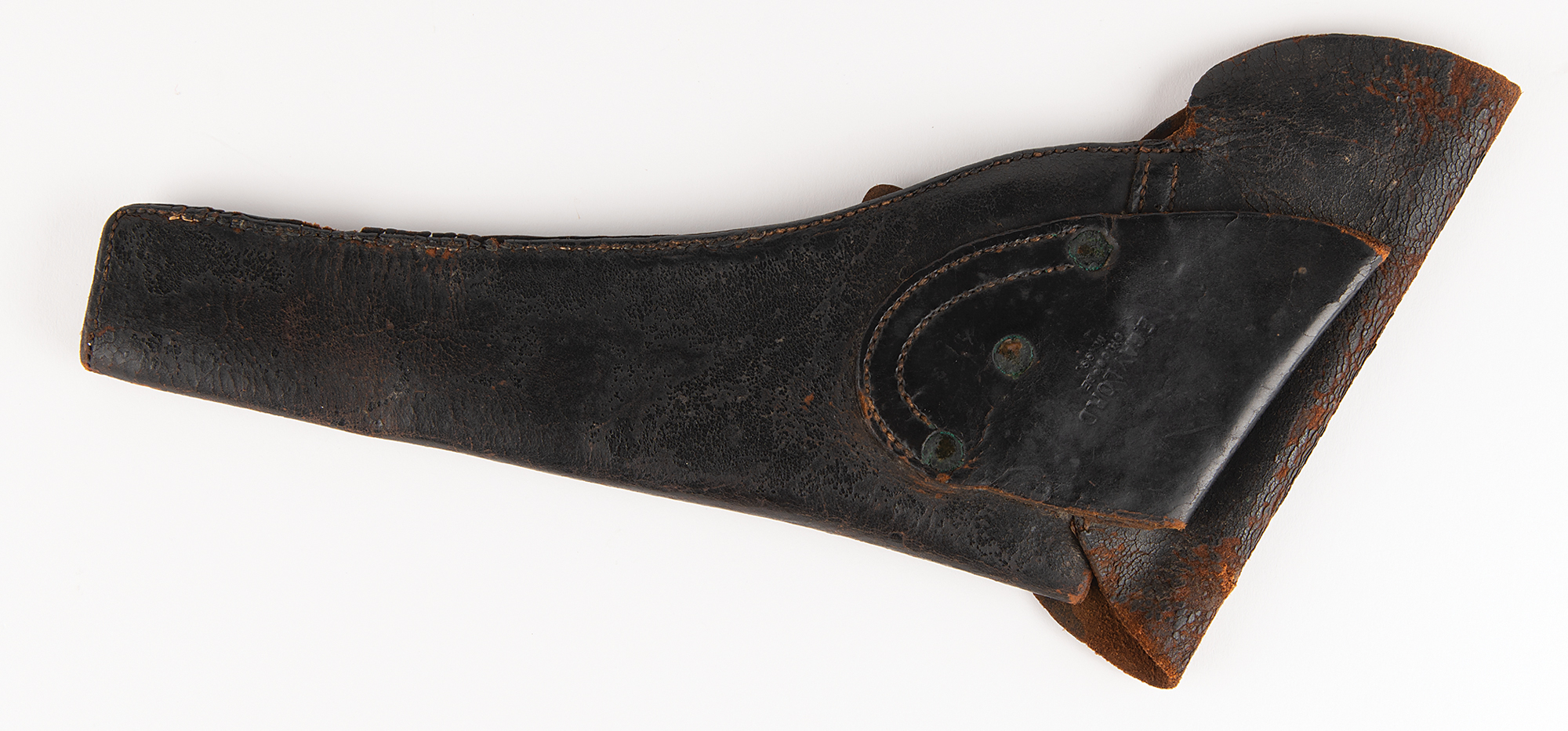 New Model 1858 Remington Army revolver, .44 caliber, identified by serial number (#67392) as belonging to Private Macy U. Chafin of the Union Army, who served with both the 6th Missouri Cavalry Regiment and the 13th Missouri Cavalry Regiment during the Civil War. This 1858 revolver pistol features a tapered octagon barrel, steel frame, brass trigger guard, 6-shot cylinder, fixed sights, and two-piece walnut grips, the left of which features the inspector’s cartouche and three carved notches, which represent the three Confederate soldiers Chafin killed in battle with this gun. The gun’s serial number is located on the bottom of the barrel, under the loading lever. Includes an opened pack of six .44 caliber cartridges and an original Civil War-era Emerson Gaylord gun holster. Rugged and accurate, the Remington New Model Army six-shooter was a mainstay of the Civil War and the American Frontier during the cap-and-ball era.