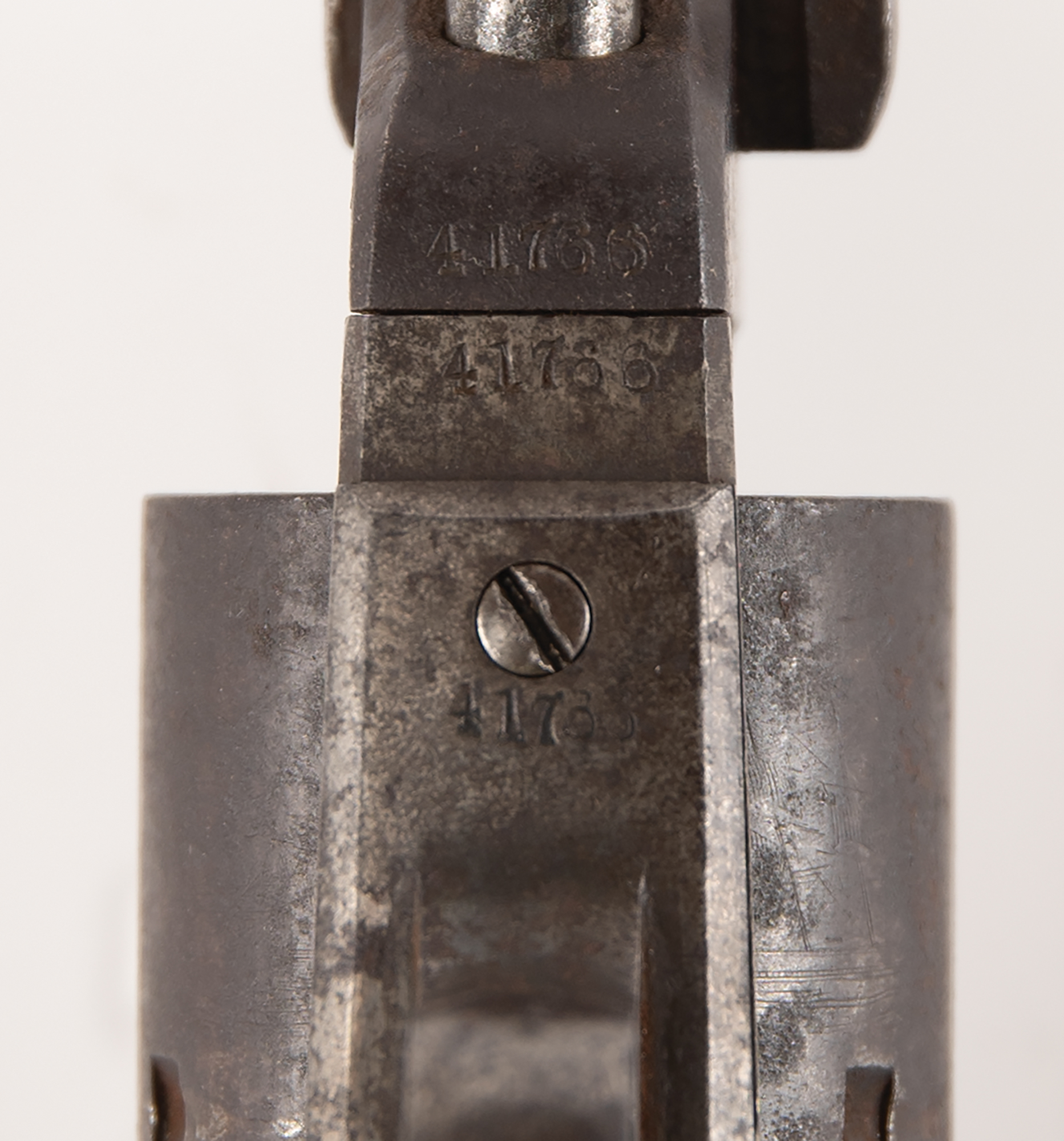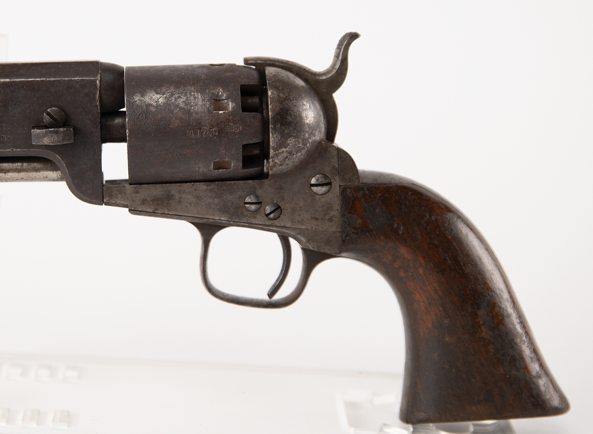 London Model Colt 1851 Navy .36-caliber single-action revolver, serial no. 41766, octagonal 7.5˝-long barrel, identified to Lt. Edwin Good of 'F' Company, 11th Regiment, New Jersey Volunteer Infantry (as attested by descendants in accompanying auction records and a description from The Horse Soldier Fine Military Antiques). Stamped on the barrel, "—Address Col. Colt London—," with matching serial numbers on all components: barrel, frame, triggerguard, loading lever, buttplate, cylinder, and wedge). One of the most sought-after sidearms ever produced, this is a fine, complete specimen with a dark patina.