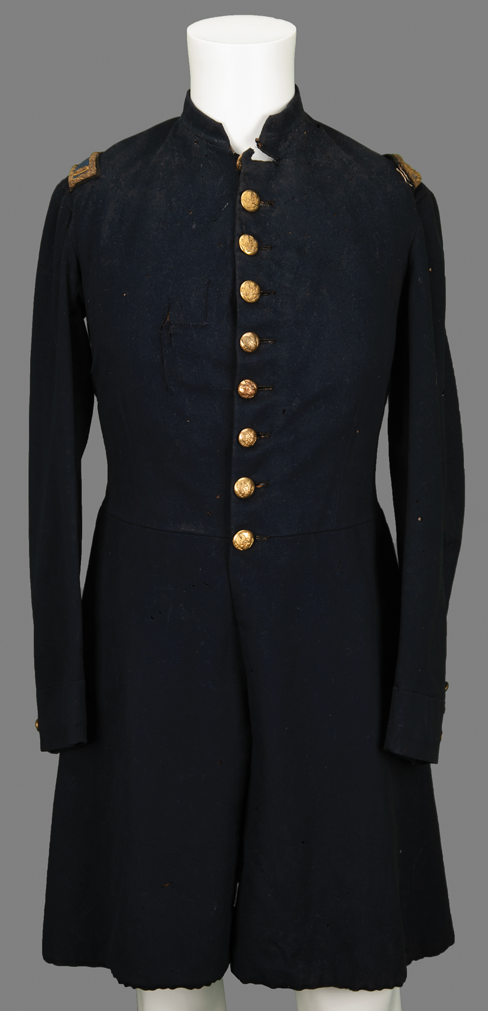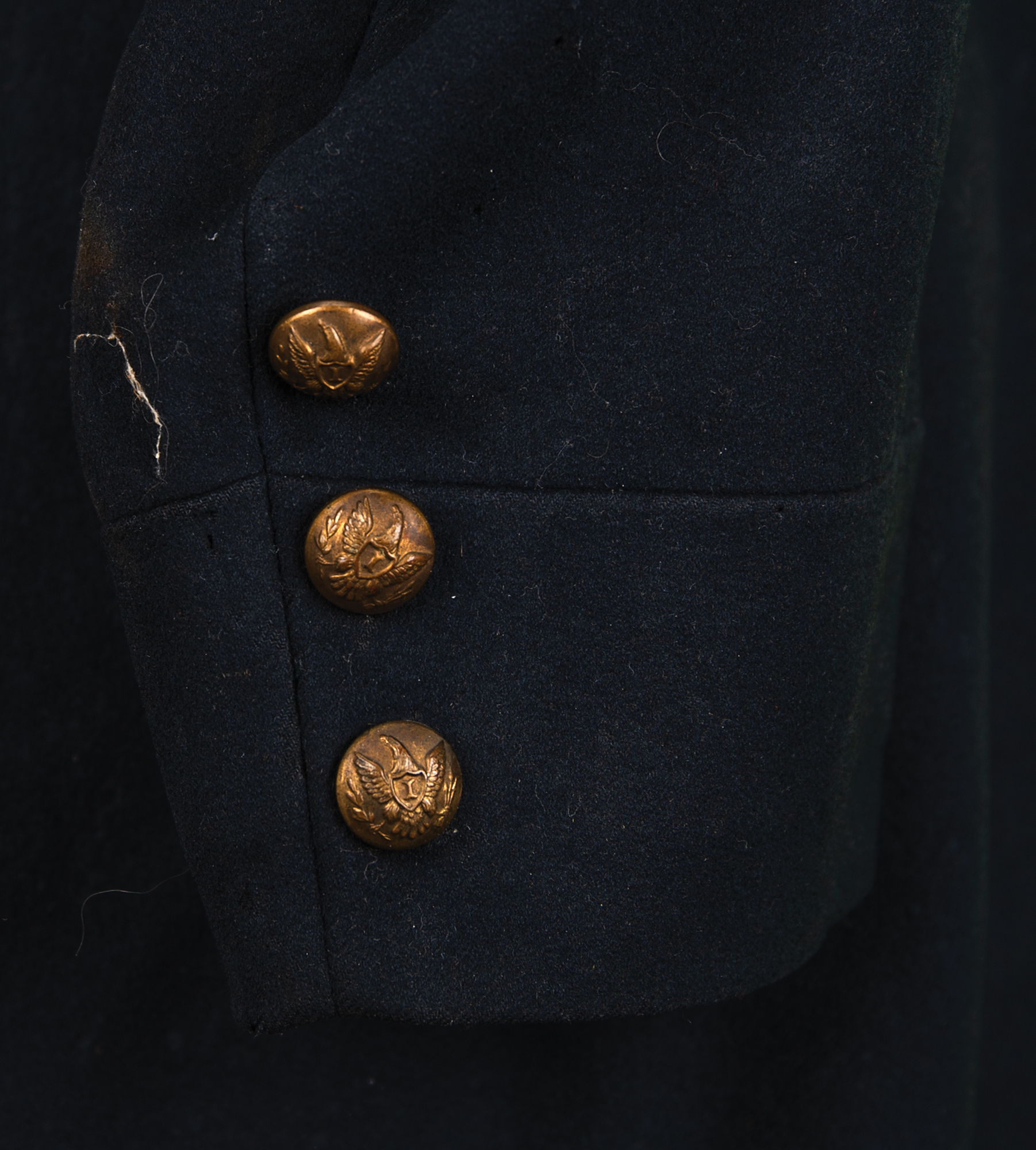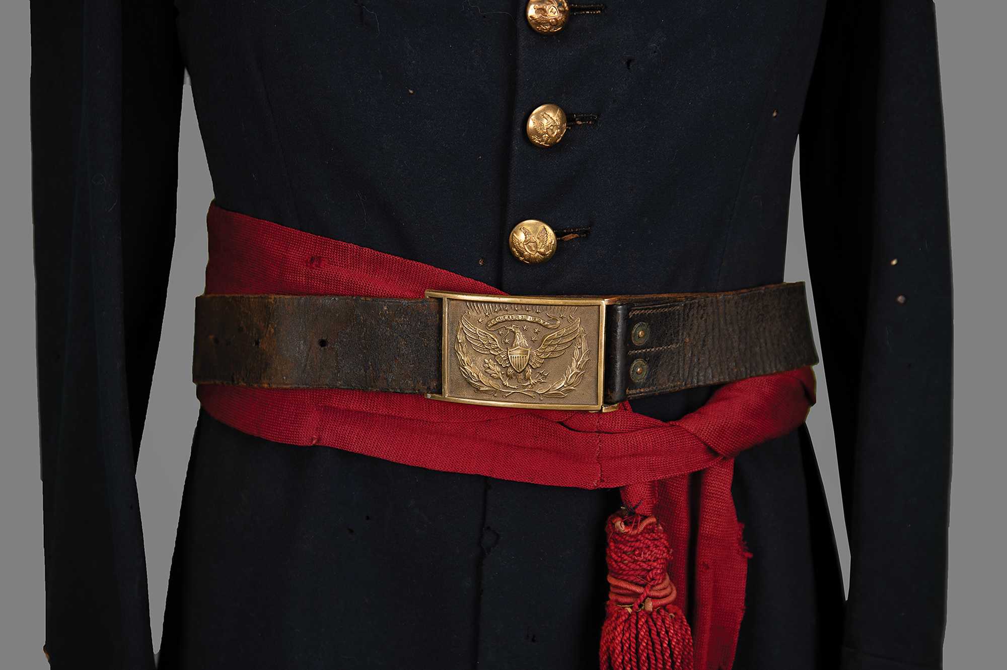 Union Infantry officer's deep blue frock coat with 1st lieutenant shoulder straps, scarlet NCO sash, and officer's belt with buckle. The coat features nine brass-tone post-war buttons, each bearing a spread-wing eagle with the "I" shield on its chest, denoting the infantry branch of service, and the back of each stamped by the Waterbury Button Company, a style that wasn't used until after the Civil War. Each cuff bears three similar buttons, with the reverse of those bearing war-era "Extra Quality” backmarks. The shoulder straps feature gold wire bullion borders and bars with a solid dark blue field. The included NCO sash approximately measures 92˝ in length, and the belt approximately measures 40˝ in length and features a brass-tone Union officer’s belt buckle numbered on the back, “82.” The condition of the coat is fair, with several moth holes and an old 6˝ stitched repair on the front breast; the sash is in very good condition; and the belt and buckle bear slight overall wear.