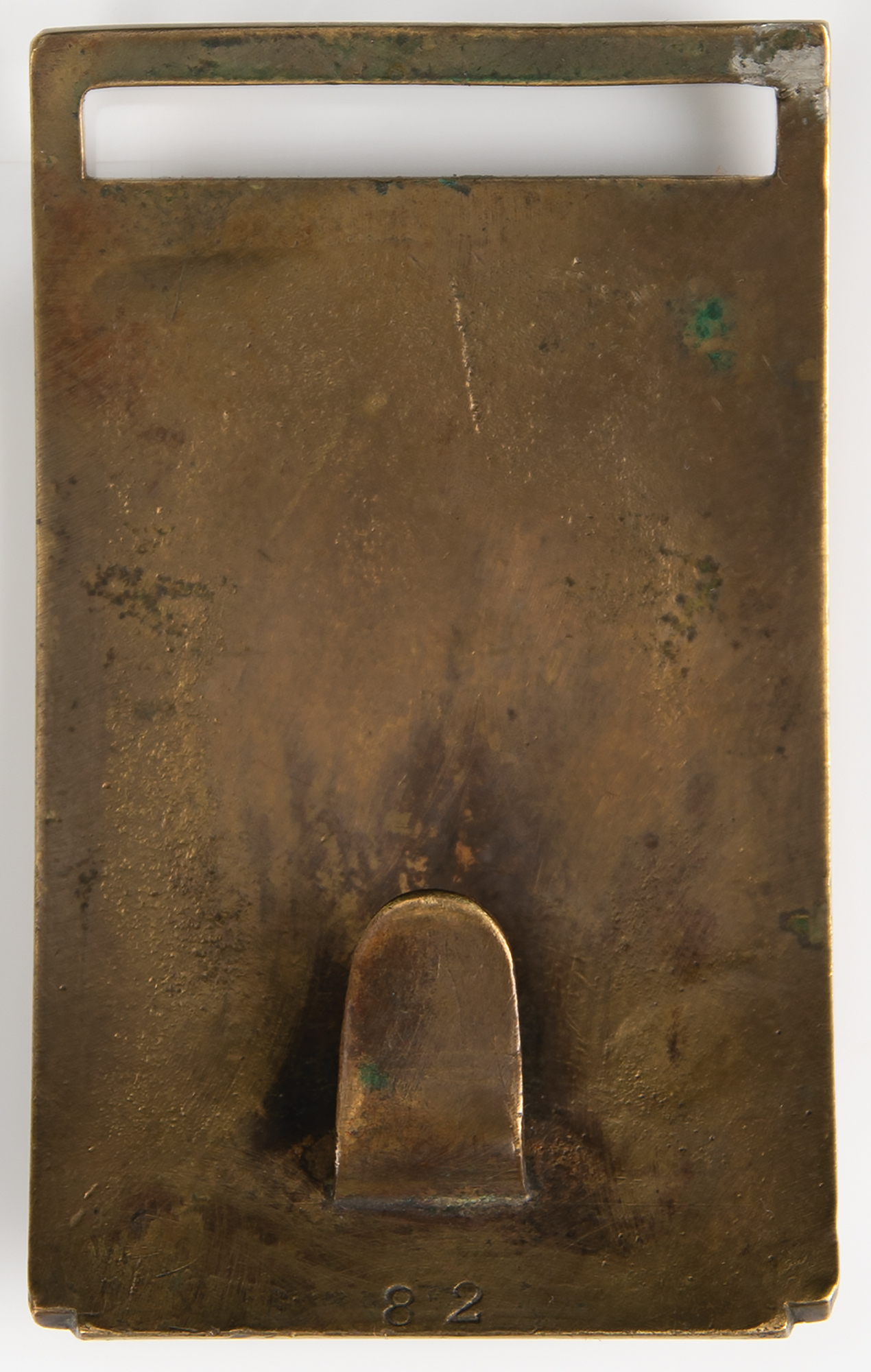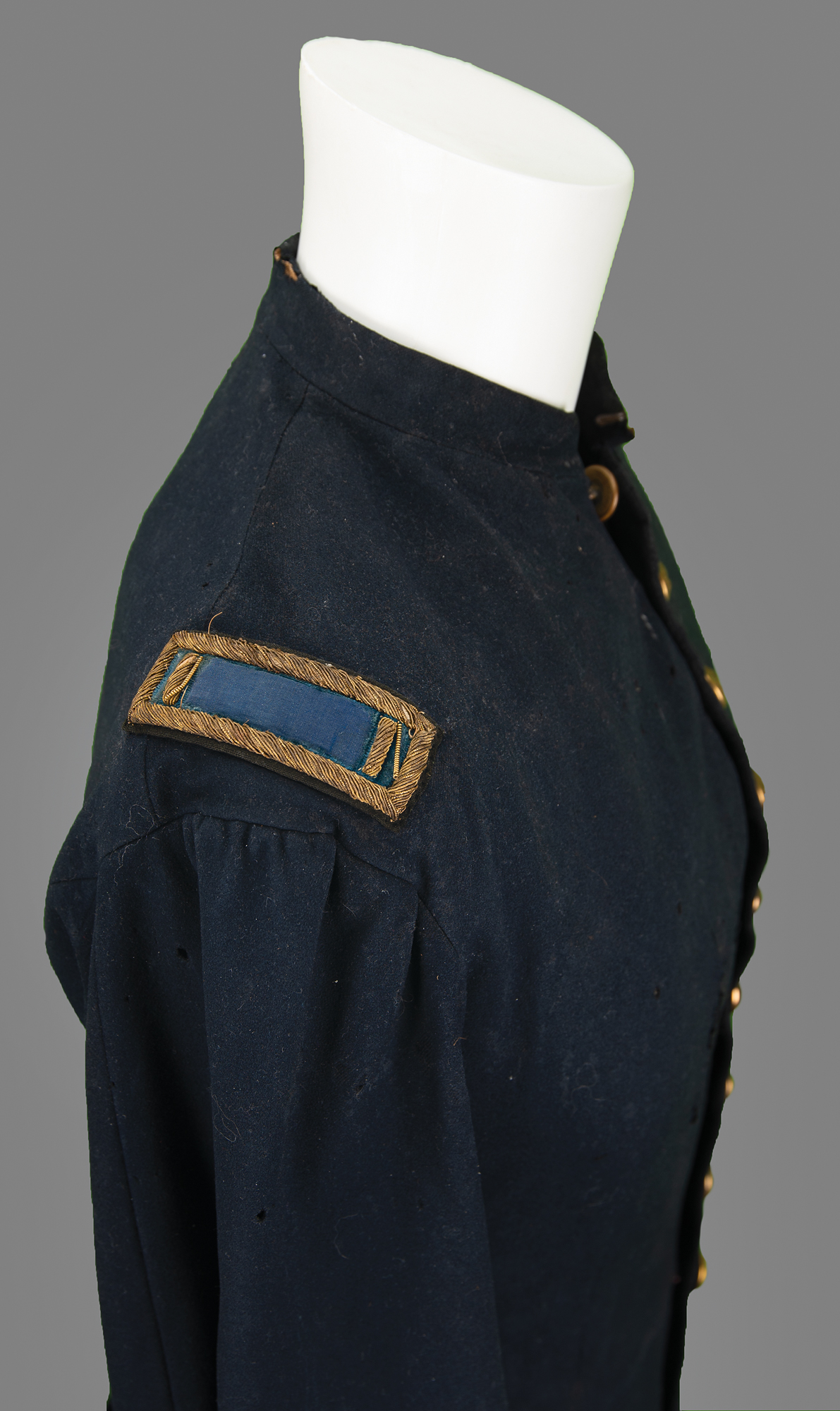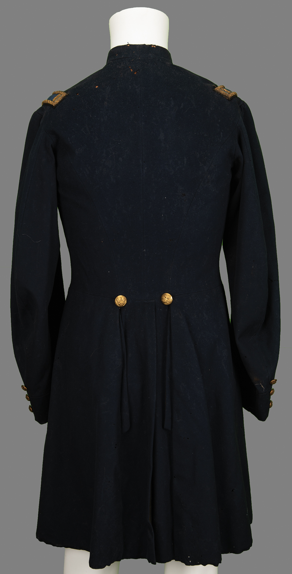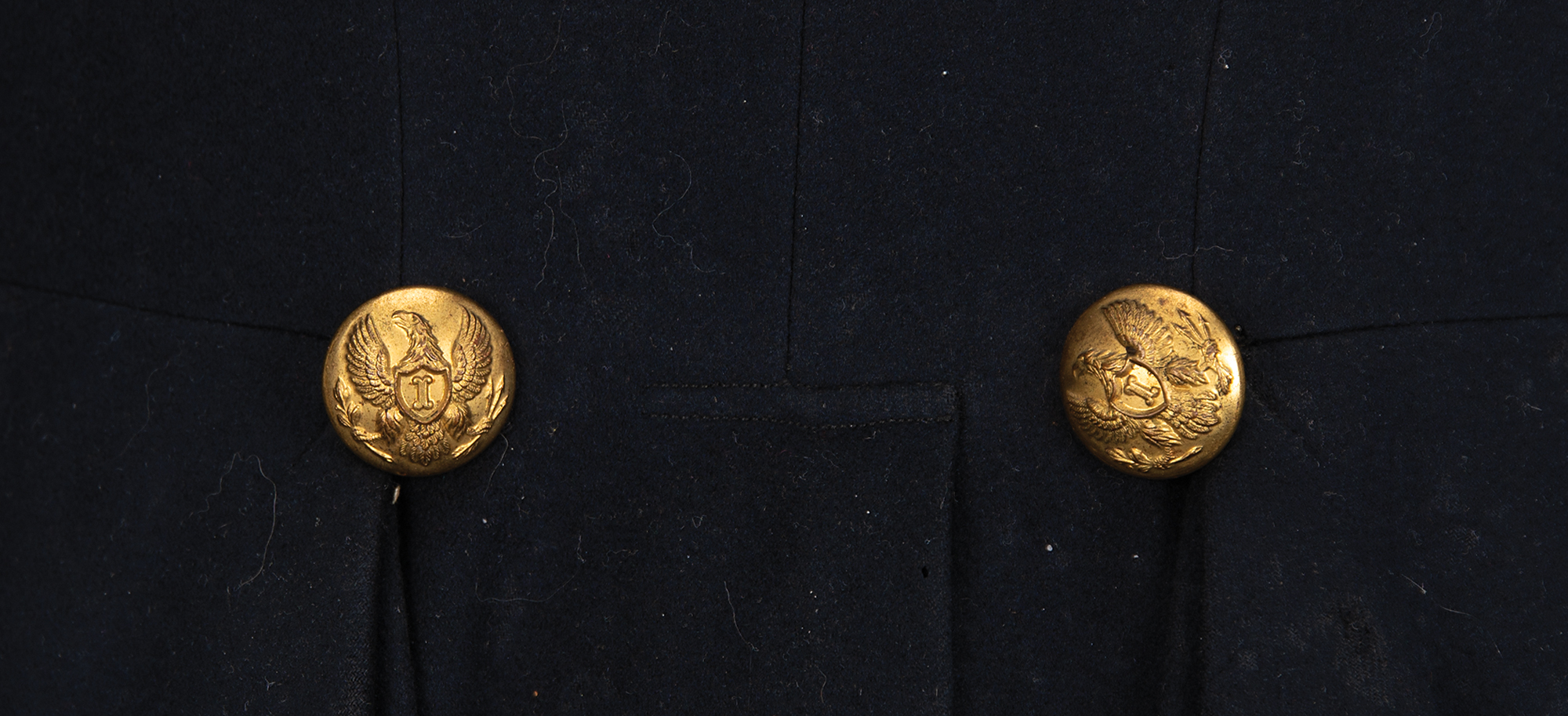 Union Infantry officer's deep blue frock coat with 1st lieutenant shoulder straps, scarlet NCO sash, and officer's belt with buckle. The coat features nine brass-tone post-war buttons, each bearing a spread-wing eagle with the "I" shield on its chest, denoting the infantry branch of service, and the back of each stamped by the Waterbury Button Company, a style that wasn't used until after the Civil War. Each cuff bears three similar buttons, with the reverse of those bearing war-era "Extra Quality” backmarks. The shoulder straps feature gold wire bullion borders and bars with a solid dark blue field. The included NCO sash approximately measures 92˝ in length, and the belt approximately measures 40˝ in length and features a brass-tone Union officer’s belt buckle numbered on the back, “82.” The condition of the coat is fair, with several moth holes and an old 6˝ stitched repair on the front breast; the sash is in very good condition; and the belt and buckle bear slight overall wear.