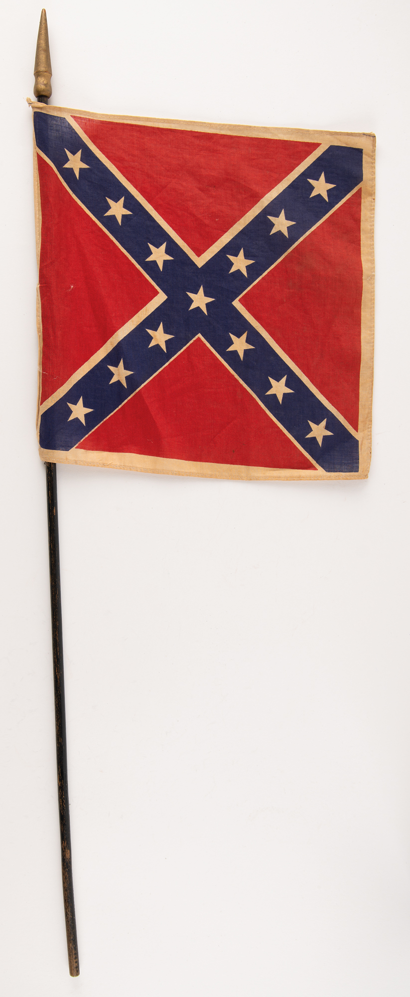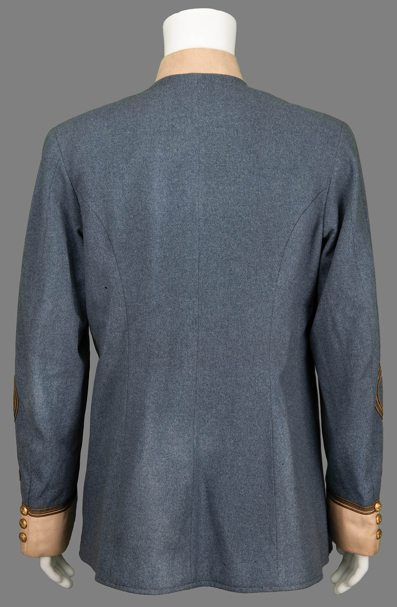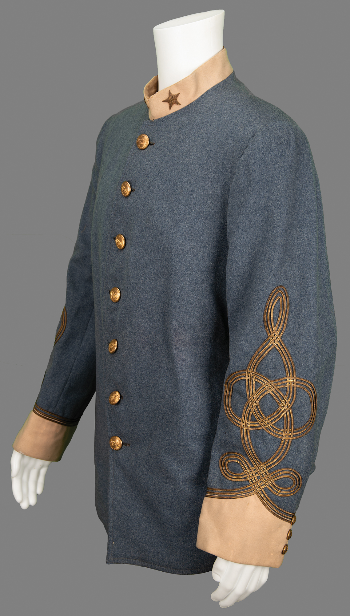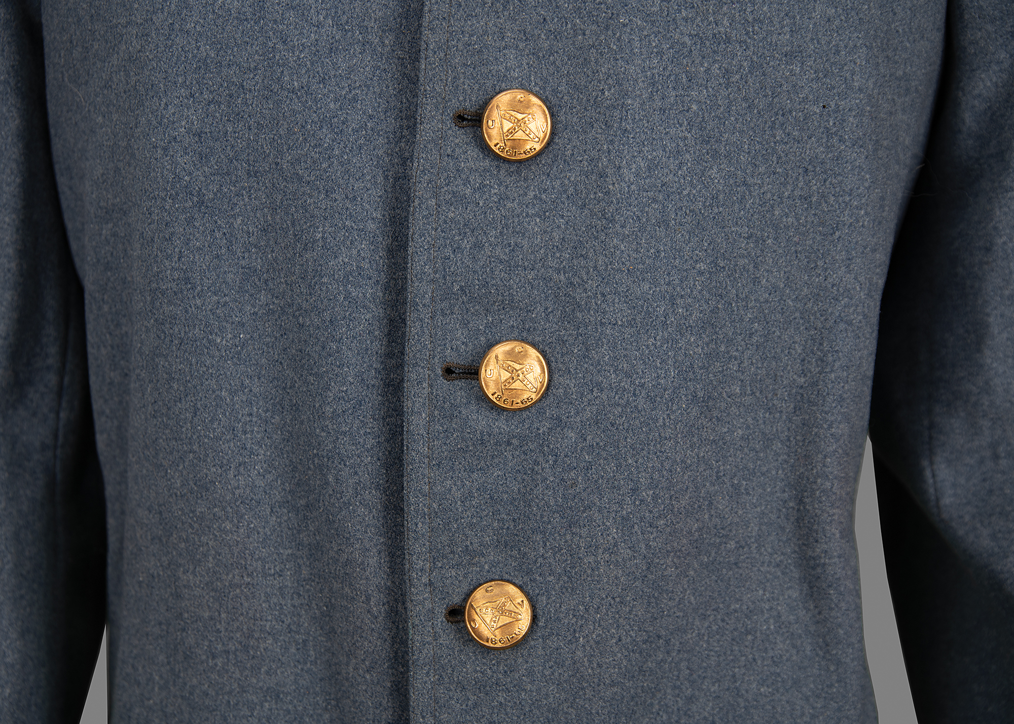 Well-preserved circa early 1900s United Confederate Veterans (UCV) officer’s gray frock coat made by M. C. Lilley & Company of Columbus, Ohio, with the collar bearing a single gold-wire bullion star to either side, indicating the rank of a Confederate Major. The front features seven gold-tone buttons, and both nonfunctioning cuffs bear three buttons, all of which are marked “UCV” around a Confederate flag with dates, “1861-65.” The inner collar retains the original M. C. Lilley tag. Included with the coat is a period fabric UCV hand flag, 11.25 x 11.5, with a 32˝ pole. In overall fine condition, with a few small holes to the coat, and some fading to the flag.