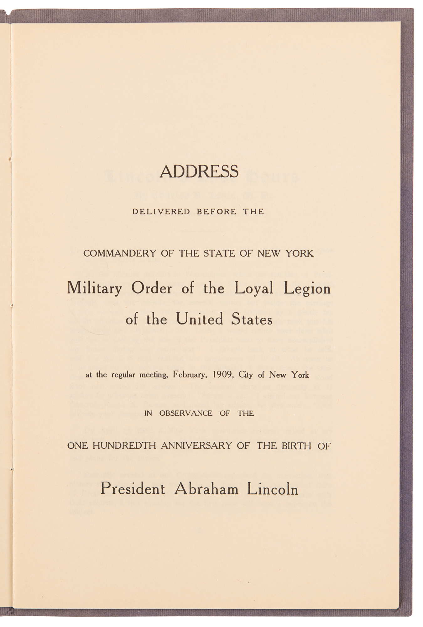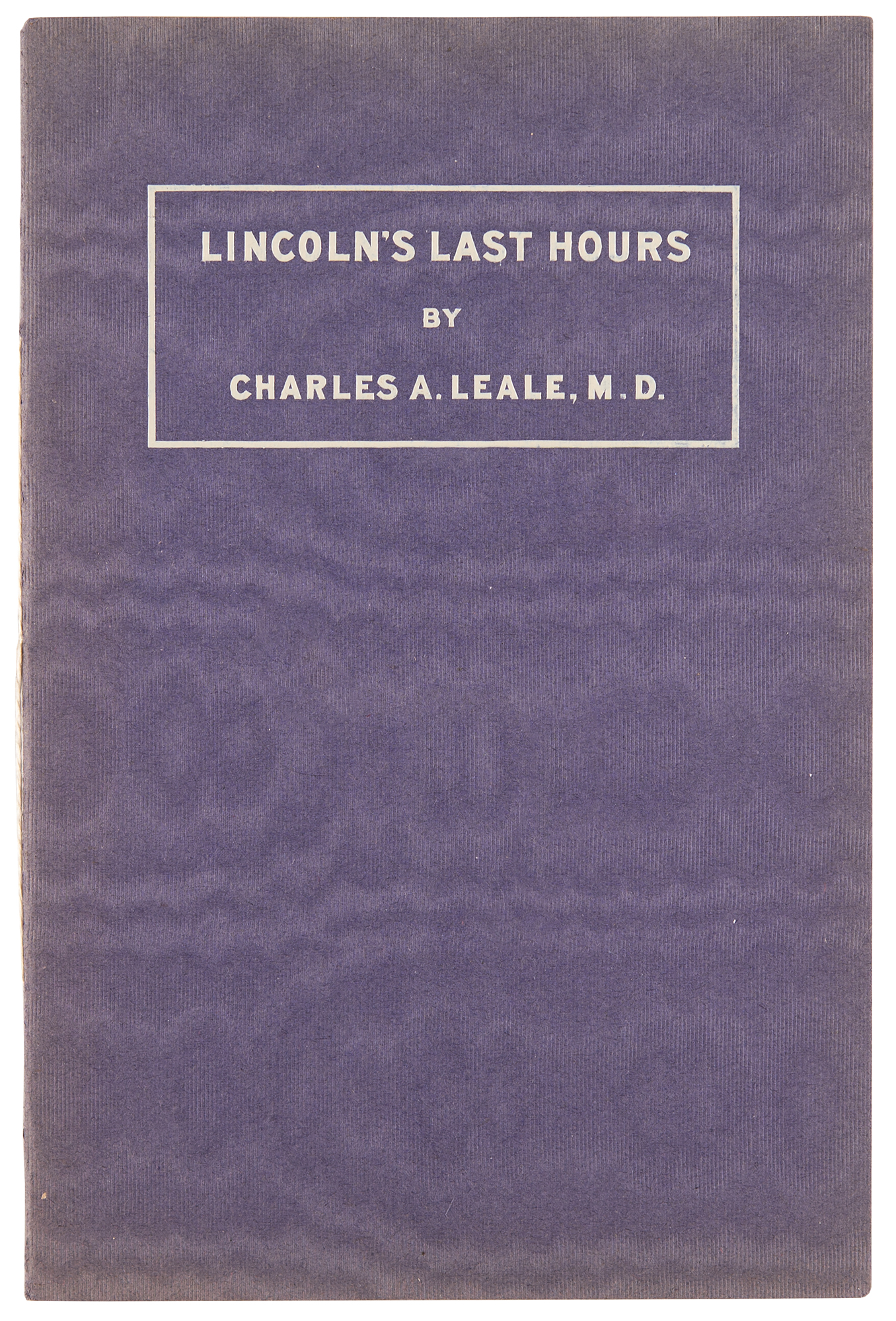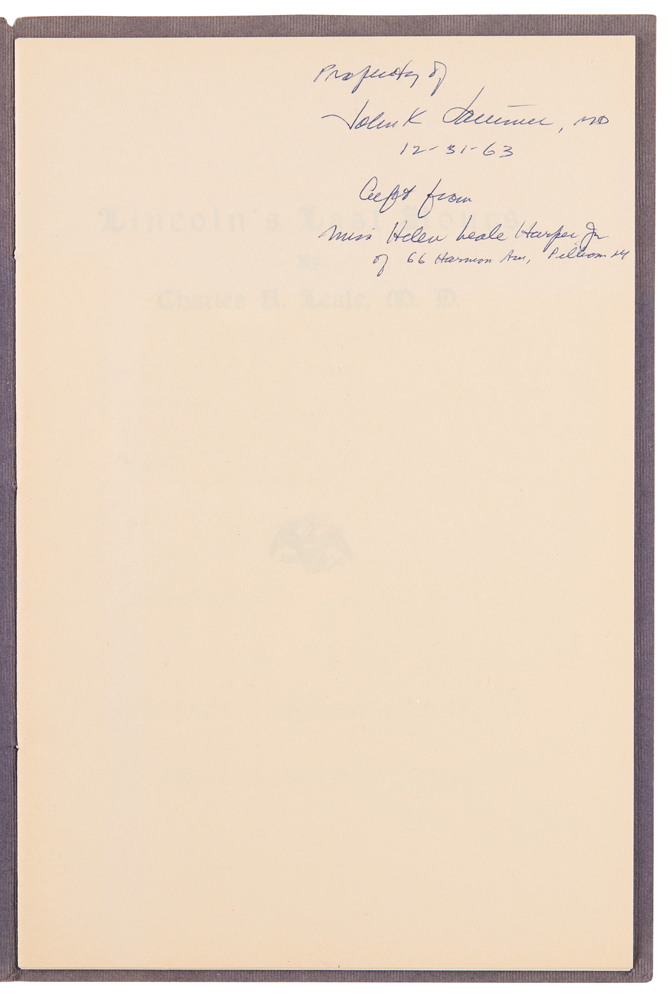 Booklet entitled "Lincoln's Last Hours" by Charles A. Leale, M.D., sixteen pages, 6 x 9.25, containing his address delivered before the Commandery of the State of New York, Military Order of the Loyal Legion of the United States, at the regular meeting in February 1909, in observance of the one hundredth anniversary of the birth of President Abraham Lincoln. Signed on the first free end page in blue ballpoint with the ownership signature of Dr. John Lattimer, "Property of John K. Lattimer, MD, 12-31-63, Gift from Miss Helen Leale Harper, Jr." Dr. John K. Lattimer was a prolific, world-renowned collector and researcher of the Lincoln and Kennedy assassinations; a good deal of his Lincoln collection was sourced through Helen Leale, granddaughter of Charles Leale, the first doctor to arrive at the presidential box at Ford's Theatre after President Abraham Lincoln was shot on April 14, 1865. In fine condition.