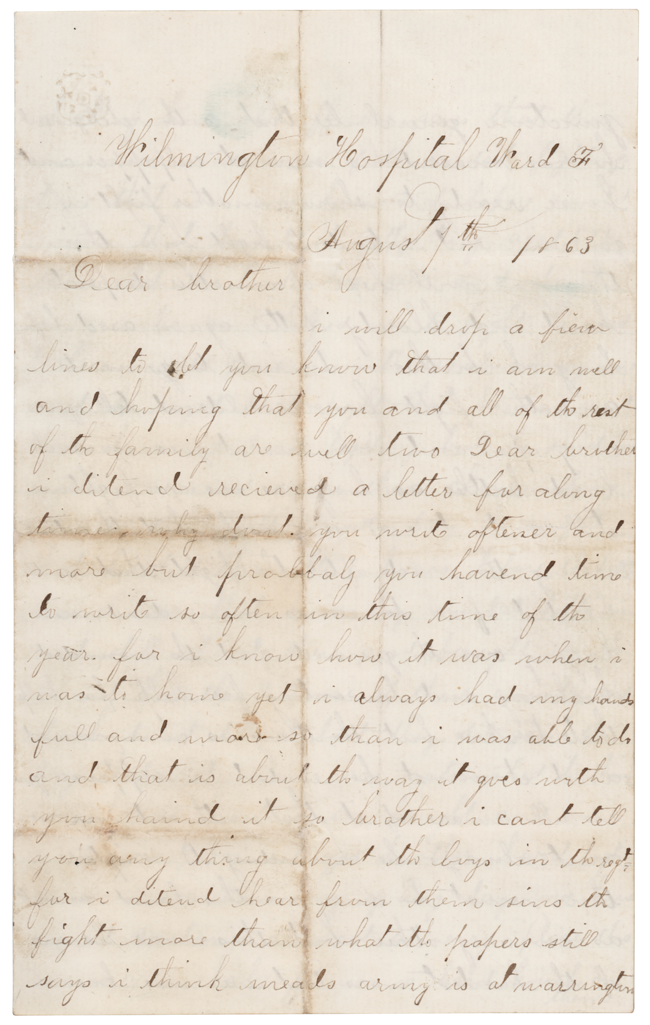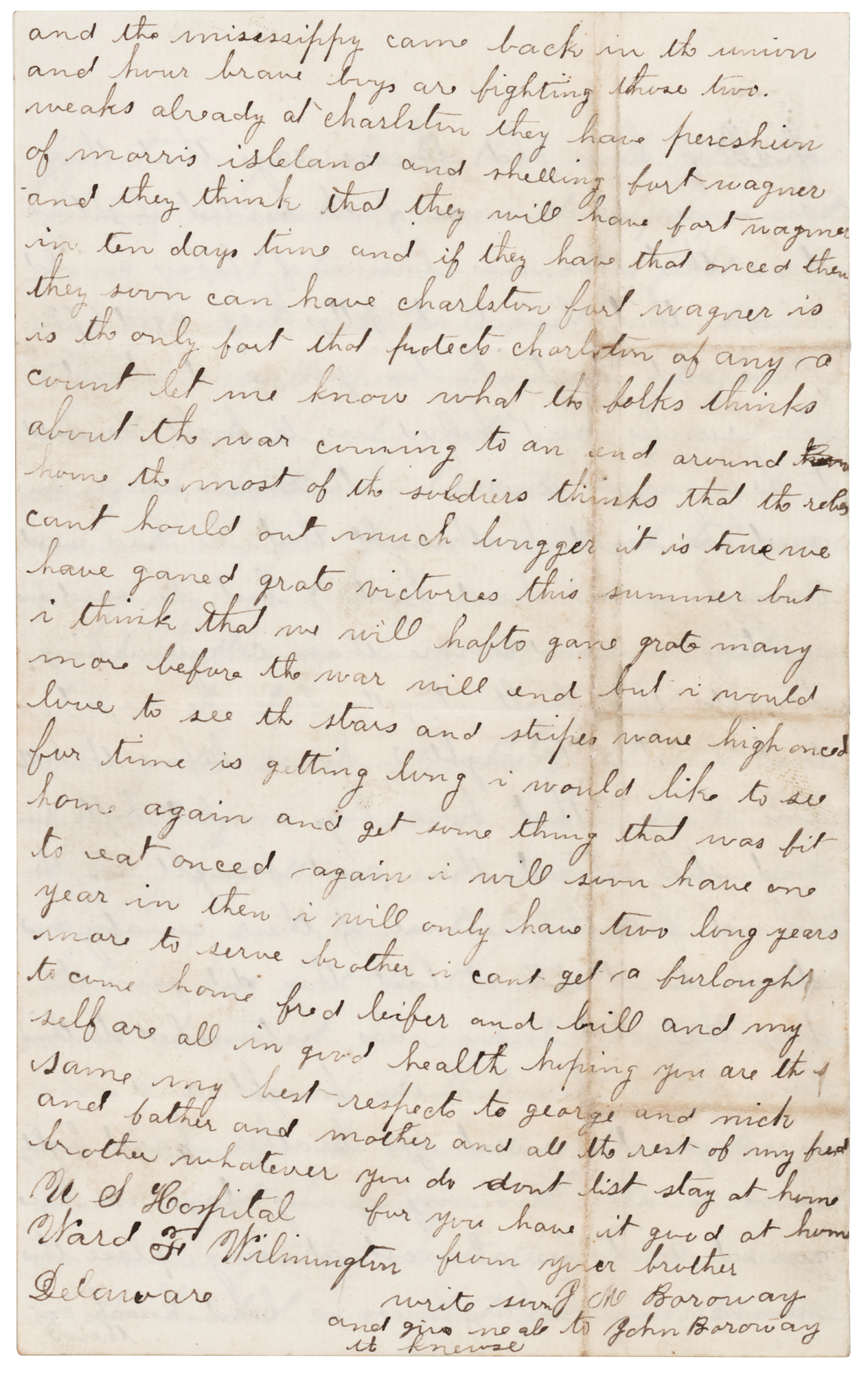We have gained victories always at every place this summer. Vicksburg was a hard knock on them and the Mississippi came back in the Union and our brave boys are fighting those 2 weeks already at Charleston. They have possession of Morris Island and shelling Fort Wagner and they think that they will have Fort Wagner in ten days time and if they have that need, then they soon can have Charleston. Fort Wagner is the only fort that protects Charleston of any account. Let me know what the folks think of the war coming to an end around home. The most of the soldiers think that the Rebs can't hold out much longer. It is true that we have gained great victories this summer but I think that we will have to give great many more before the war will end, but I would love to see the stars and stripes wave high once for time is getting long. I would like to see home again and get something that was fit to eat once again. I will soon have one year in then I will only have two more long years to serve. Brother I can't get a furlough to come home…Brother whatever you do don't enlist. Stay at home for you have it good at home." In fine condition, with toning to intersecting folds.