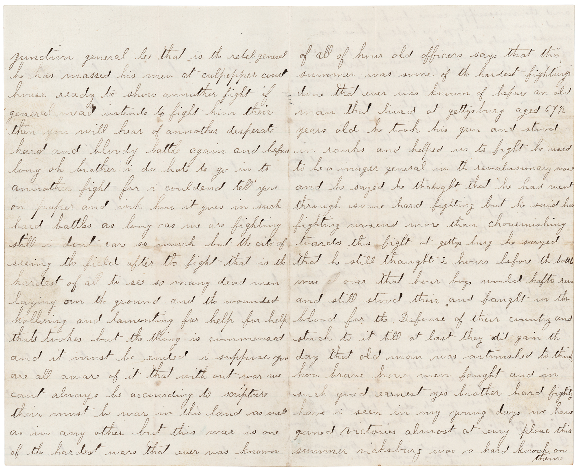 I suppose you are aware of it that without war we can't always be according to Scripture. There must be war in this land as well as in any other but this war is one of the hardest wars that ever was known…All of our old officers says that this summer was some of the hardest fighting done that ever was known of before. An old man that lived at Gettysburg aged 67 1/2 years old took his gun and stood in ranks and helped us fight. He used to be a Major General in the Revolutionary War and he said he thought that he had went through some hard fighting but he said his fighting wasn't more than skirmishing towards this fight at Gettysburg. He said that he still thought 2 hours before the battle was over that our boys would have to run and still stood there and fought in the blood for the defense of their country and stuck to it till at last they did gain the day. That old man was astonished to think how brave our men fought and in such good earnest…