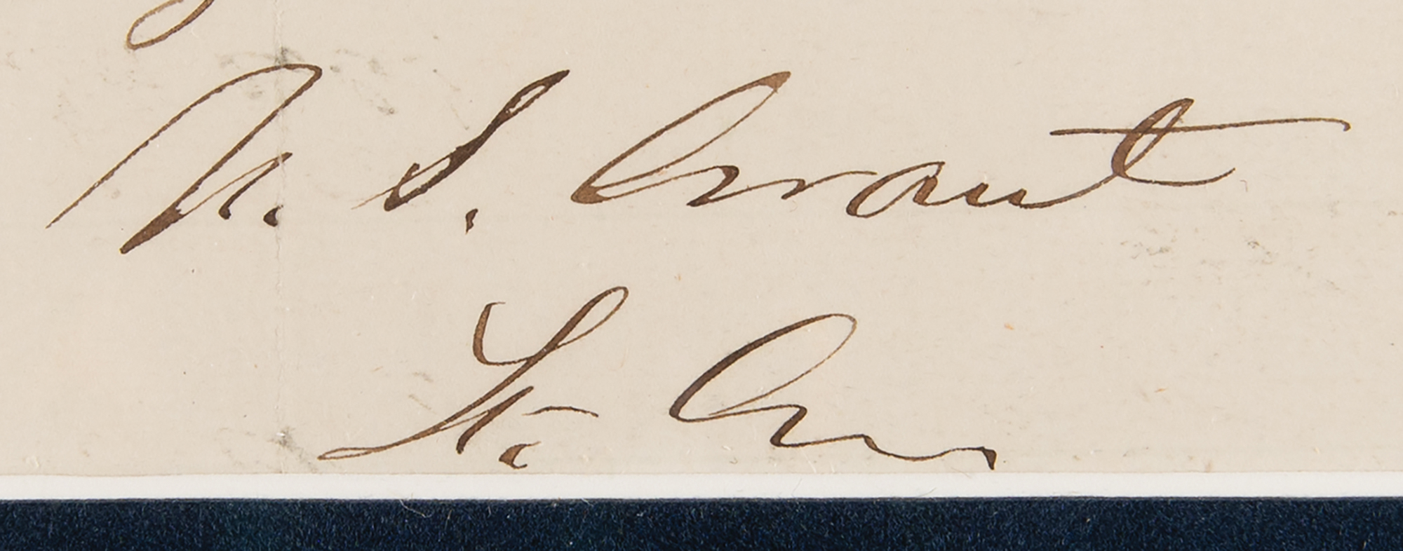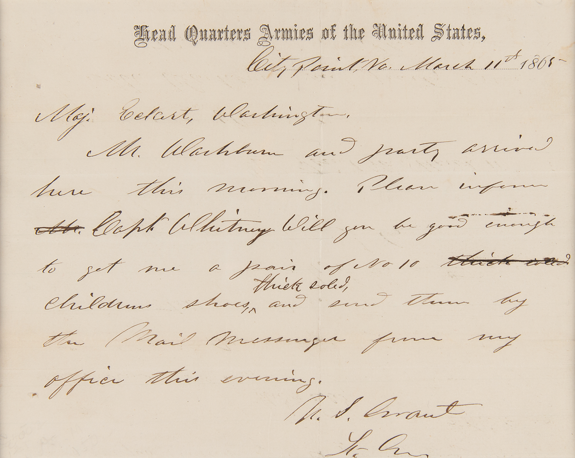 Civil War-dated ALS signed “U. S. Grant, Lt. Gen.,” one page, 7.5 x 6, Head Quarters Armies of the United States letterhead, March 11, 1865. Handwritten letter to "Maj. Eckert," in full: "Mr. Washburne and party arrived here this morning. Please inform Capt. Whitney. Will you be good enough to get me a pair of No. 10 children's shoes, thick soled, and send them by the mail messenger from my office this evening." Suede-matted and framed with two portraits and a nameplate to an overall size of 22.5 x 21. In fine condition.
