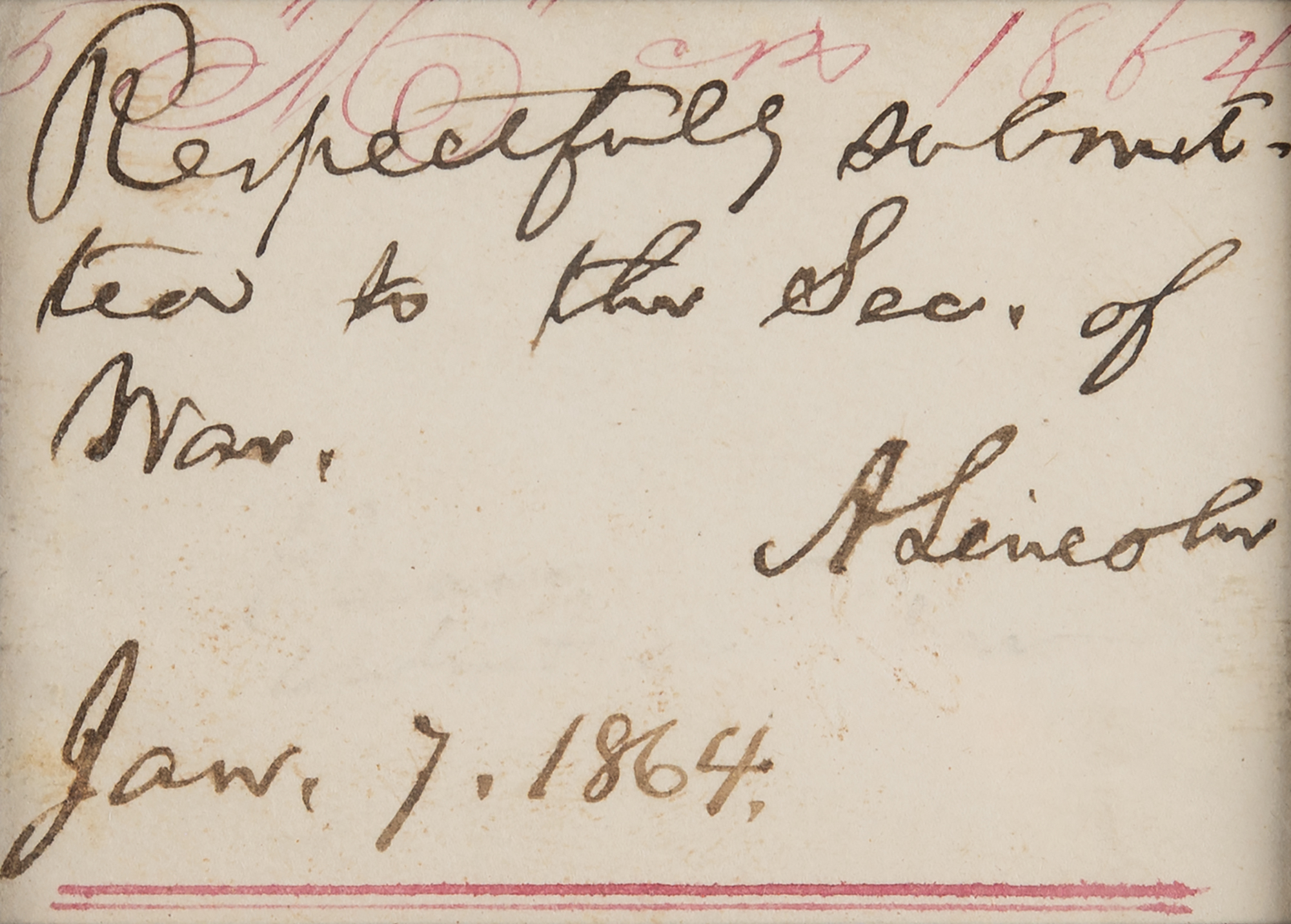 Civil War-dated handwritten endorsement signed as president, "Respectfully submitted to the Sec. of War. A. Lincoln, Jan. 7, 1864," on an off-white 2.5 x 1.75 sheet clipped from a document. Double-matted and framed with an engraved portrait of Abraham Lincoln to an overall size of 10.25 x 15.25. Frame backing bears a copy of the original 1977 receipt from B. Altman and Company. In fine condition.