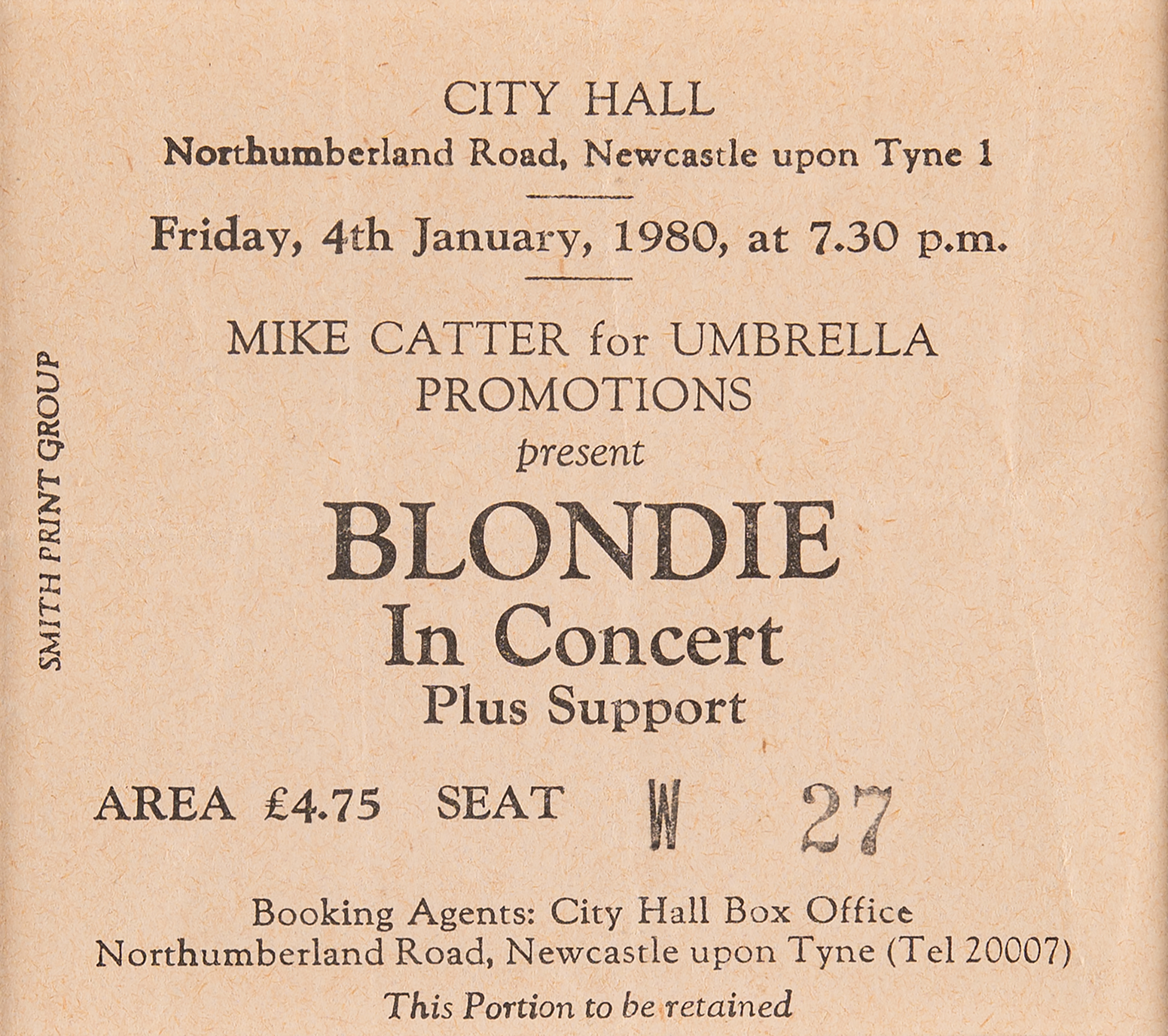 Chrysalis Records 45 RPM record sleeve for the Blondie single 'Union City Blue,' signed in blue ballpoint by Debbie Harry, Clem Burke, Chris Stein, Jimmy Destry, Nigel Harrison, and Frank Infante. Matted with the original ticket stub from the show at which the autographs were obtained (City Hall, Newcastle upon Tyne, January 4, 1980) and a band photo to an overall size of 19.5 x 15.75. In very good to fine condition, with some light creasing.