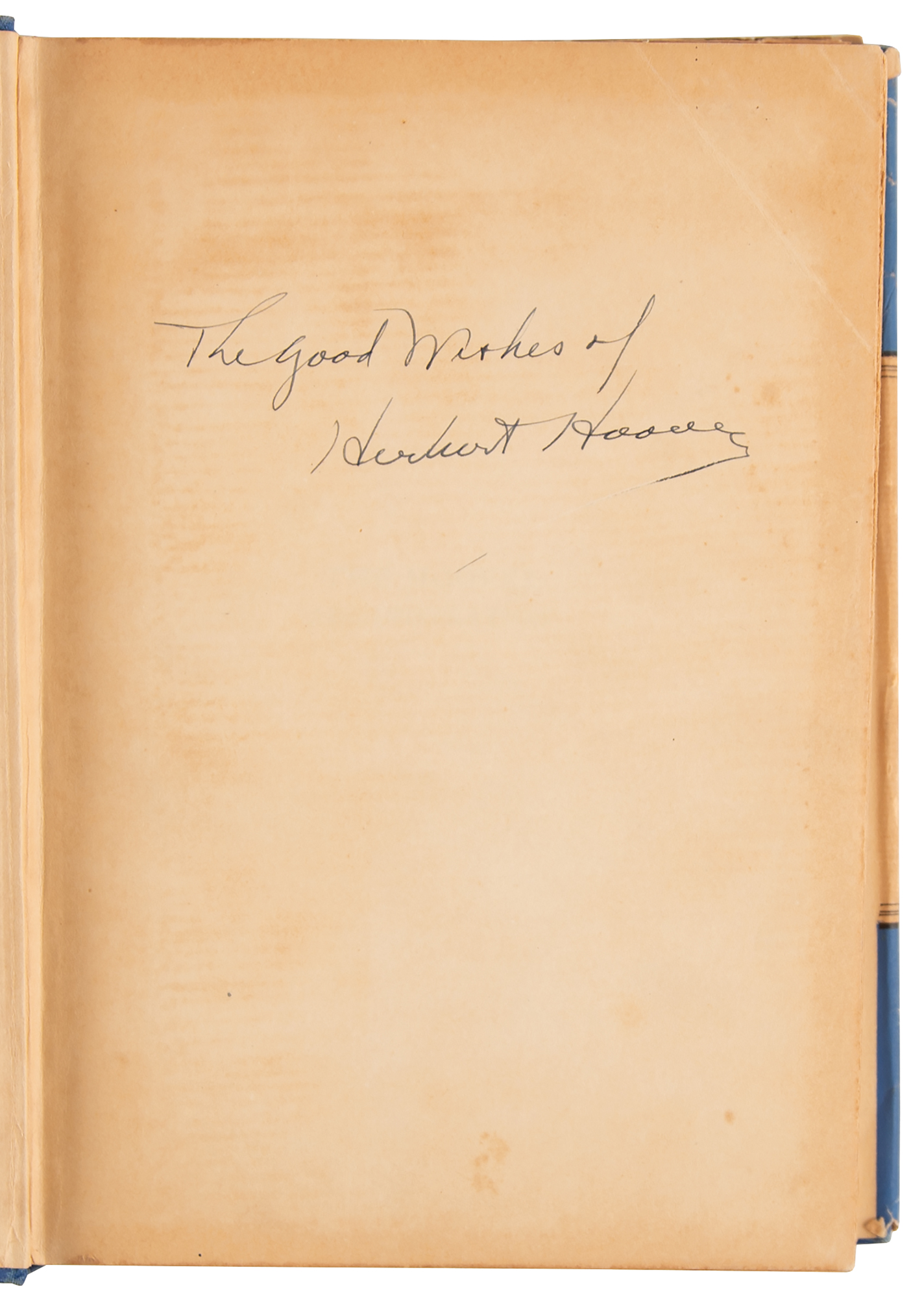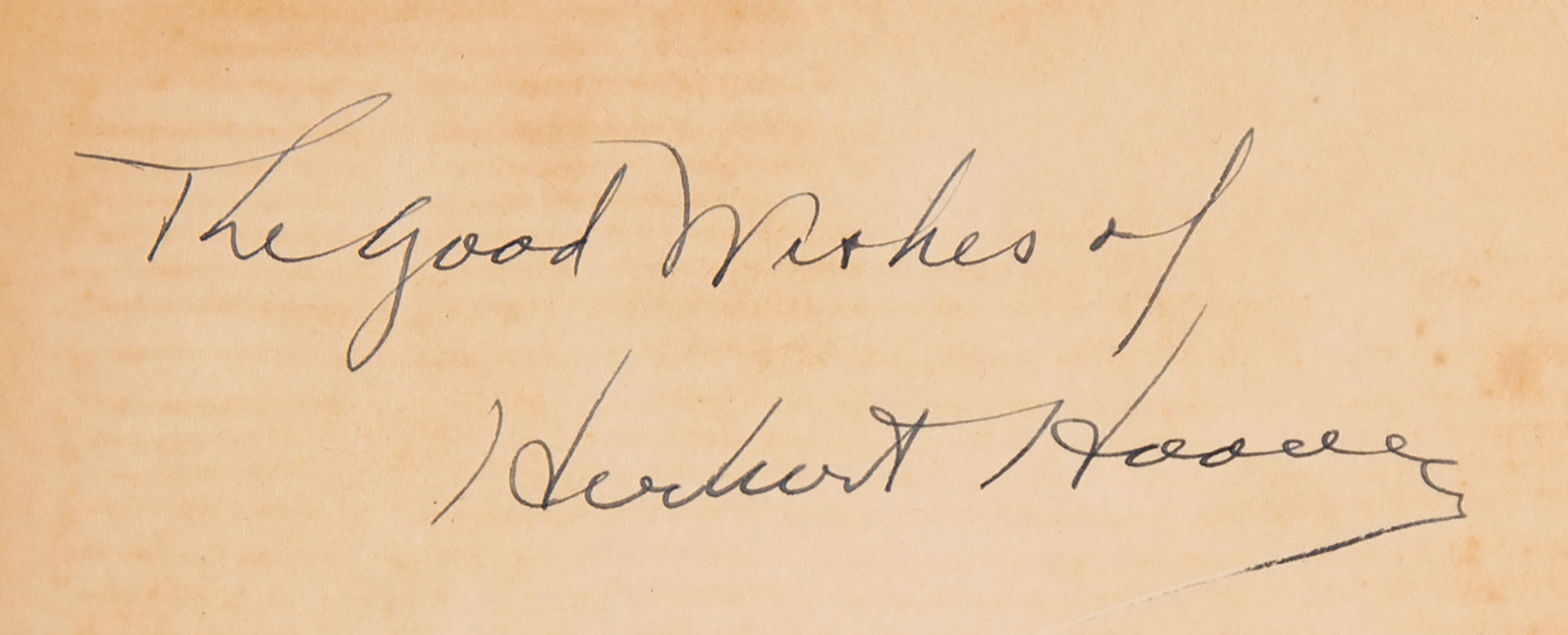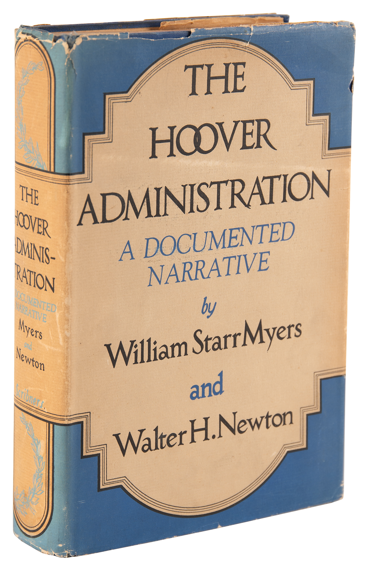 Signed book: The Hoover Administration: A Documented Narrative. First edition. NY: Charles Scribner's Sons, 1936. Hardcover with dust jacket, 6.5 x 9.5, 553 pages. Signed on the first free end page in fountain pen, "The good wishes of Herbert Hoover." In very good condition, with soiling and tears to the dust jacket, and irregular toning and staining to the signed page and pastedowns.