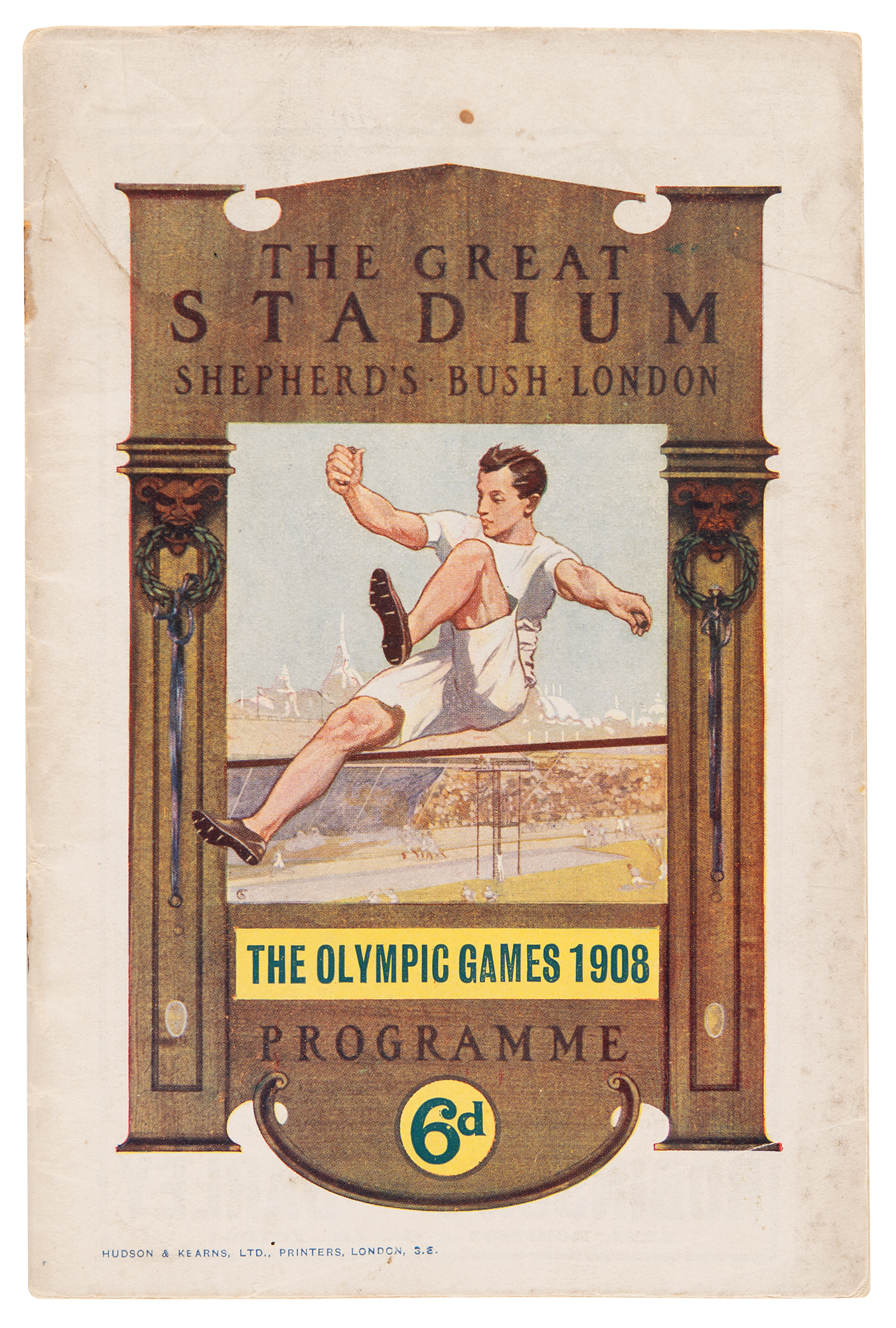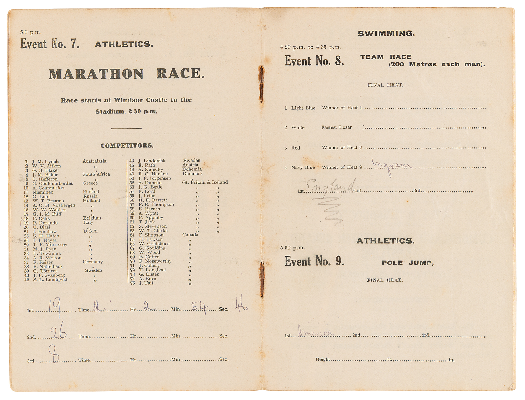 Program for the eleventh day of the 1908 Olympic Games held in London, England, 4.75 x 7.25, July 24, 1908. The program lists the ten events for the day—including the marathon, wrestling, swimming, the pole vault, and relay races—as well as the names of participating athletes, the day’s music and fireworks schedules, general rules, records, and prizes. In very good to fine condition, with light soiling, contemporary annotations inside, and the cover detached from the spine's upper staple.