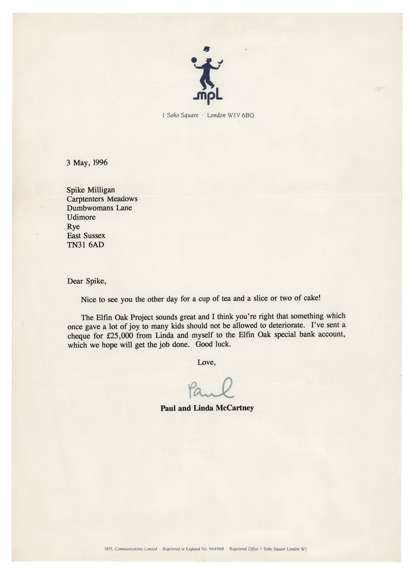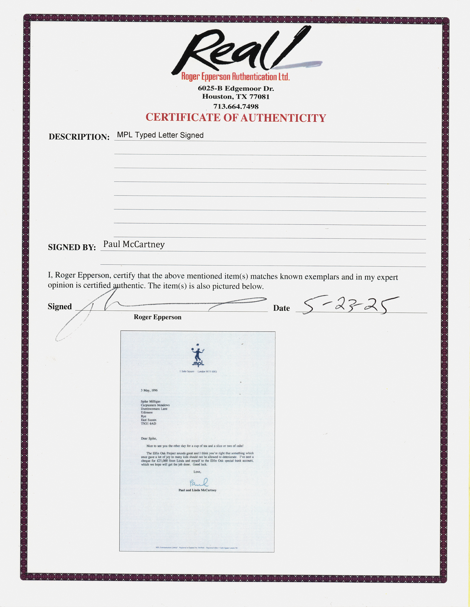 TLS signed “Paul,” one page, 8.25 x 11.75, MPL letterhead, May 3, 1996. Letter to famed comedian Spike Milligan, in full: “Nice to see you the other day for a cup of tea and a slice or two of cake! The Elfin Oak Project sounds great and I think you're right that something which once gave a lot of joy to many kids should not be allowed to deteriorate. I've sent a cheque for £25,000 from Linda and myself to the Elfin Oak special bank account, which we hope will get the job done. Good luck." In very good to fine condition, with light overall creasing. Accompanied by a full letter of authenticity from REAL.
