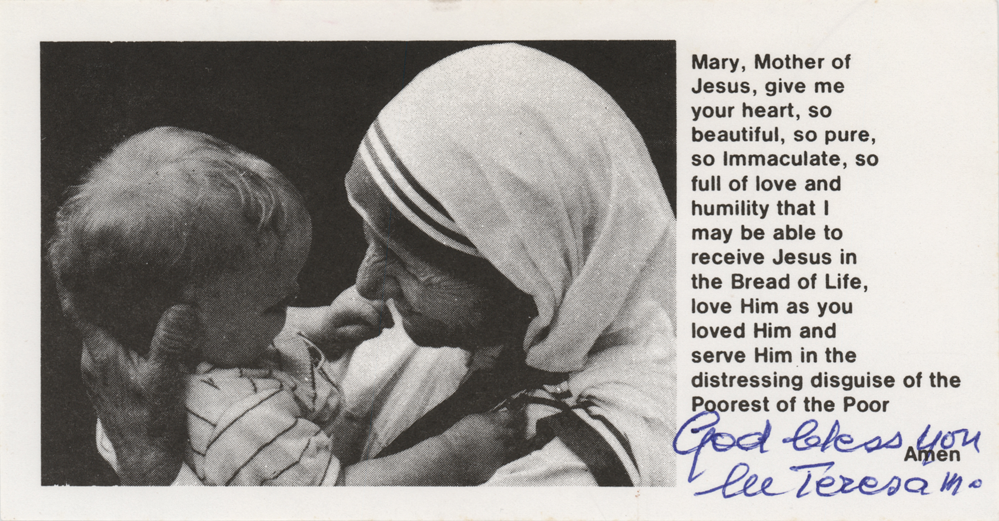 Prayer slip featuring an image of Mother Teresa holding a baby, 6.25 x 3.25, signed at the bottom in blue ballpoint, "God bless you, M Teresa mc." In very fine condition.