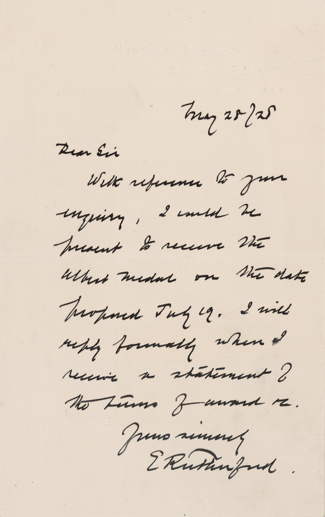 New Zealand-born physicist and chemist (1871–1937) who discovered the concept of radioactive half-life; he was awarded the Nobel Prize in Chemistry in 1908. ALS signed “E. Rutherford,” one page, 4.25 x 7, blindstamped Newnham Cottage letterhead, May 28, 1928. Handwritten letter on his receipt of a medal from the Royal Society, in full: "With reference to your inquiry, I would be present to receive the Albert Medal on the date proposed July 19. I will reply formally when I receive a statement of the terms of award &c." In very fine condition.