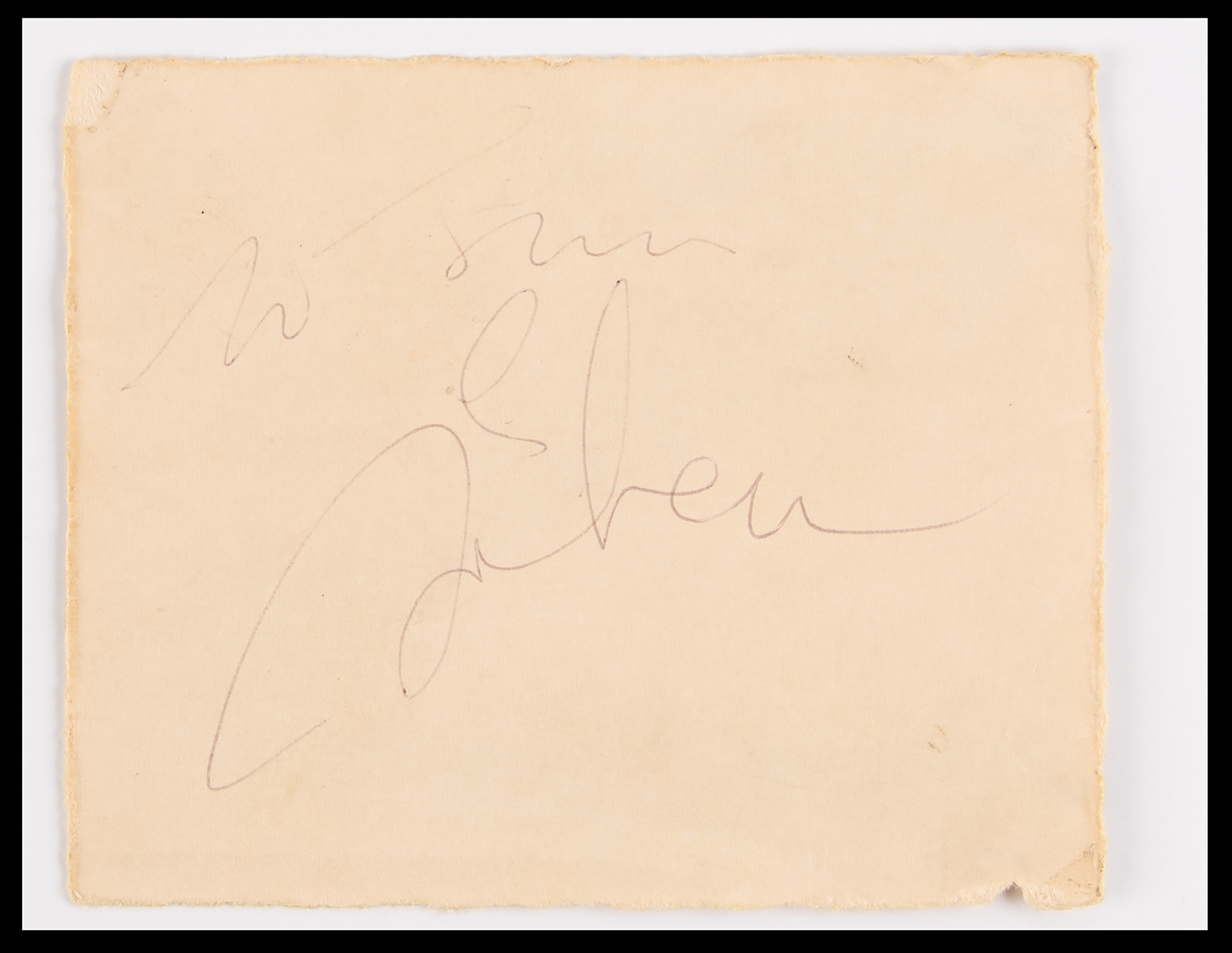 Vintage 1975 ballpoint signature and inscription, “To Jim, John Lennon,” on an off-white 4.75 x 4 sheet, which is lightly affixed to a slightly larger card. Included with the signature is a period spiral-bound photo album, which contains 19 color semi-glossy 5 x 3.5 candid photographs from the WFIL Helping Hand Marathon, with eight photos picturing Lennon at the event. In very good to fine condition, with light creasing, and old mounting residue on the back.