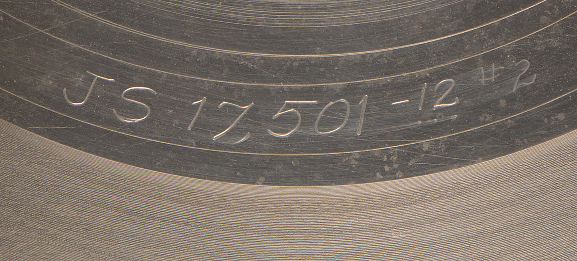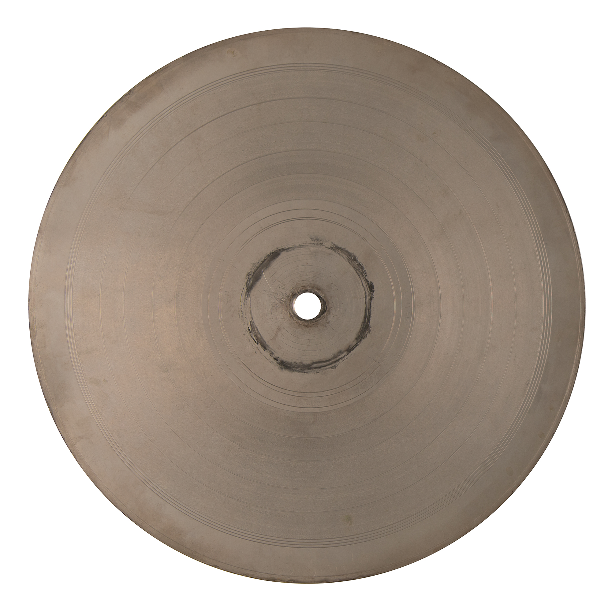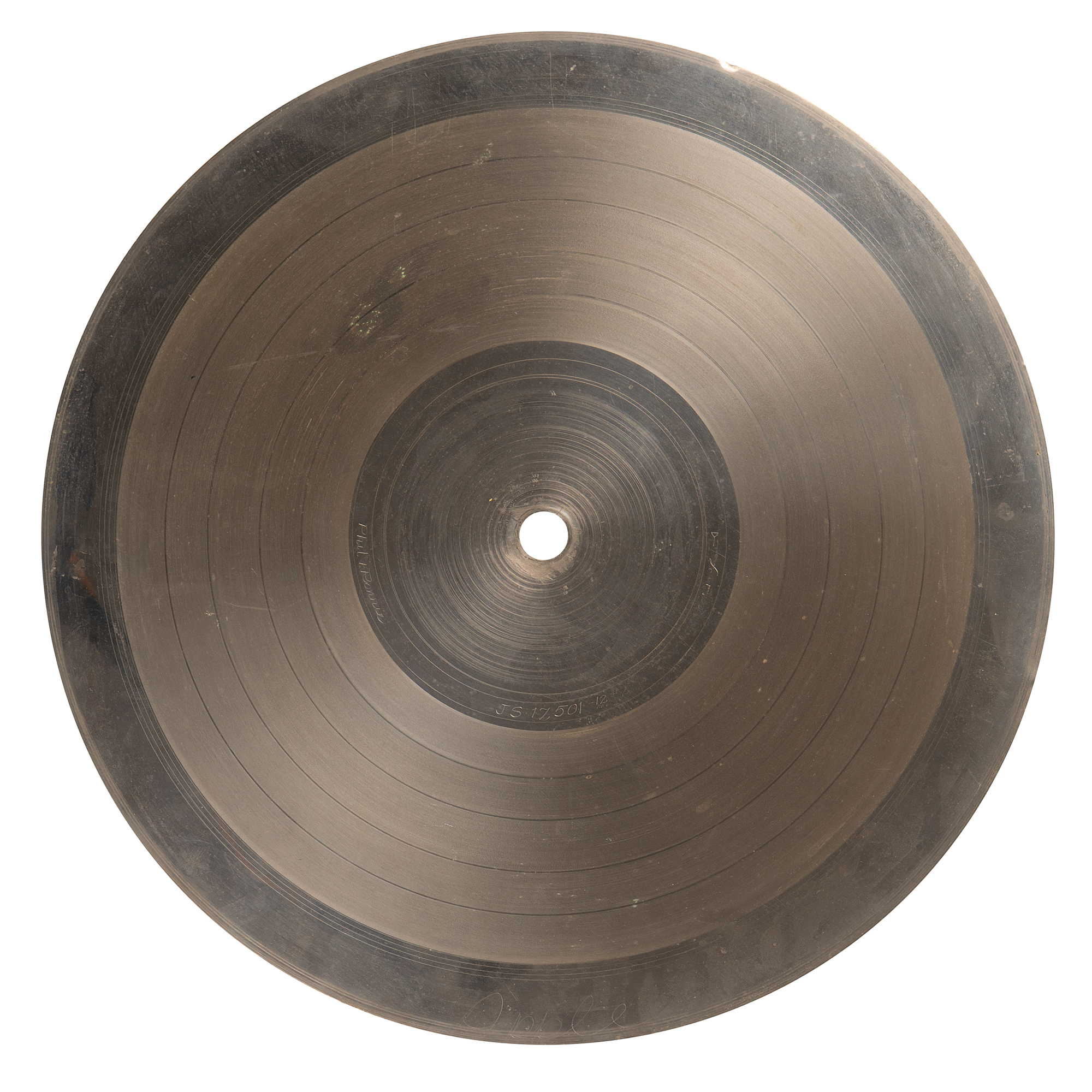 Rare ‘mother disc’ for Side B of the Beatles’s twelfth and final studio album, Let It Be, which was released by Apple Records on May 8, 1970. This metallic disc, 13.5˝, was pressed at the Capitol Records Pressing Plant in Winchester, Virginia (“-◁”), and the lacquer was cut at Bell Sound Studios by engineer Sam Feldman (“sf”). The matrix number in the run-out groove area is stamped “Phil + Ronnie JS-17,501 - 12 #2 Bell Sound sf -◁,” information that points to this disc representing variation #4 of 31 recorded variants of the mother disc from the Winchester plant. The outer ring of the disc is engraved in cursive lettering, “Apple.” In very good to fine condition, with some dings to the edge, and scattered scuffs and marks.