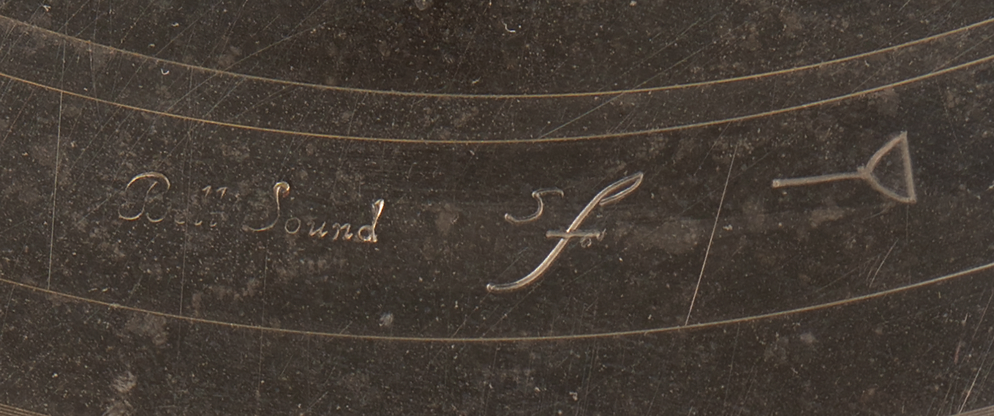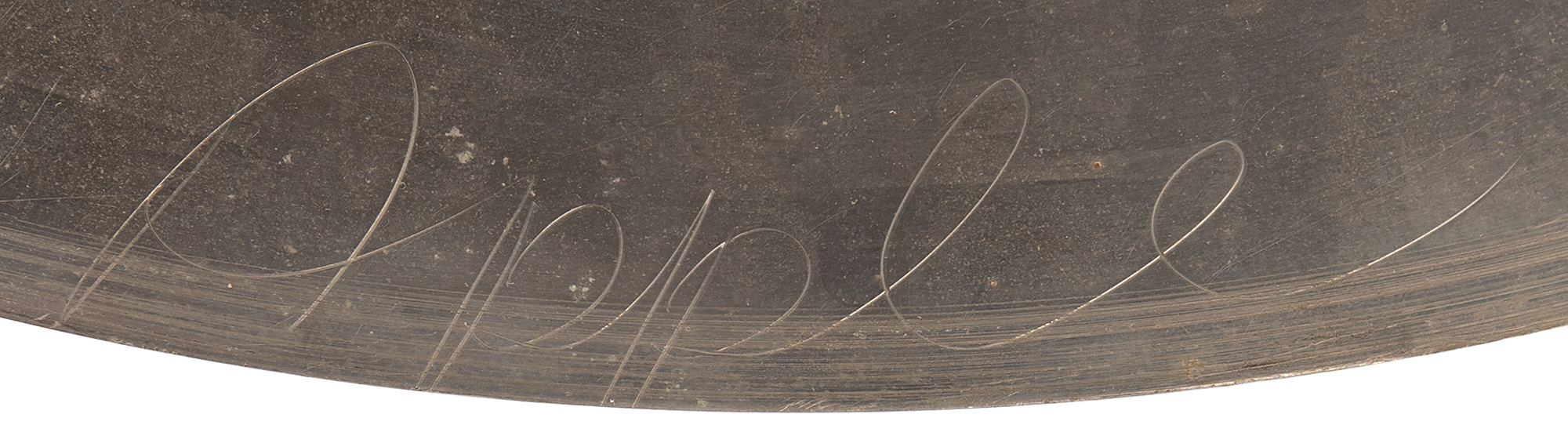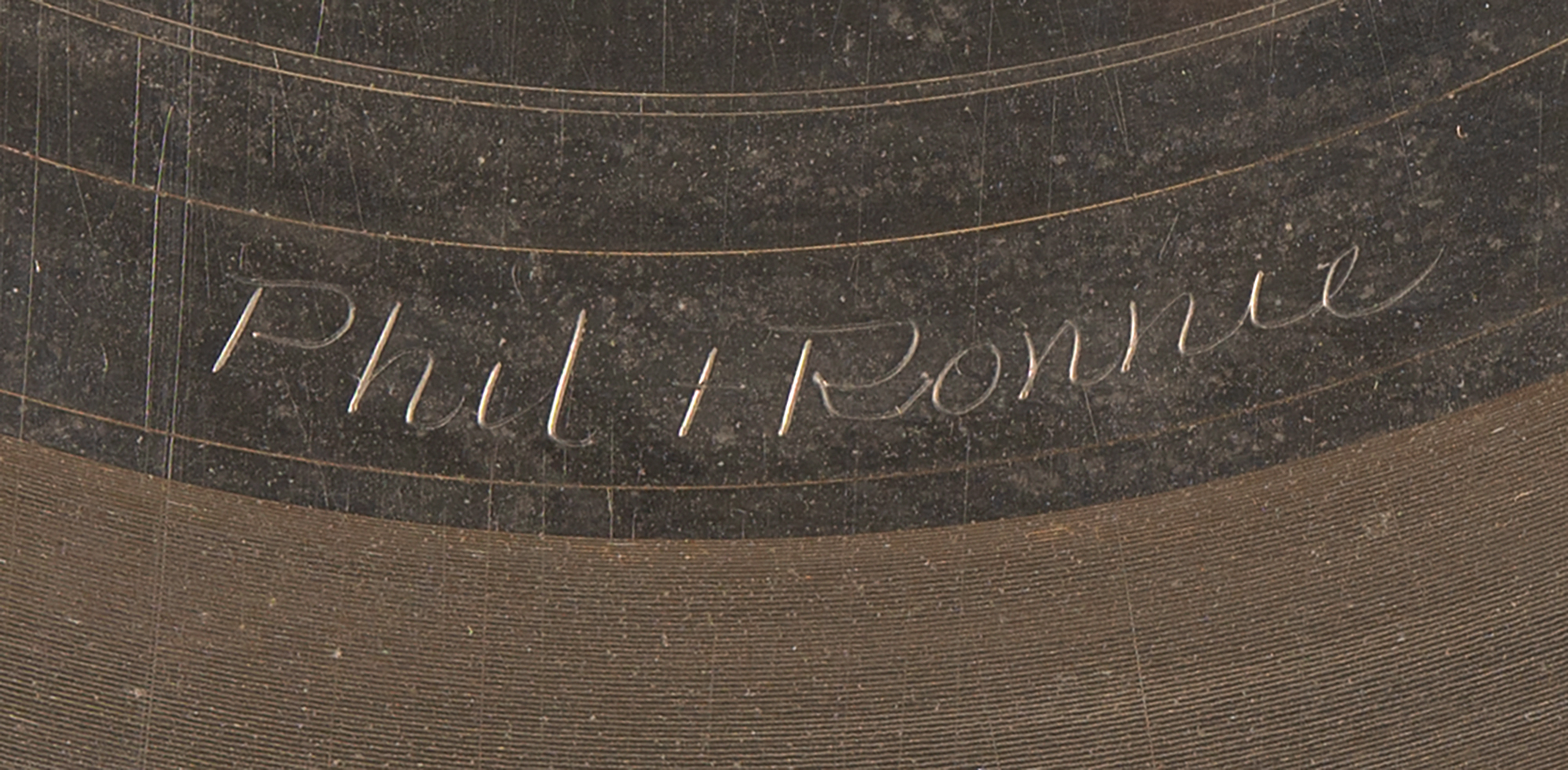 Rare ‘mother disc’ for Side B of the Beatles’s twelfth and final studio album, Let It Be, which was released by Apple Records on May 8, 1970. This metallic disc, 13.5˝, was pressed at the Capitol Records Pressing Plant in Winchester, Virginia (“-◁”), and the lacquer was cut at Bell Sound Studios by engineer Sam Feldman (“sf”). The matrix number in the run-out groove area is stamped “Phil + Ronnie JS-17,501 - 12 #2 Bell Sound sf -◁,” information that points to this disc representing variation #4 of 31 recorded variants of the mother disc from the Winchester plant. The outer ring of the disc is engraved in cursive lettering, “Apple.” In very good to fine condition, with some dings to the edge, and scattered scuffs and marks.