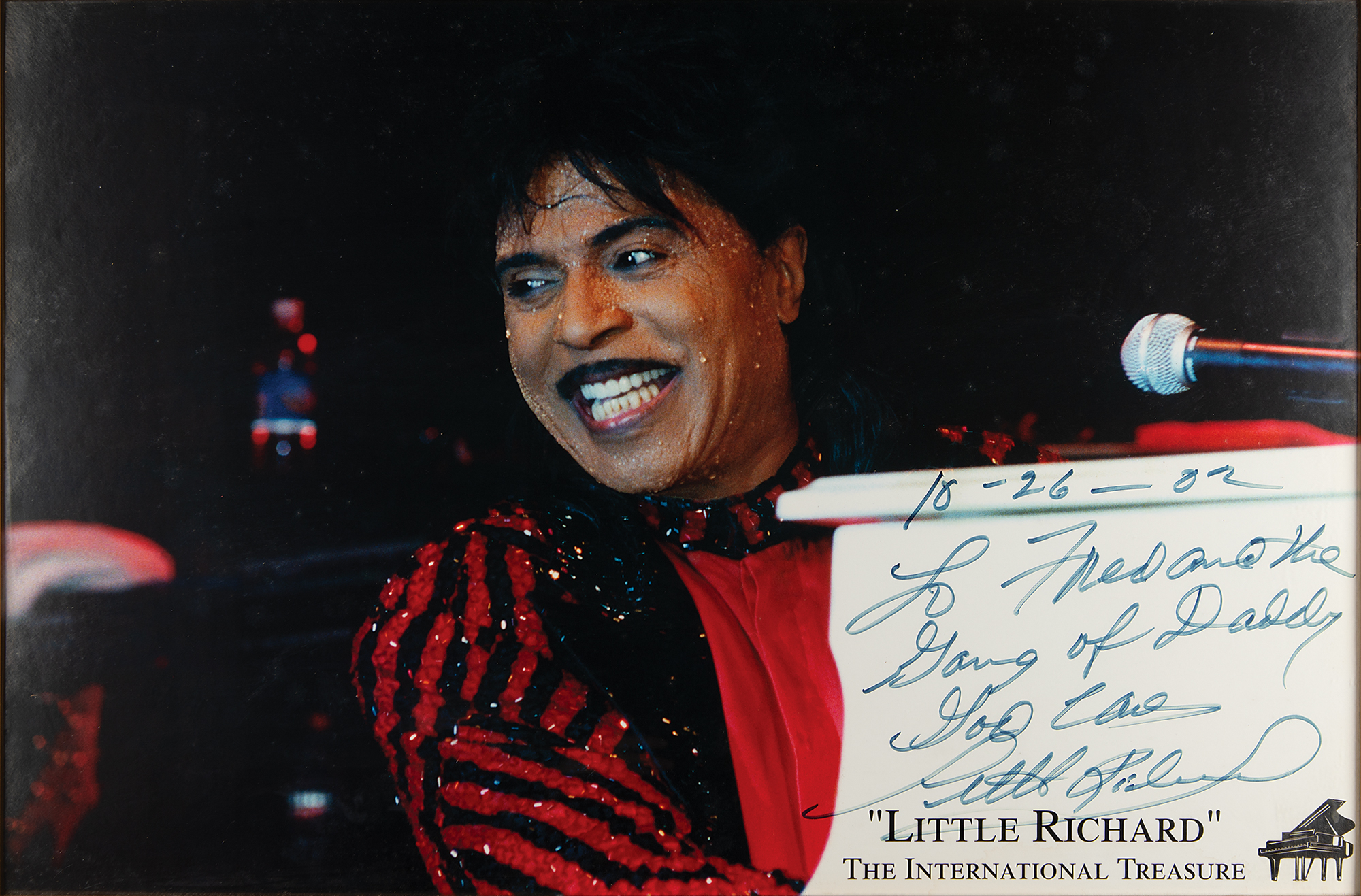 Color 29.5 x 19.5 poster entitled "'Little Richard,' The International Treasure," which shows the rock and roll pioneer seated and smiling from behind his piano, signed and inscribed in black felt tip, "10-26-02, To Fred and the Gang of Daddy, God bless, Little Richard." Framed and in fine condition.
