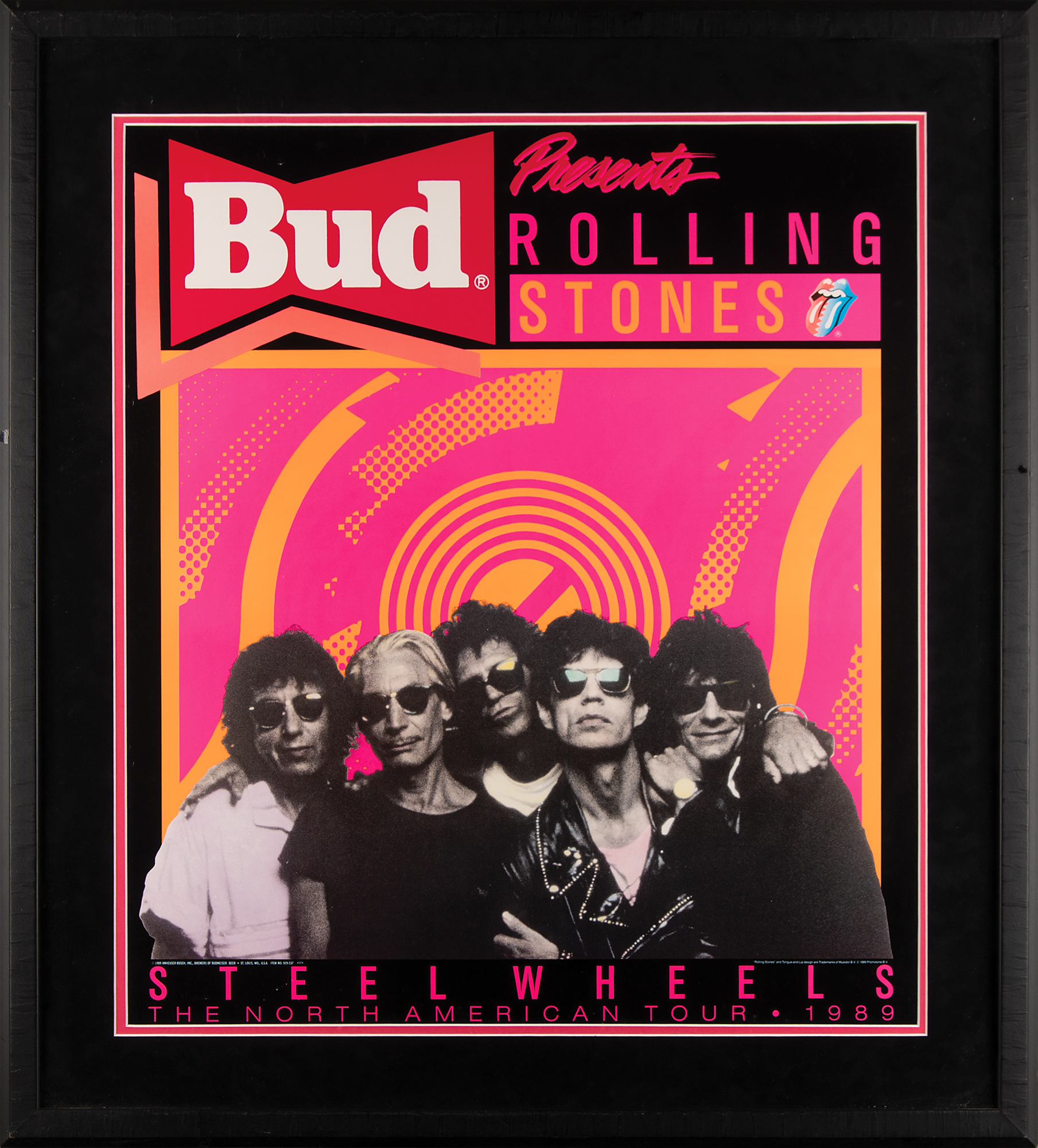 Large color 21.75 x 24.75 Annheuser-Busch promotional poster for the Rolling Stones’ 1989 North American Tour in support of their album, Steel Wheels, which shows a group image of the band all wearing sunglasses against a vibrant pink and orange backdrop, with the upper portion reading: “Bud Presents Rolling Stones.” Double-matted and framed to an overall size of 28.5 x 31.5. In fine condition.