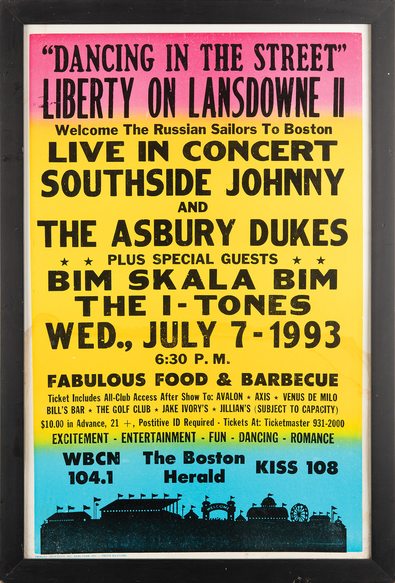 Colorful boxing-style 16.5 x 25.5 ‘misprint’ poster for the “‘Dancing in the Street,’ Liberty on Lansdowne II” concert held in Boston, Massachusetts, on July 7, 1993, a show headlined by “Southside Johnny and The Asbury Dukes,” which should read ‘Jukes.’ The concert, aimed at welcoming “Russian Soldiers to Boston,” lists Bim Skala Bim and The I-Tones as the special guests, and WBCN 104.1, The Boston Herald, and KISS 108 as the main sponsors. Framed and in very good to fine condition, with light dampstaining the lower half.