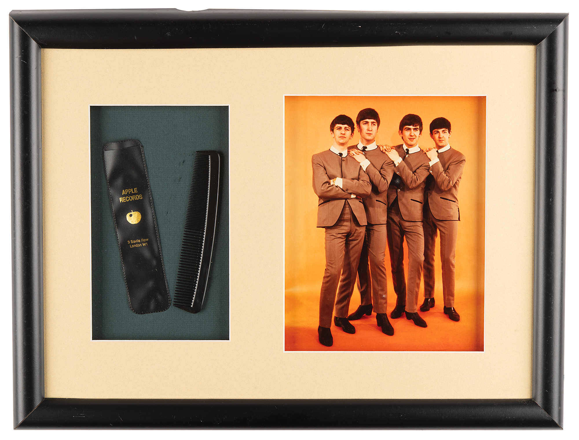 Two Beatles items: an original Apple Records black hair comb, 6˝ in length, with original black sleeve marked in gold text, “Apple Records, 3 Savile Row, London W1”; and a color glossy 7.25 x 9.25 photo of the Beatles wearing their famous gray collarless suits during a Dezo Hoffmann photo shoot at his Wardour Street studio in London, England, in April 1963. The consignor attests that the comb was removed from the walls of the Apple Boutique in London, when it officially closed on July 31, 1968. Both are matted and framed together to an overall size of 20.25 x 15.25. In overall fine condition.
