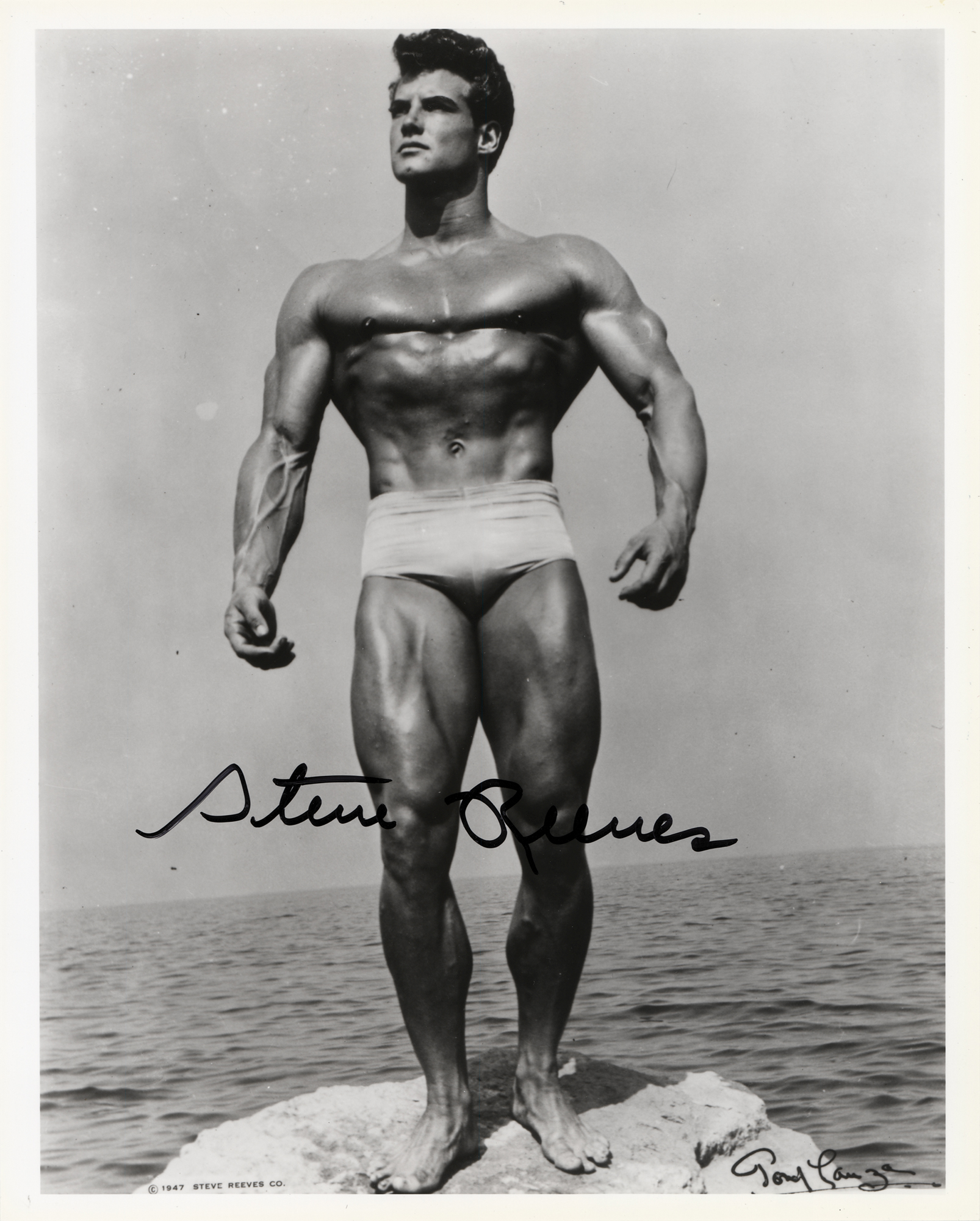 Glossy 8 x 10 photo of Steve Reeves posing near the ocean in a mighty full-length pose, signed in black felt tip. In very fine condition. Originally obtained by in-person specialist Mike Wehrmann.