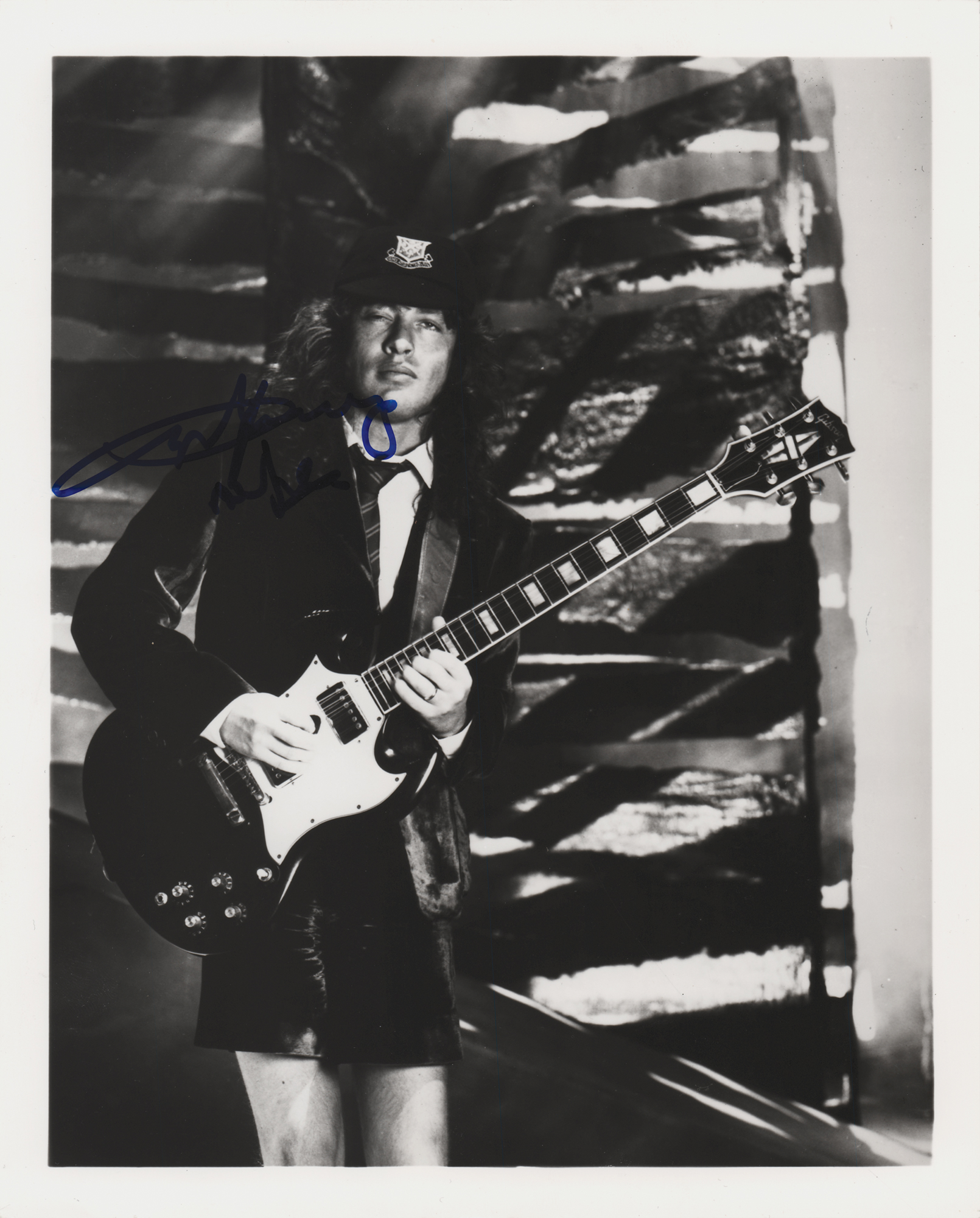 Glossy 8 x 10 photo of the AC/DC co-founder and lead guitarist in a great three-quarter-length pose, signed in blue felt tip, "Angus Young, AC/DC." In very fine condition. Originally obtained by in-person specialist Mike Wehrmann.