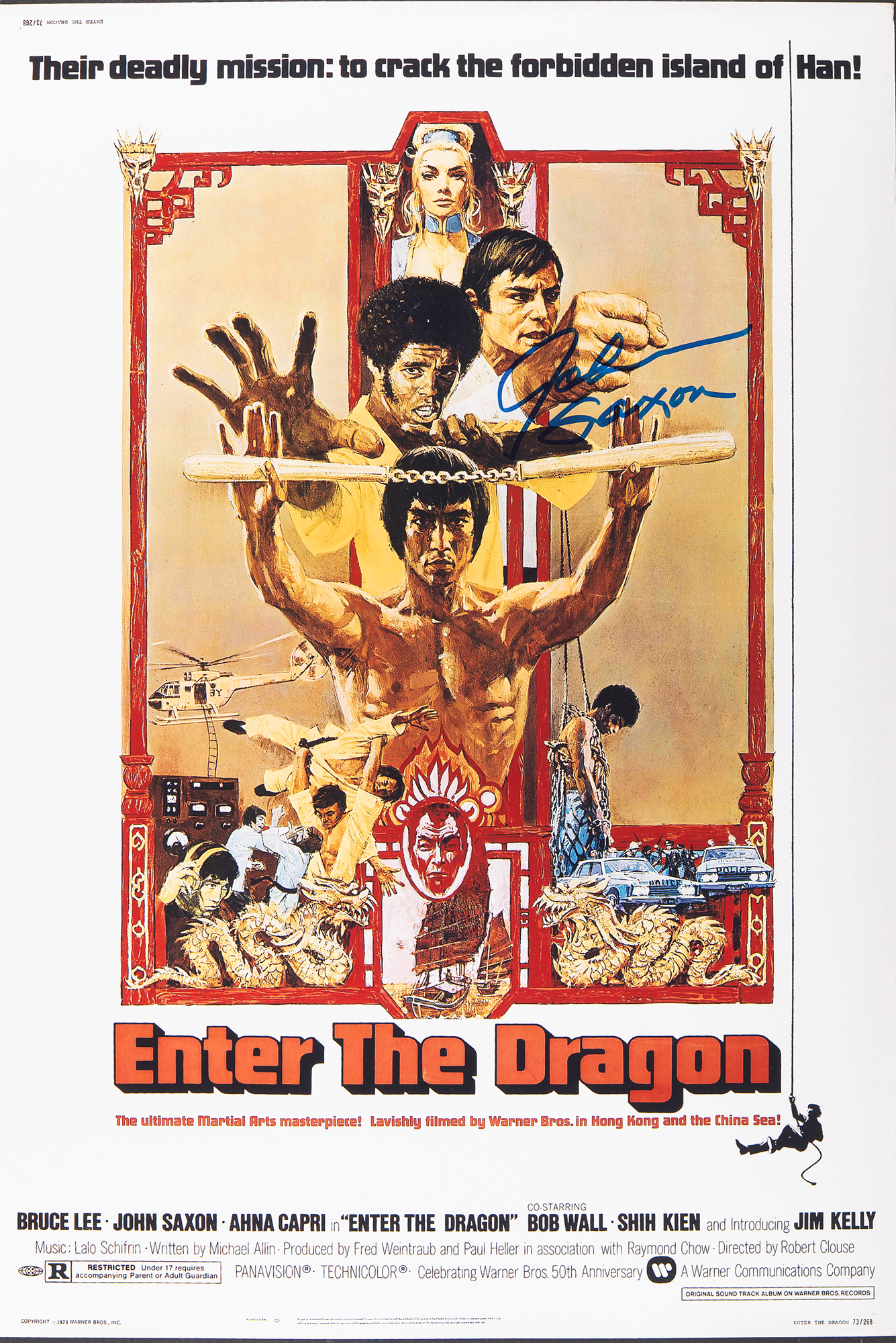 Color satin-finish 12 x 18 photo of the movie poster for the classic Bruce Lee film Enter the Dragon, signed in blue felt tip by John Saxon. In fine condition. Originally obtained by in-person specialist Mike Wehrmann.