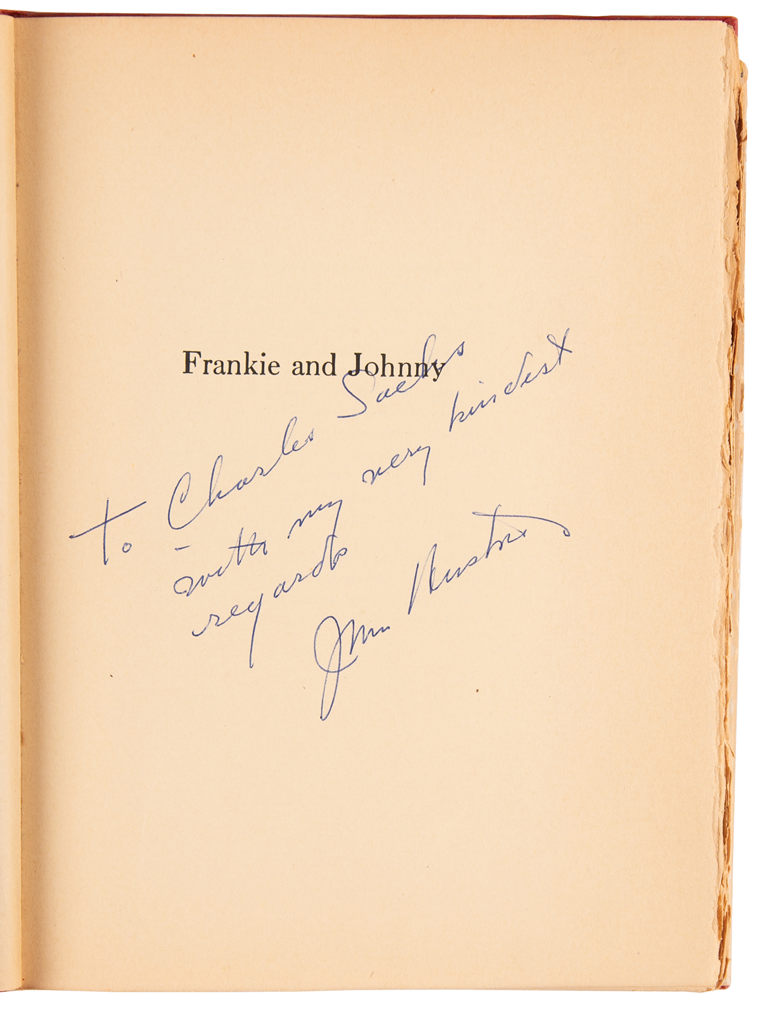 Signed book: Frankie and Johnny. First edition. NY: Albert & Charles Boni, 1930. Hardcover with dust jacket, 6.5 x 8.5, 160 pages. Signed and inscribed on the half-title page in blue ballpoint, "To Charles Sachs, with my very kindest regards, John Huston." In very good to fine condition, with substantial wear and paper loss to the dust jacket.