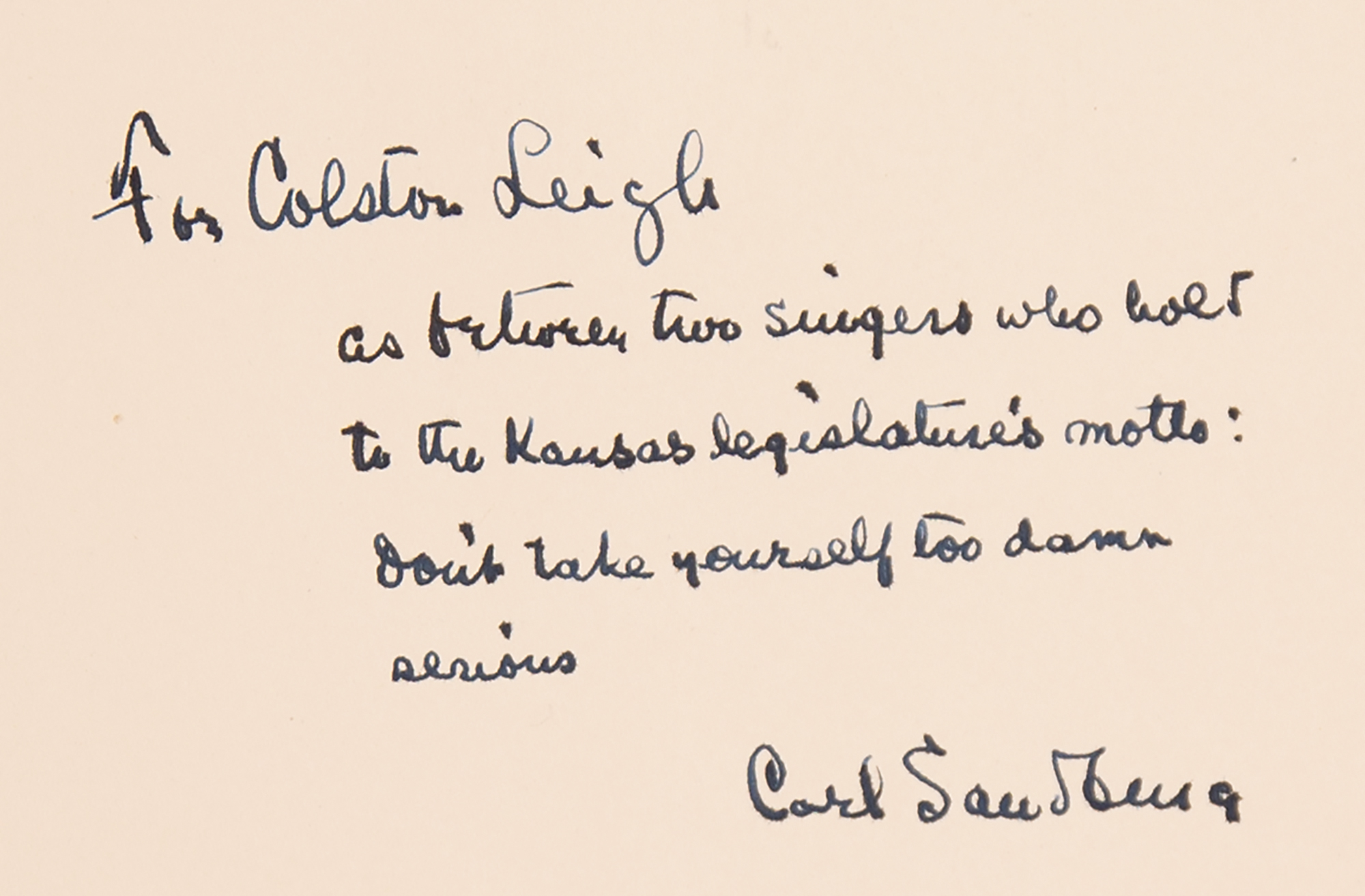 Signed book: The American Songbag. First edition. NY: Harcourt, Brace & Company, 1927. Hardcover with dust jacket, 8 x 10.75, 495 pages. Signed and inscribed on the half-title page in fountain pen, "For Colston Leigh, as between two singers who hold to the Kansas legislature's motto: Don't take yourself too damn serious, Carl Sandburg." In fine condition, with light sunning, and a small library sticker, to the dust jacket spine.