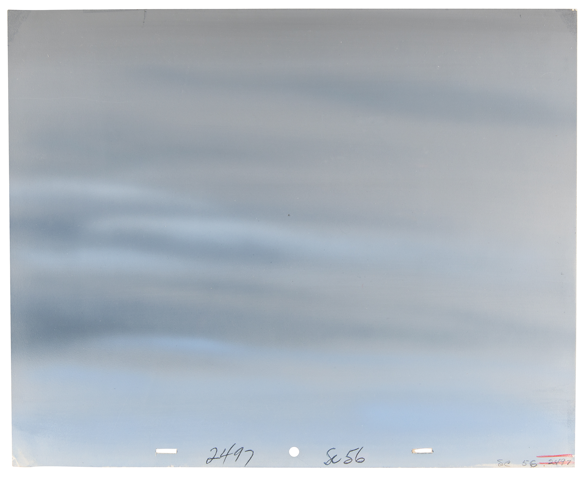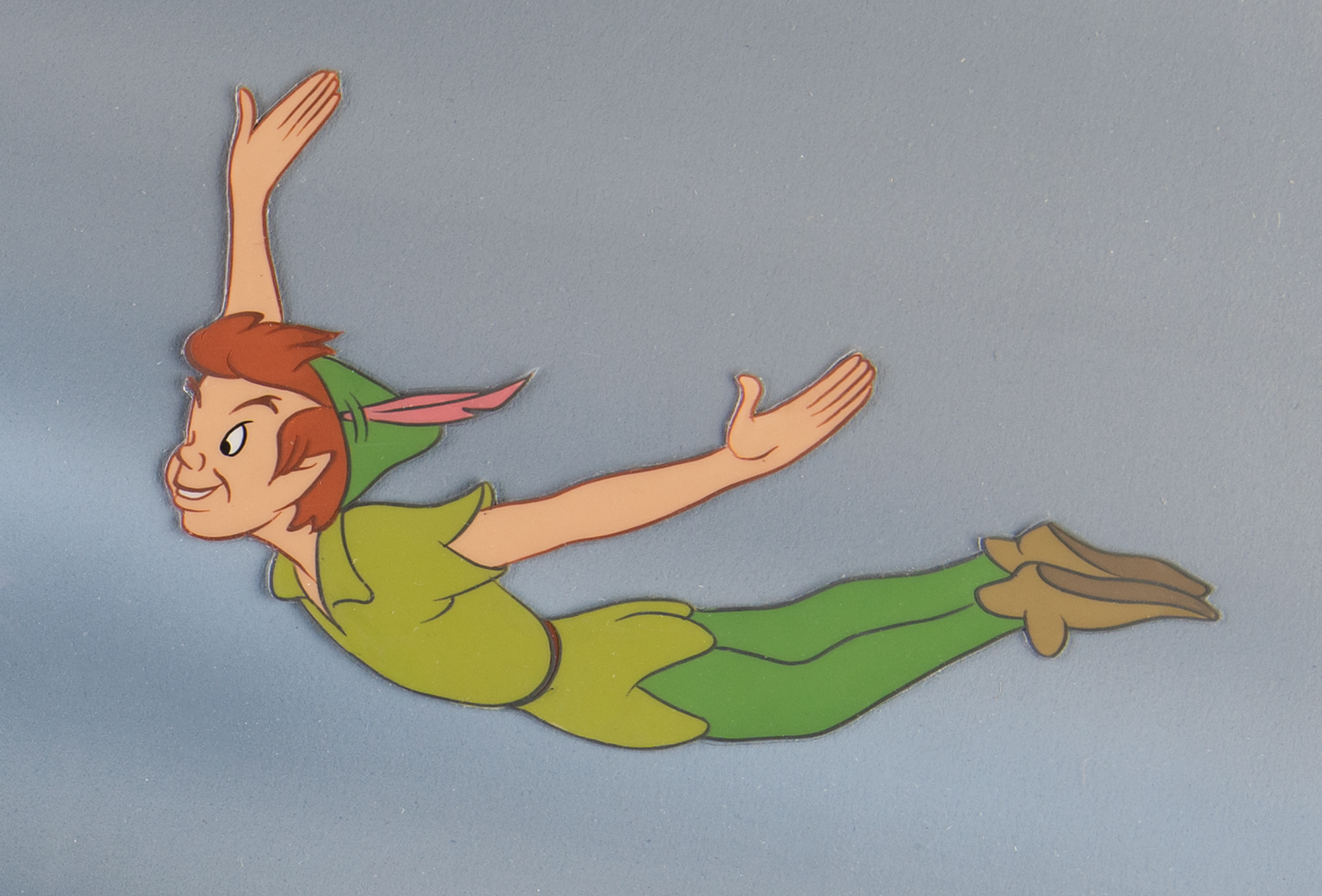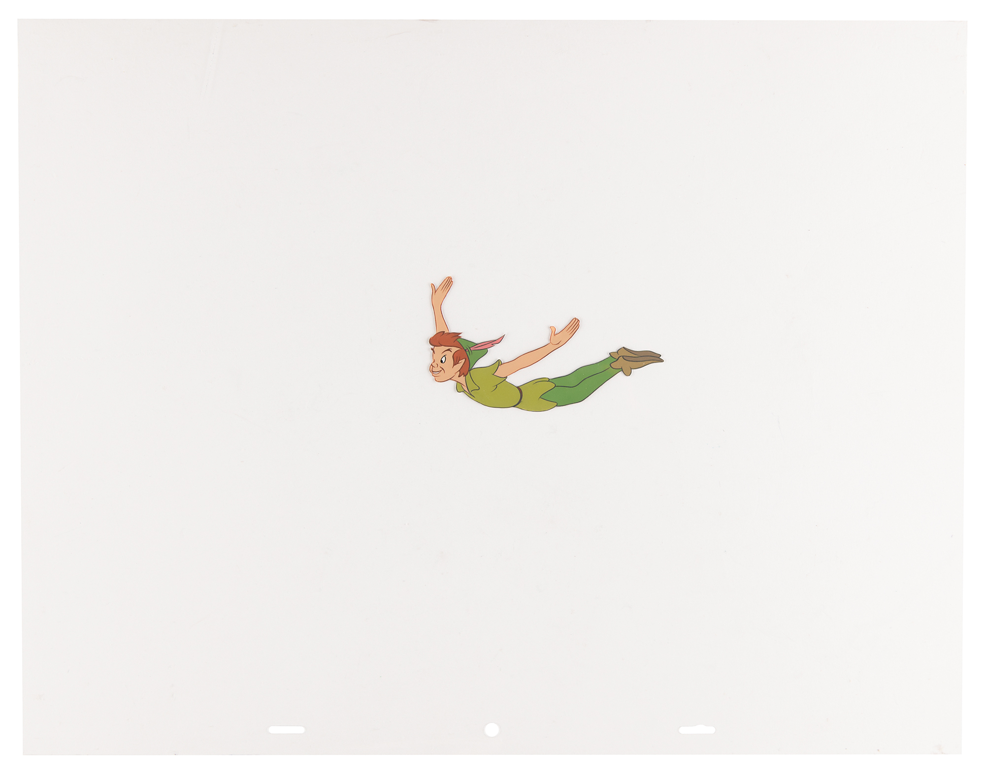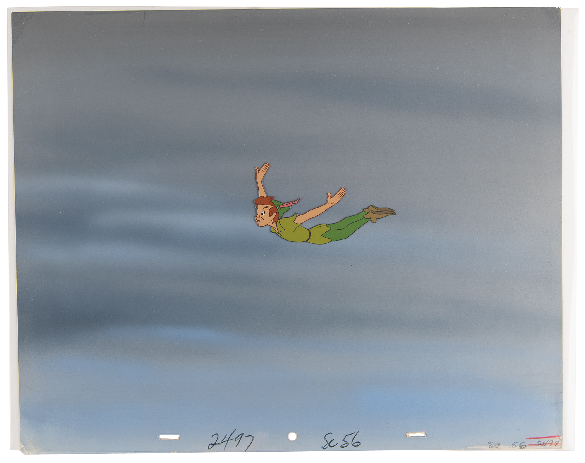 (Walt Disney Studios, 1953) Original production cel and production background from Peter Pan, which consists of a wonderful full-figure cel of Peter Pan happily flying through the air with his arms spread wide. The cel has been trimmed to form and applied to another cel, which is presented over a hand-painted production background of an overcast sky; the bottom edge of the background is marked as “2497, SC56.” The Pan image measures 4 x 2.5, with overall dimensions of 16 x 12.5. In fine condition.