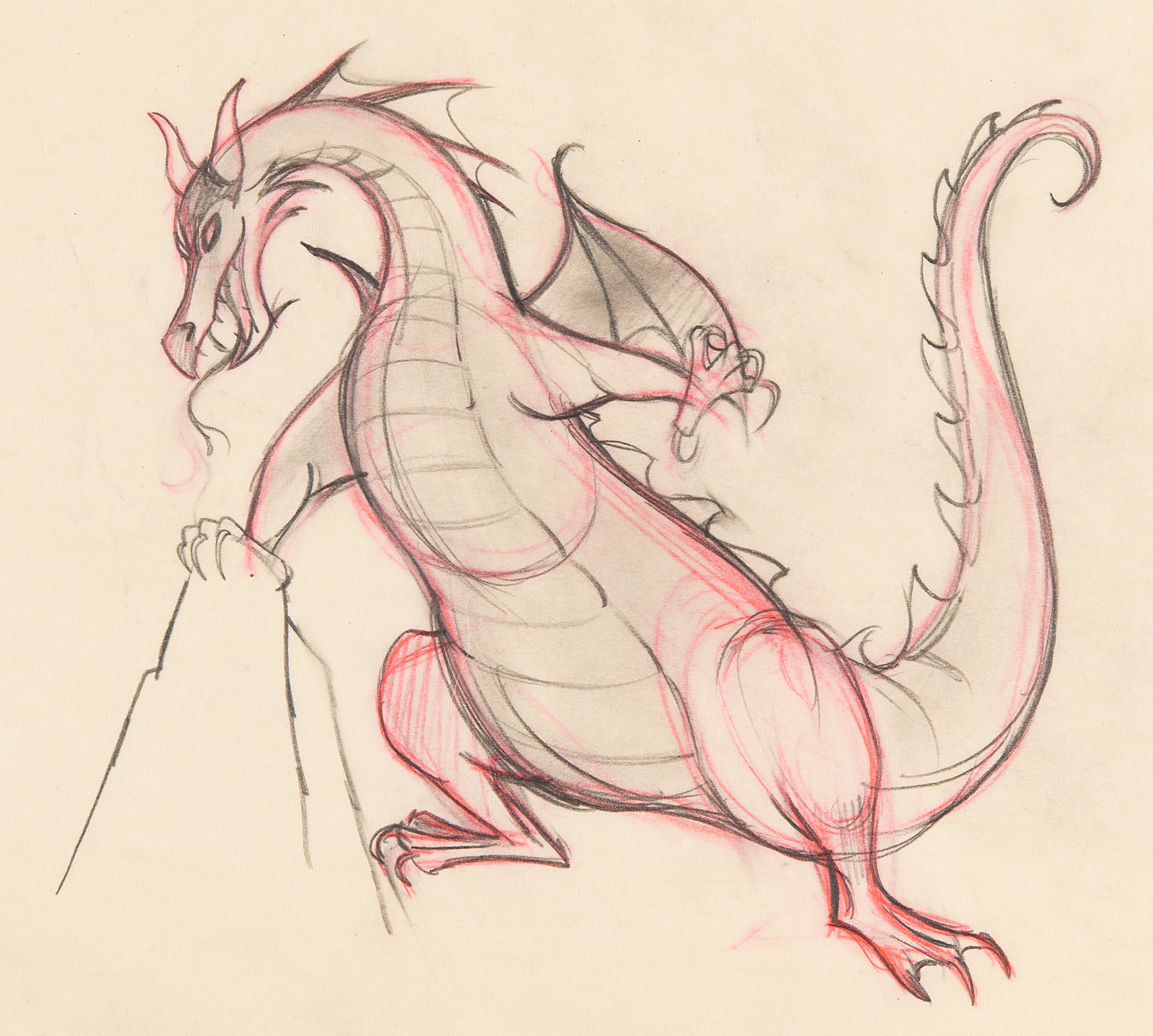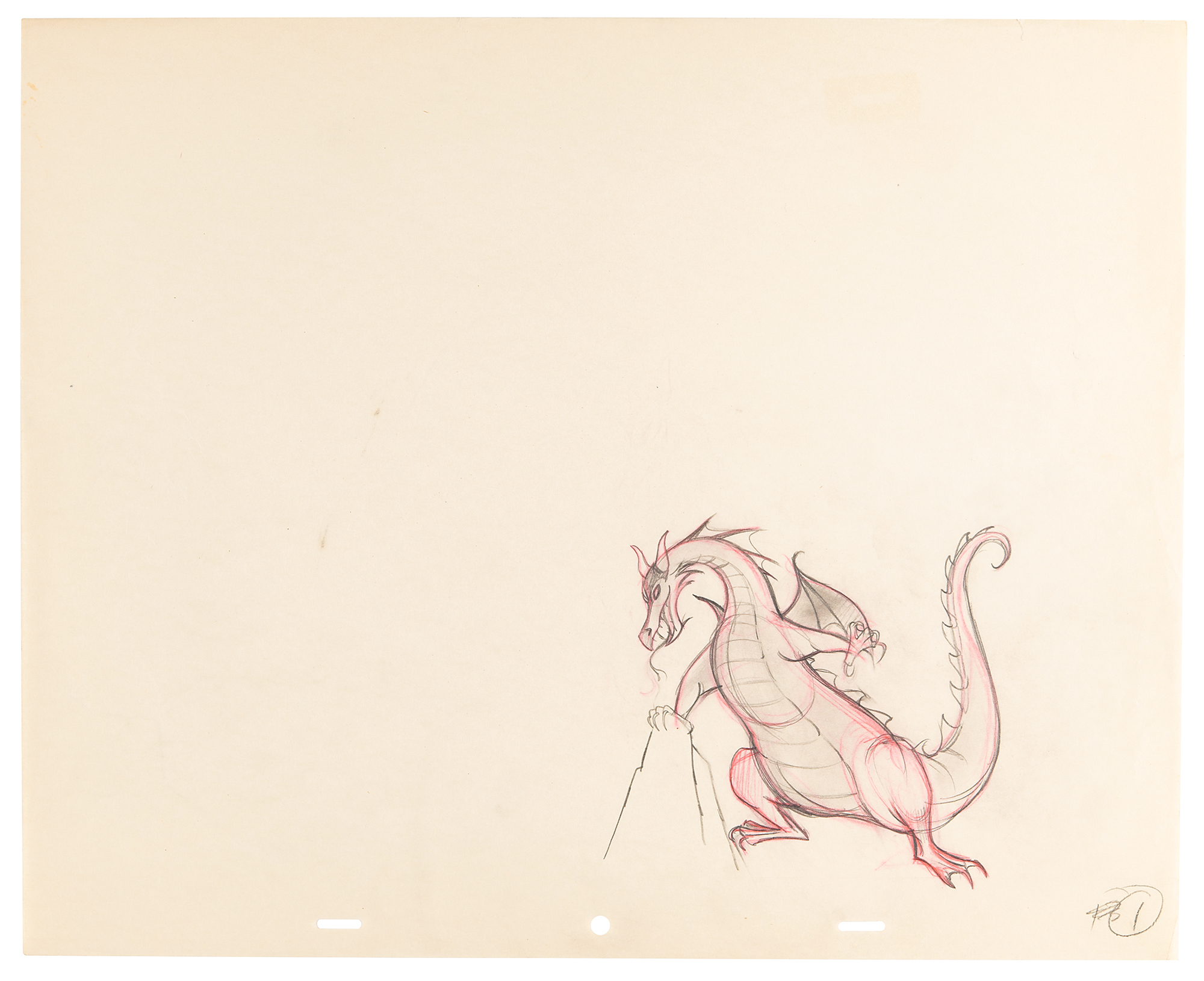 (Walt Disney Studios, 1959) Original production drawing featuring Maleficent from Sleeping Beauty, portraying the evil horned dragon in a ferocious full-bodied pose. Accomplished in graphite and colored pencil on untrimmed 15.5 x 12.5 animation paper, marked "1" in the lower right corner. Image measures 5 x 5. In fine condition.