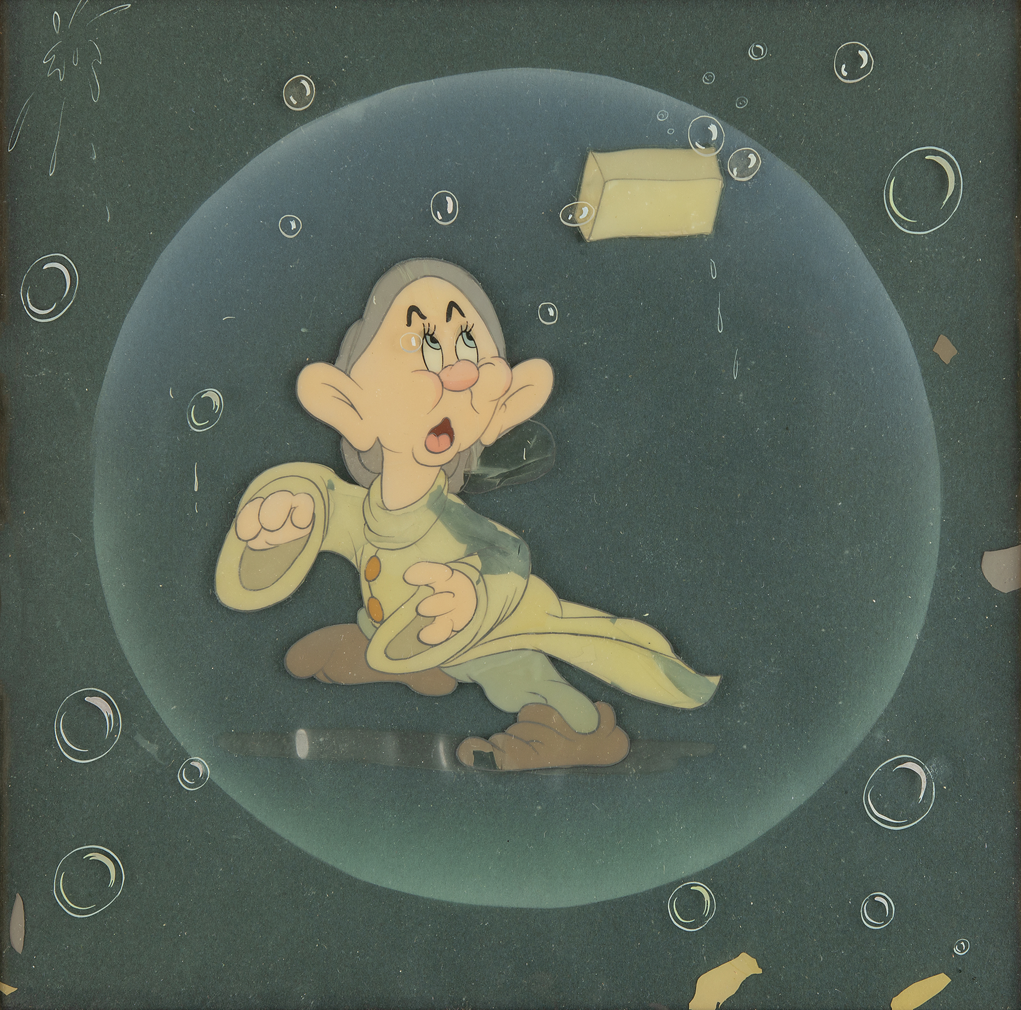 (Walt Disney Studios, 1937) Original production cels and production drawing of Dopey from Snow White and the Seven Dwarfs, displayed with a fountain pen signature, "Walt Disney," on an off-white 3.5 x 1 card. The cels, which depict the youngest dwarf and a floating bar of soap encapsulated in a large bubble, have been trimmed and applied to an airbrushed background as prepared by Courvoisier Galleries for sale. Total cel image measures 4.25 x 5, with a mat opening of 8.25 x 6.25. The production drawing, accomplished in graphite and colored pencil on off-white 5 x 6.25 animation paper, shows Dopey in a great standing pose with open mouth and wide eyes. The cels, drawing, and signature are cloth-matted and framed together to an overall size of 23.75 x 17.5. In overall fine condition. An exceptional display piece honoring a beloved Snow White dwarf and the man behind the mouse.