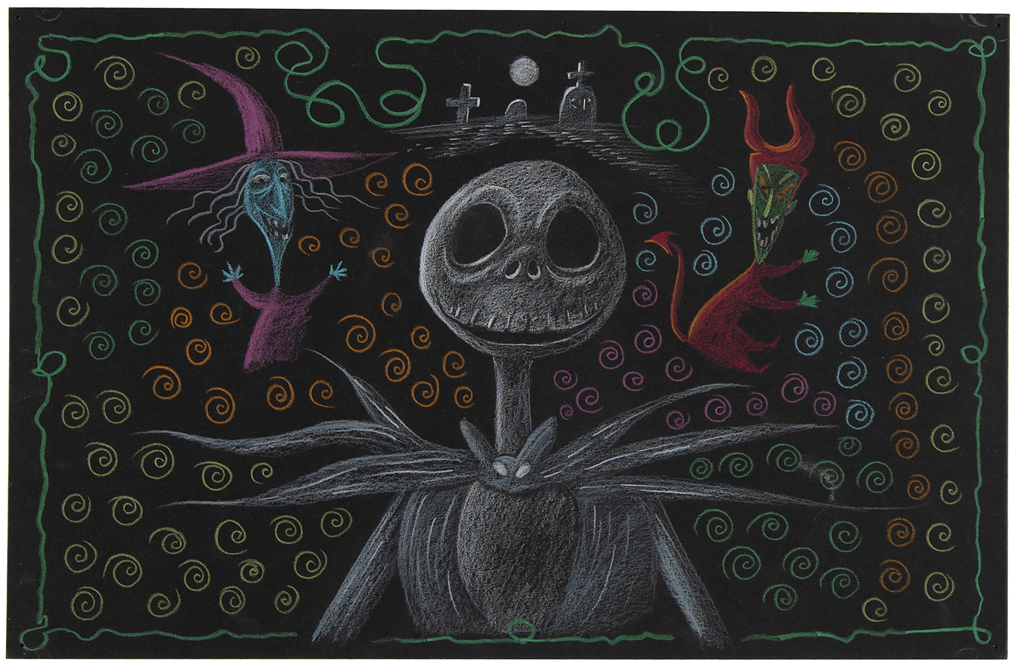 (Walt Disney Studios, 1993) Original storyboard concept drawing of Jack Skellington, Lock, and Shock from Tim Burton's animated dark fantasy The Nightmare Before Christmas, showing Skellington in a wonderful close-up pose, images of Lock and Shock, the pint-sized henchmen of Oogie Boogie, to either side, and a moonlit cemetery to the upper background. Accomplished in pastel and colored pencil on black 12.25 x 8 artist's board. In fine condition. A detailed portrait of Halloweentown’s most famous resident, made all the more exciting by the mischievous presence of Lock and Shock.