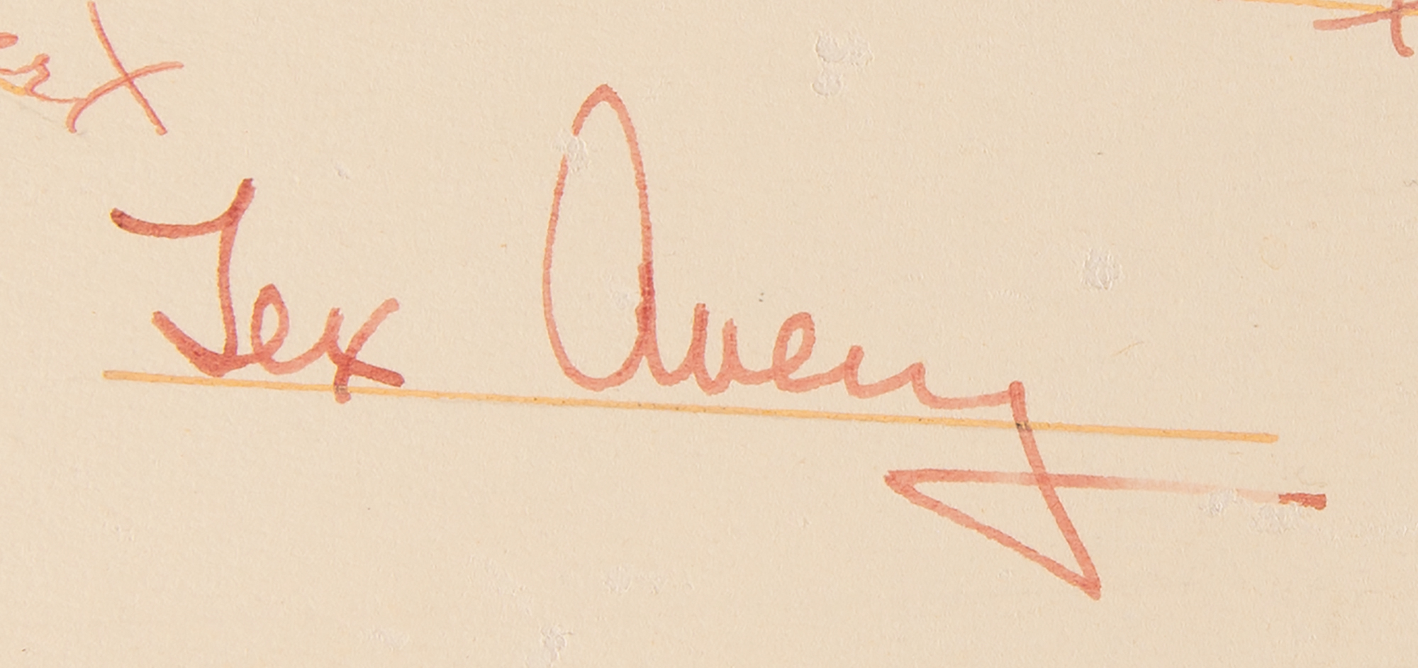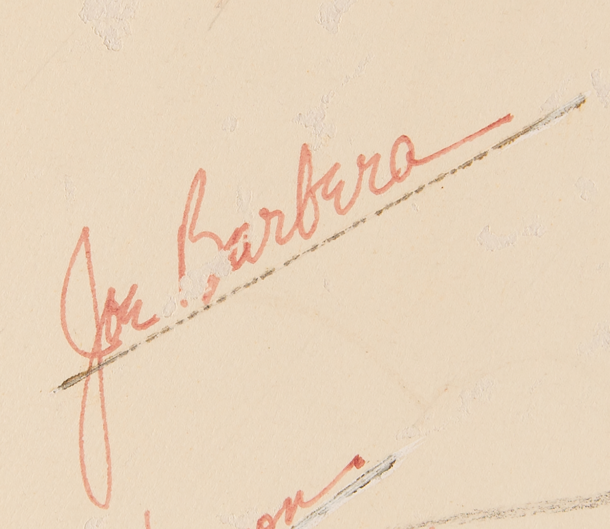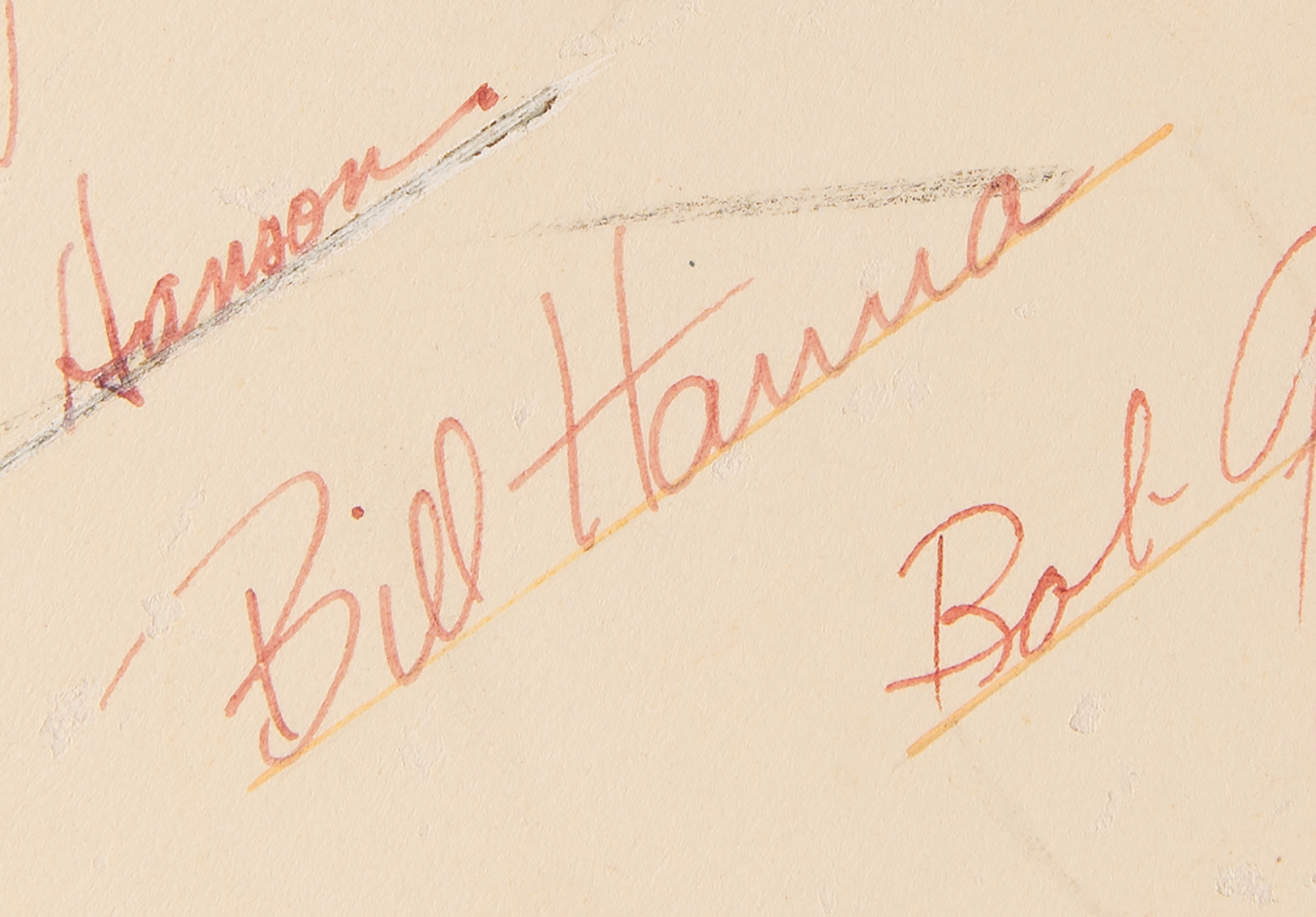 Massive original custom-made Christmas card presented to animation legend Fred Quimby by the MGM Studio animation department in 1951. The card, which is matted to an overall size of 27 x 34.5, features a wonderful yuletide scene of iconic cartoon characters Tom and Jerry singing Christmas carols outside the front of a house, which features a Christmas wreath, brick steps, twin bushes with lightbulbs, a yard lamp with candle, and the house’s address number,” 623,” which matches Quimby’s home address of 623 North Beverly Drive in Beverly Hills, California. The artwork is accomplished in mixed media, although the majority is watercolor, and the bottom section features the signatures of 76 MGM employees, a group highlighted by animation figures and artists like Bill Hanna, Joe Barbera, Tex Avery, Ken Muse, Irv Spence, Ray Patterson, and more. The central portion bears a hand-drawn card with a calligraphic sentiment, “1951, To a swell boss – With sincere good wishes for a Merry Christmas and a Happy New Year, from The Gang.” In fine condition.