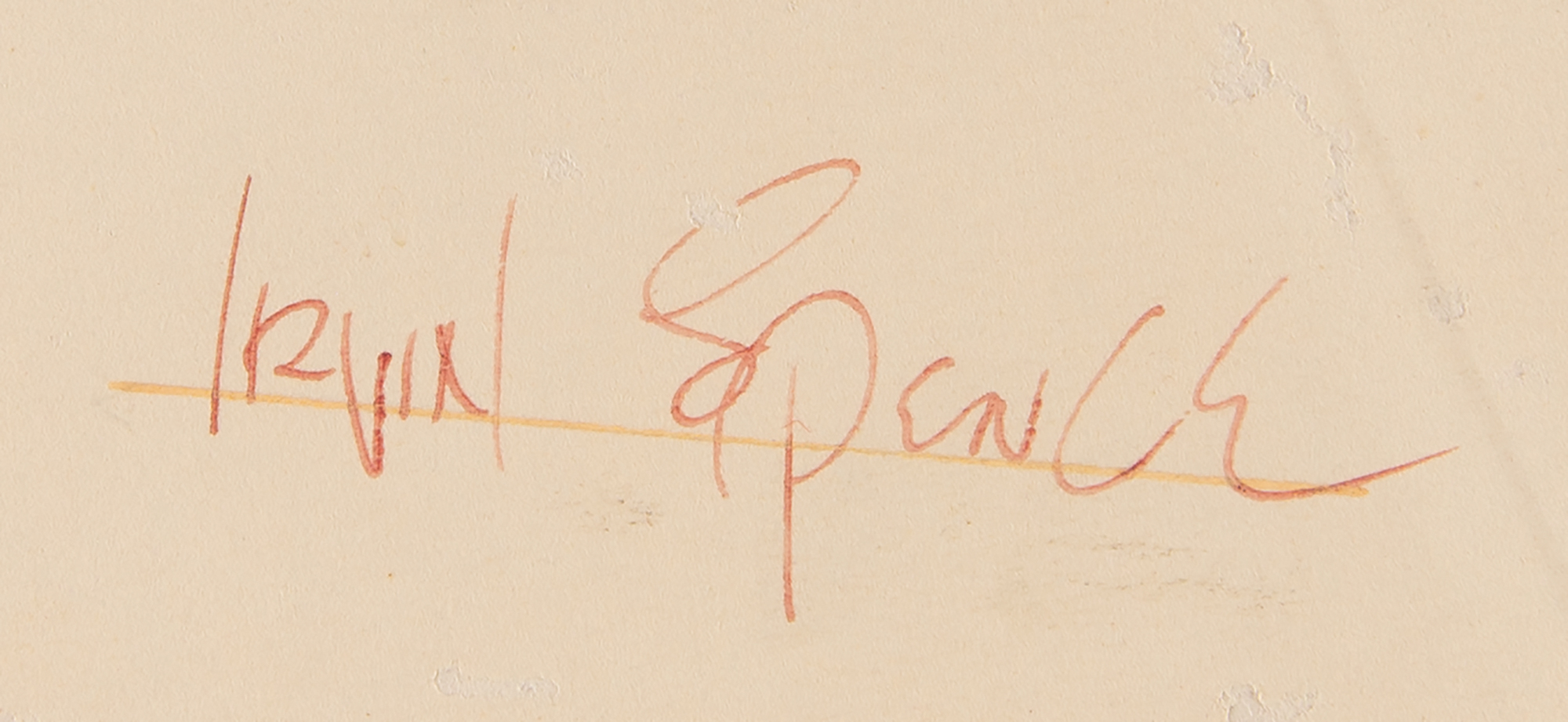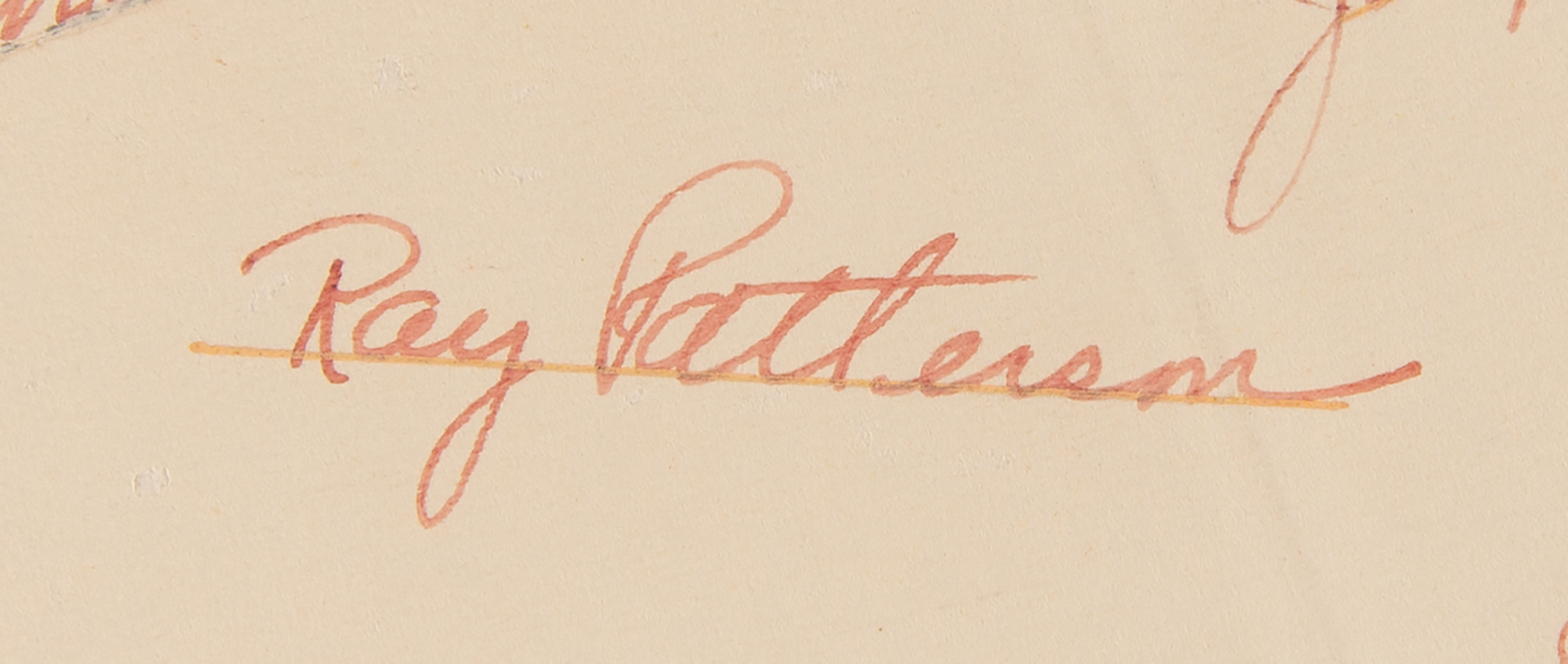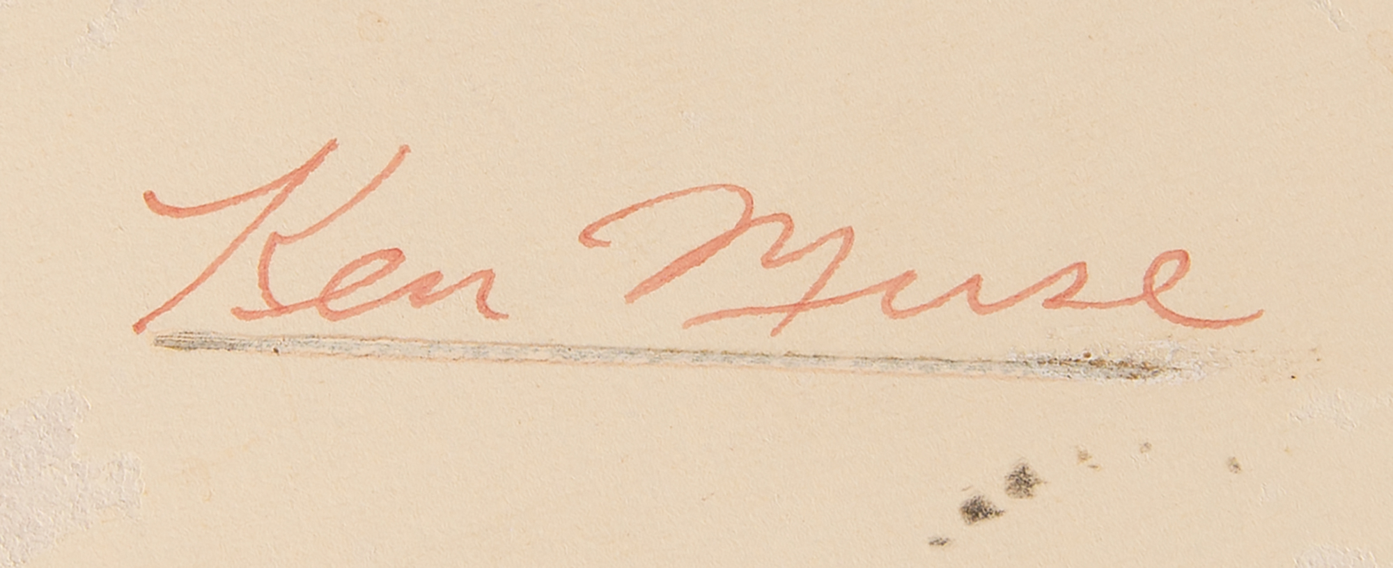 Massive original custom-made Christmas card presented to animation legend Fred Quimby by the MGM Studio animation department in 1951. The card, which is matted to an overall size of 27 x 34.5, features a wonderful yuletide scene of iconic cartoon characters Tom and Jerry singing Christmas carols outside the front of a house, which features a Christmas wreath, brick steps, twin bushes with lightbulbs, a yard lamp with candle, and the house’s address number,” 623,” which matches Quimby’s home address of 623 North Beverly Drive in Beverly Hills, California. The artwork is accomplished in mixed media, although the majority is watercolor, and the bottom section features the signatures of 76 MGM employees, a group highlighted by animation figures and artists like Bill Hanna, Joe Barbera, Tex Avery, Ken Muse, Irv Spence, Ray Patterson, and more. The central portion bears a hand-drawn card with a calligraphic sentiment, “1951, To a swell boss – With sincere good wishes for a Merry Christmas and a Happy New Year, from The Gang.” In fine condition.