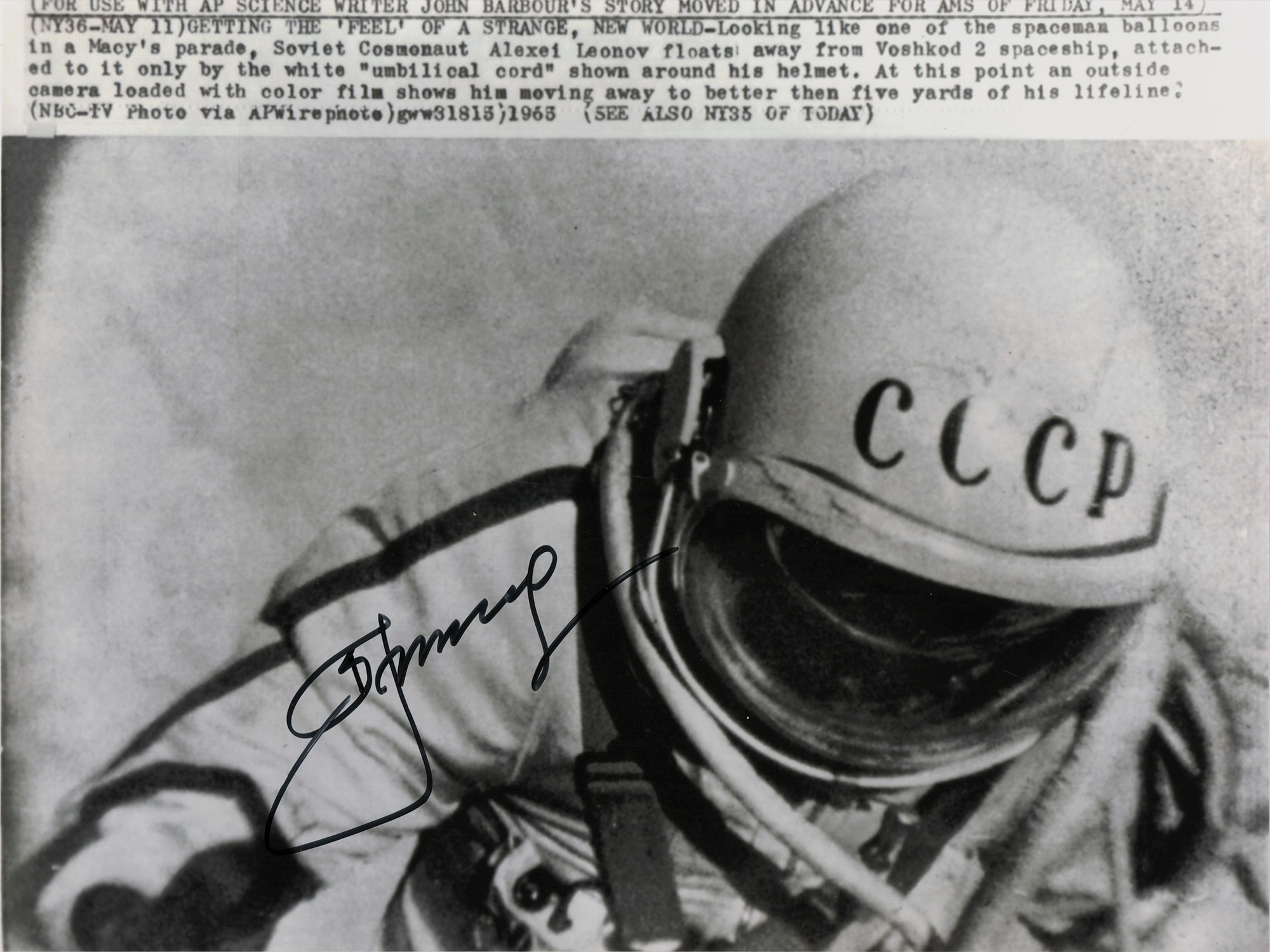 Glossy 10.75 x 8 photo of Alexei Leonov conducting mankind's first-ever spacewalk in 1965, signed in black felt tip. A typed press caption is inherent to the reprinted image. In very fine condition.