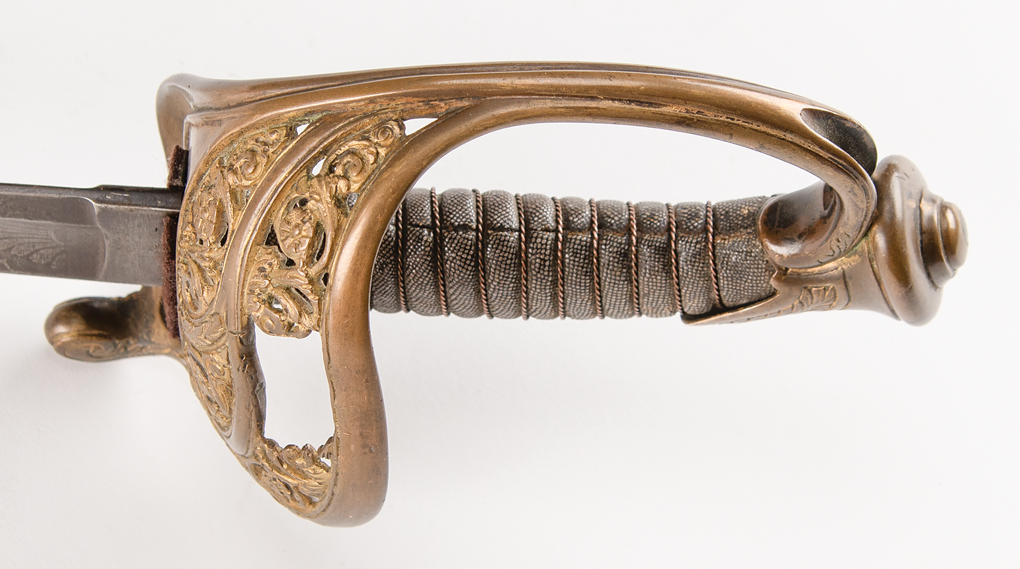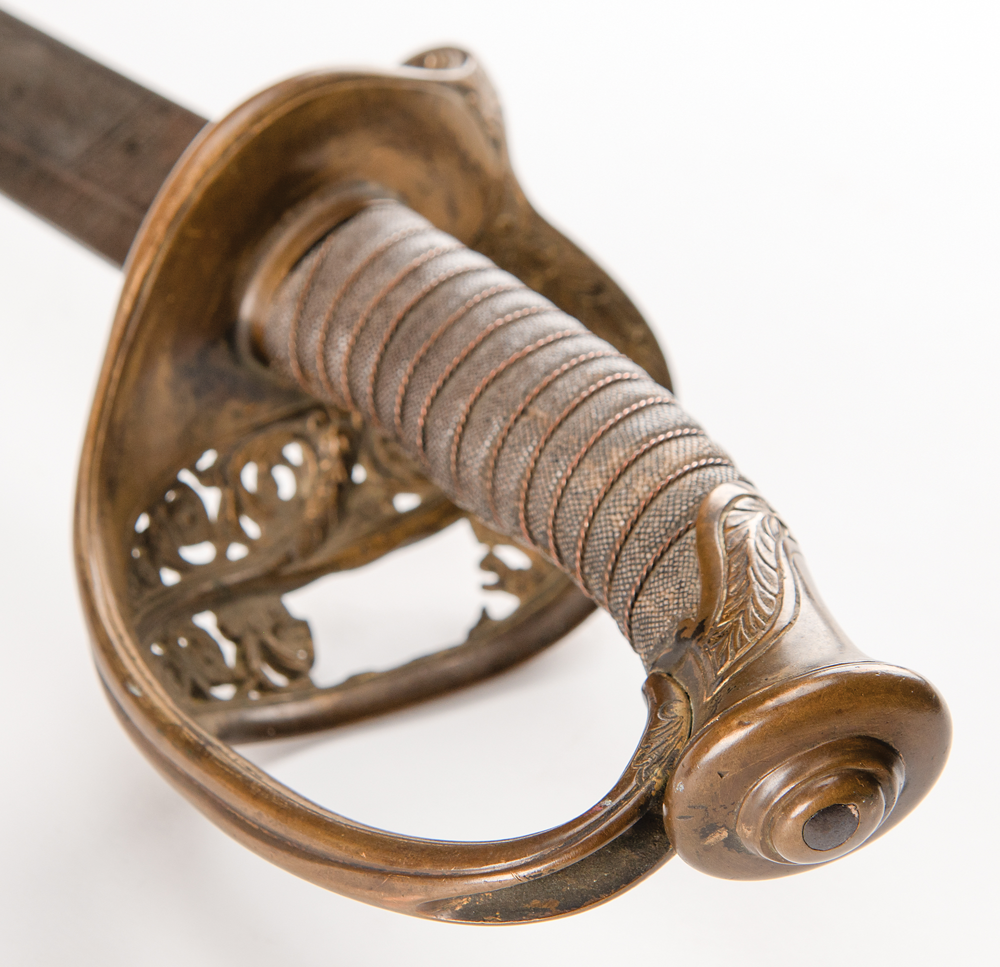 Civil War-Era Model 1850 Staff and Field Officer's Sword, measuring 39 1/4" overall, with a 33 1/8" slightly curved blade having both wide and narrow fullers and etched panels on the forte along both sides. The blade is not maker marked and has an overall dark gray patina with spots of dark freckling along both faces, especially towards the tip, The etched panels depict an American Eagle with "E PLURIBUS UNUM" riband with sunburst and filigree on the obverse, and "U.S." with martial panoply on the reverse. The etching is still clear and well-defined, but the blade was sharpened at some point which removed the etching along the blade edge, The brass hilt is of standard pattern and has a pierced counterguard with single forward-swept quillon, dark gray shagreen grip with intact braided wire wrap, and a Phrygian helmet pommel. The brass has a dull ochre patina with some minor wear along the grip, and the "US" has been pointedly removed from original placement on the outside branch of the counterguard. The steel scabbard has turned to a dark plum-brown over time and the brass hanger bands and chape have developed an ochre patina that matches that of the hilt furniture.